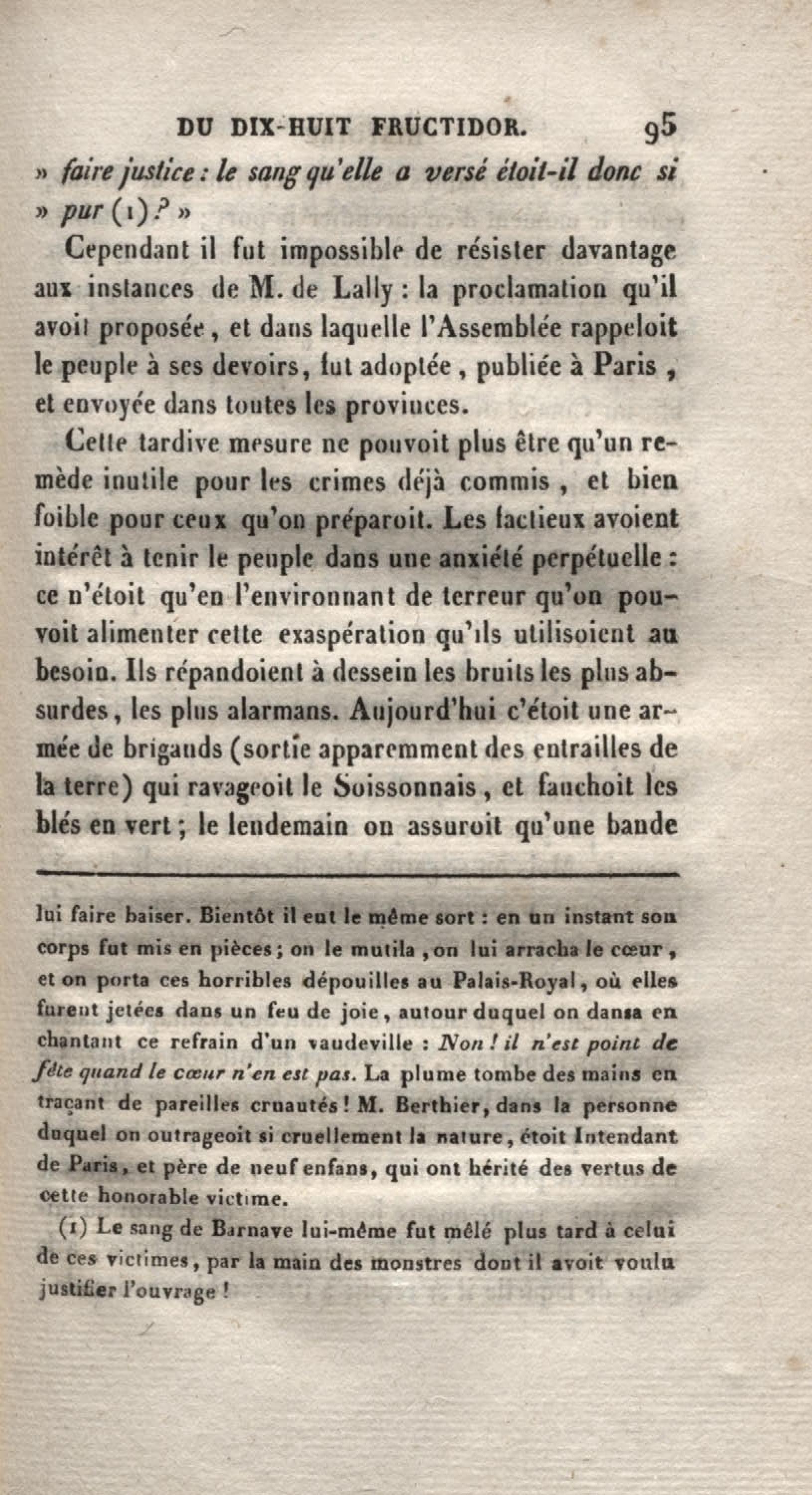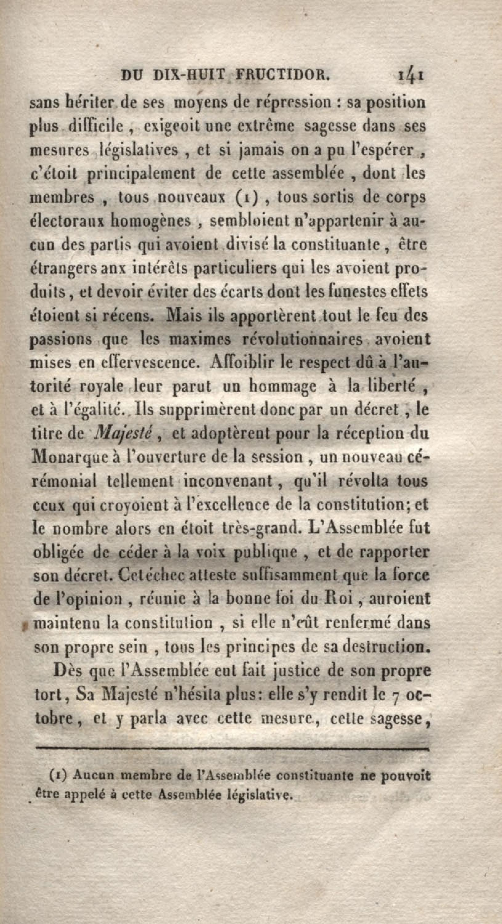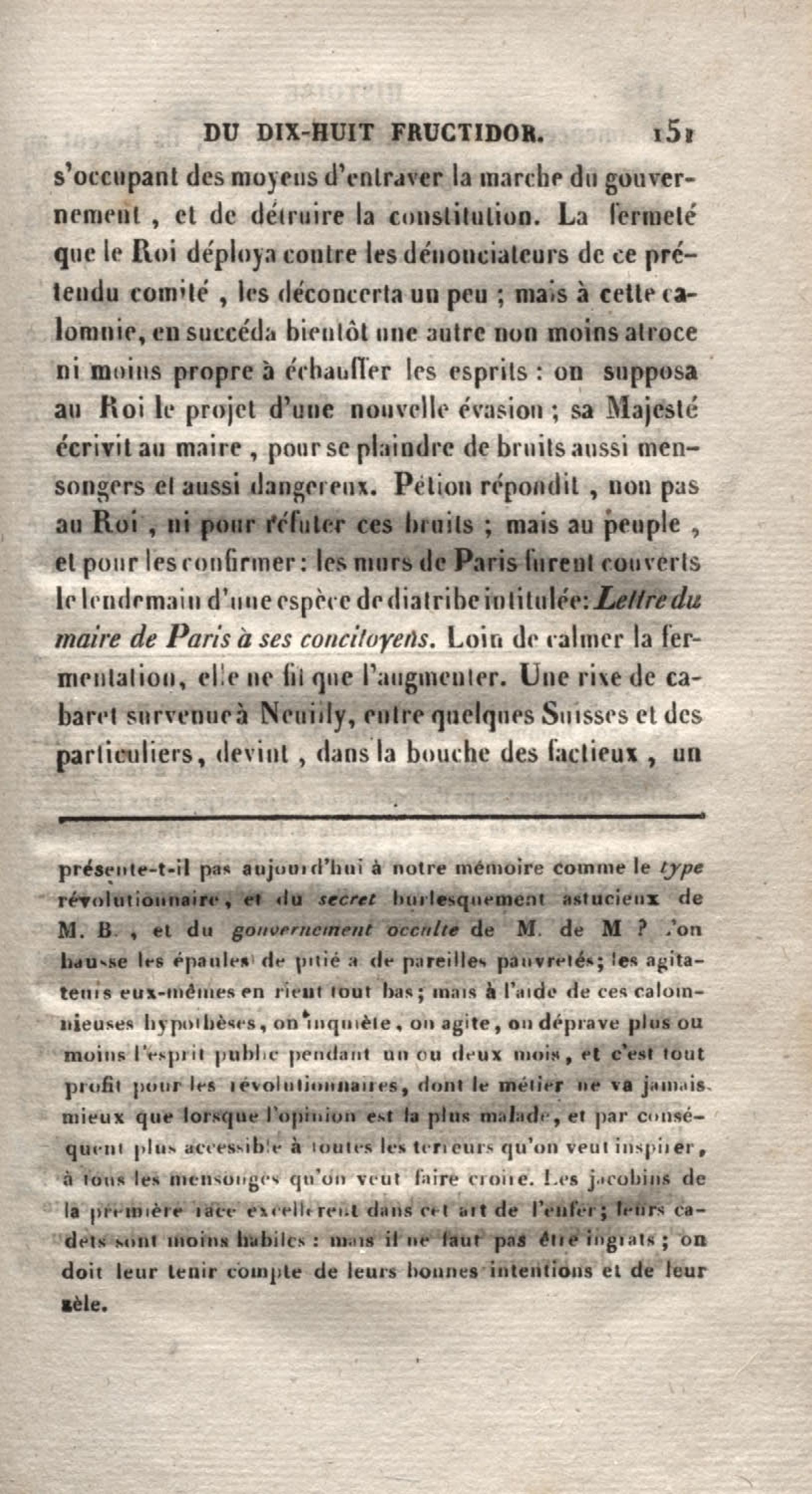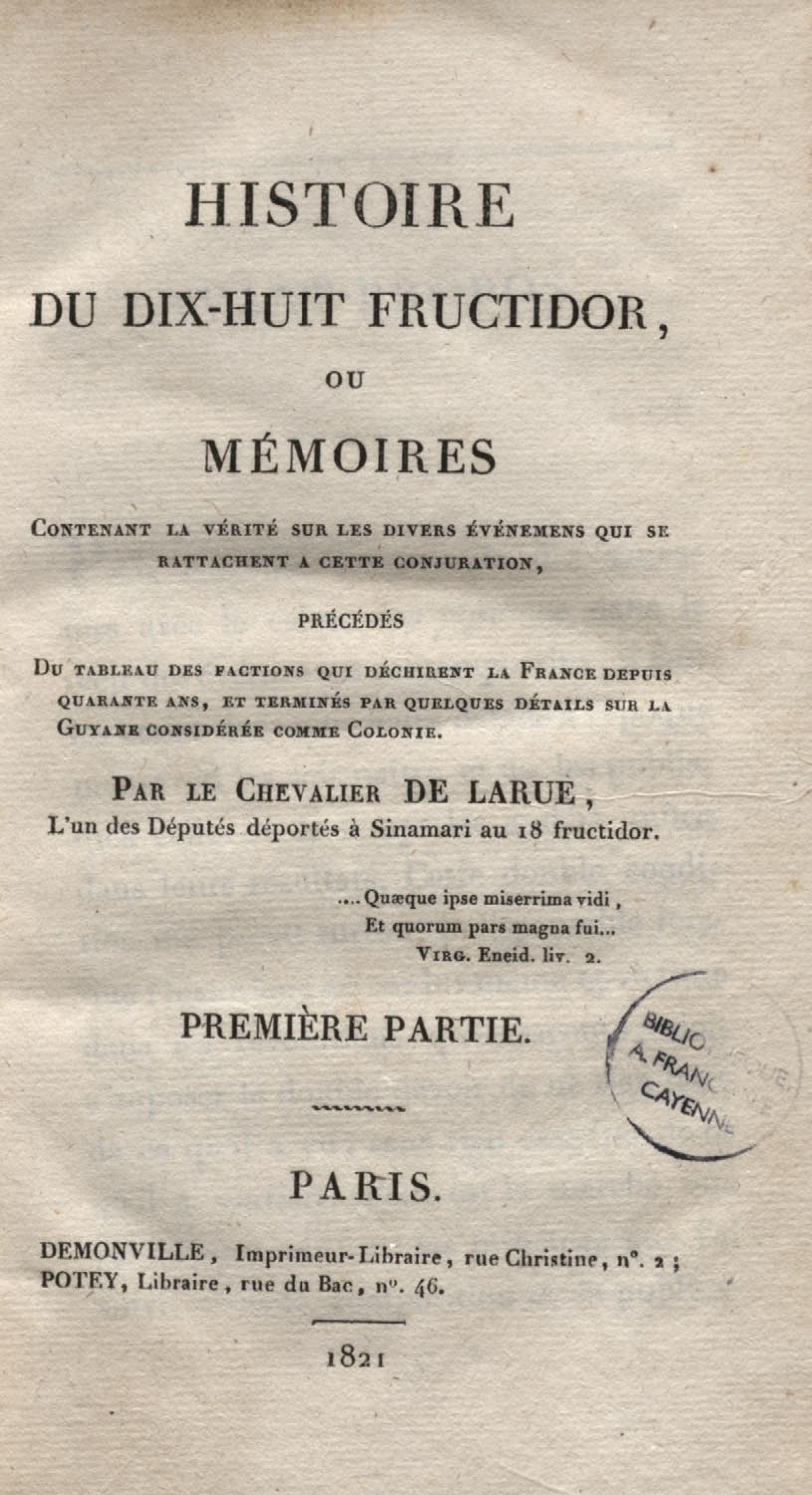 - Histoire du dix-huit fructidor ou Mémoires contenant la vérité sur les divers évènemens qui se rattachent à cette conjuration : précédés du tableau des factions qui déchirent la France depuis quarante ans, et terminés par quelques détails sur la Guyane considérées comme colonie. Première partie