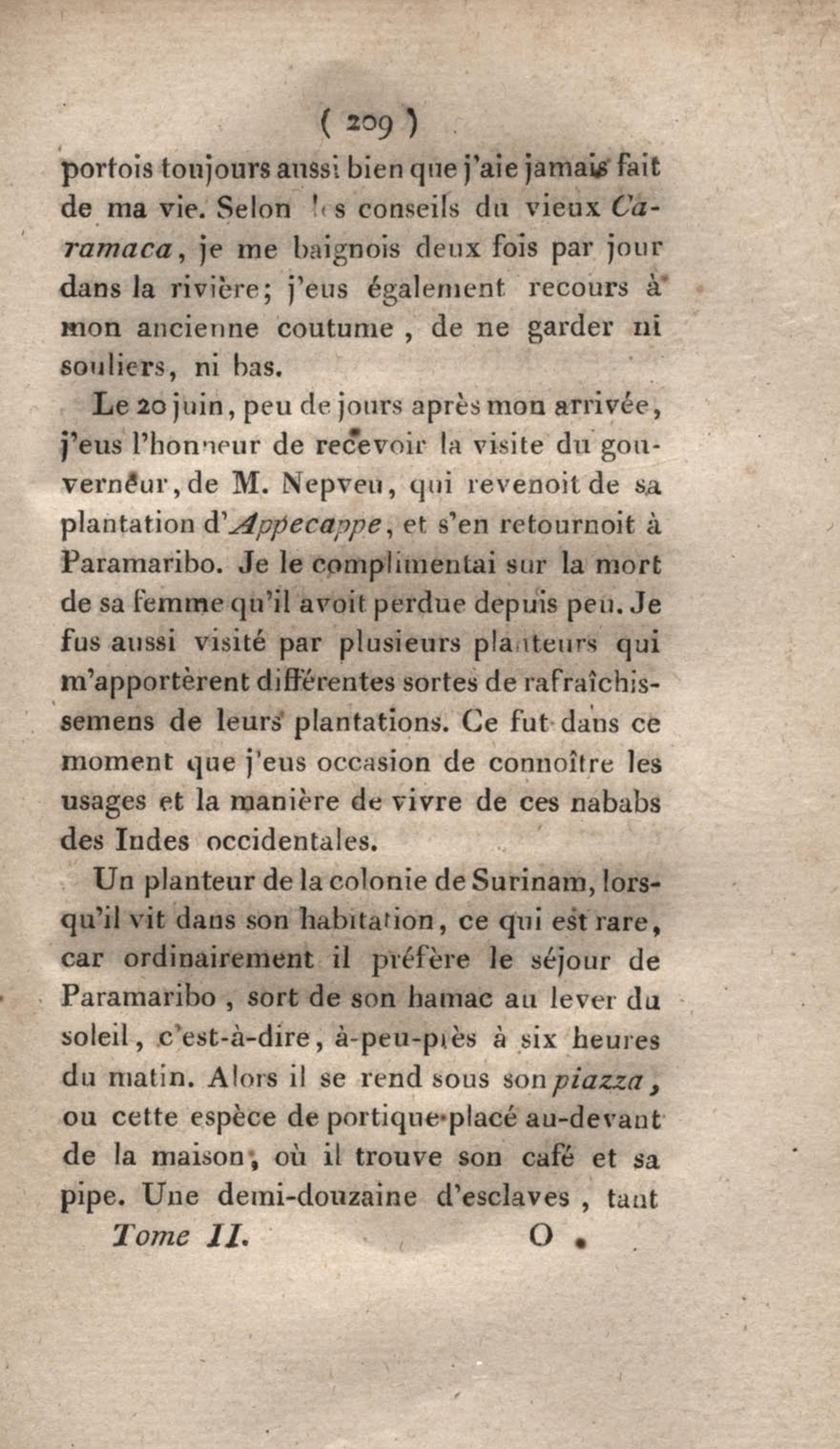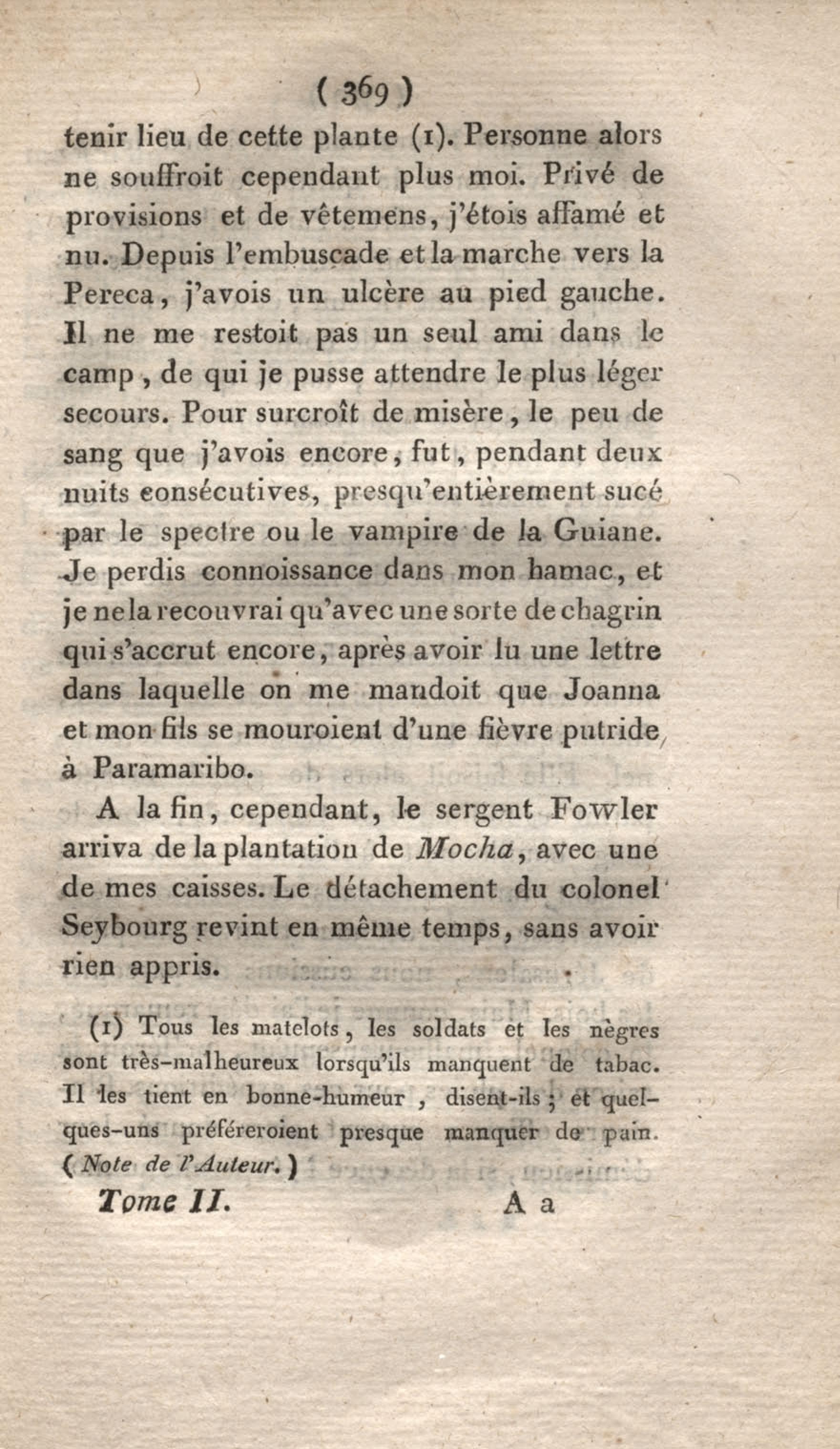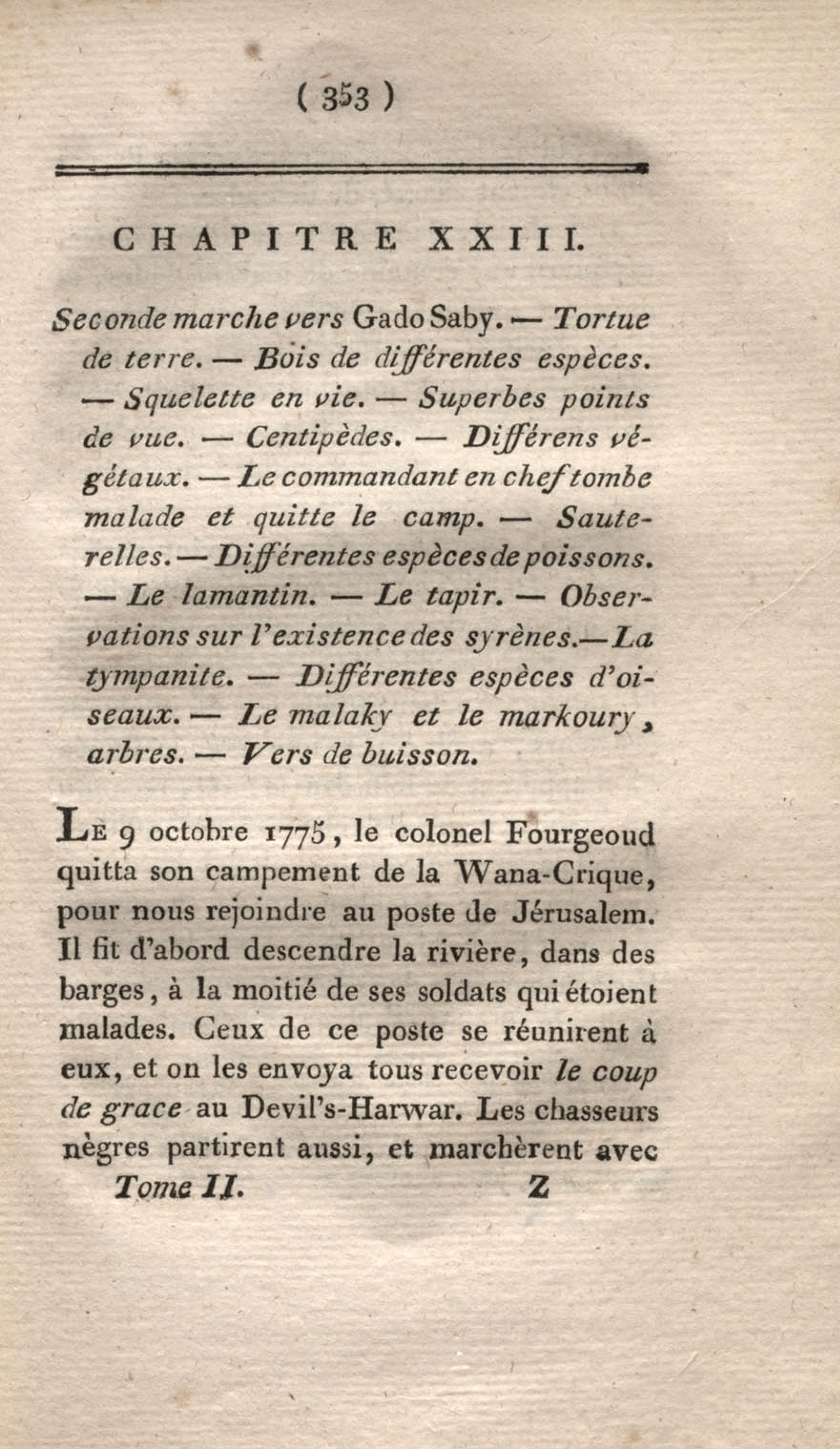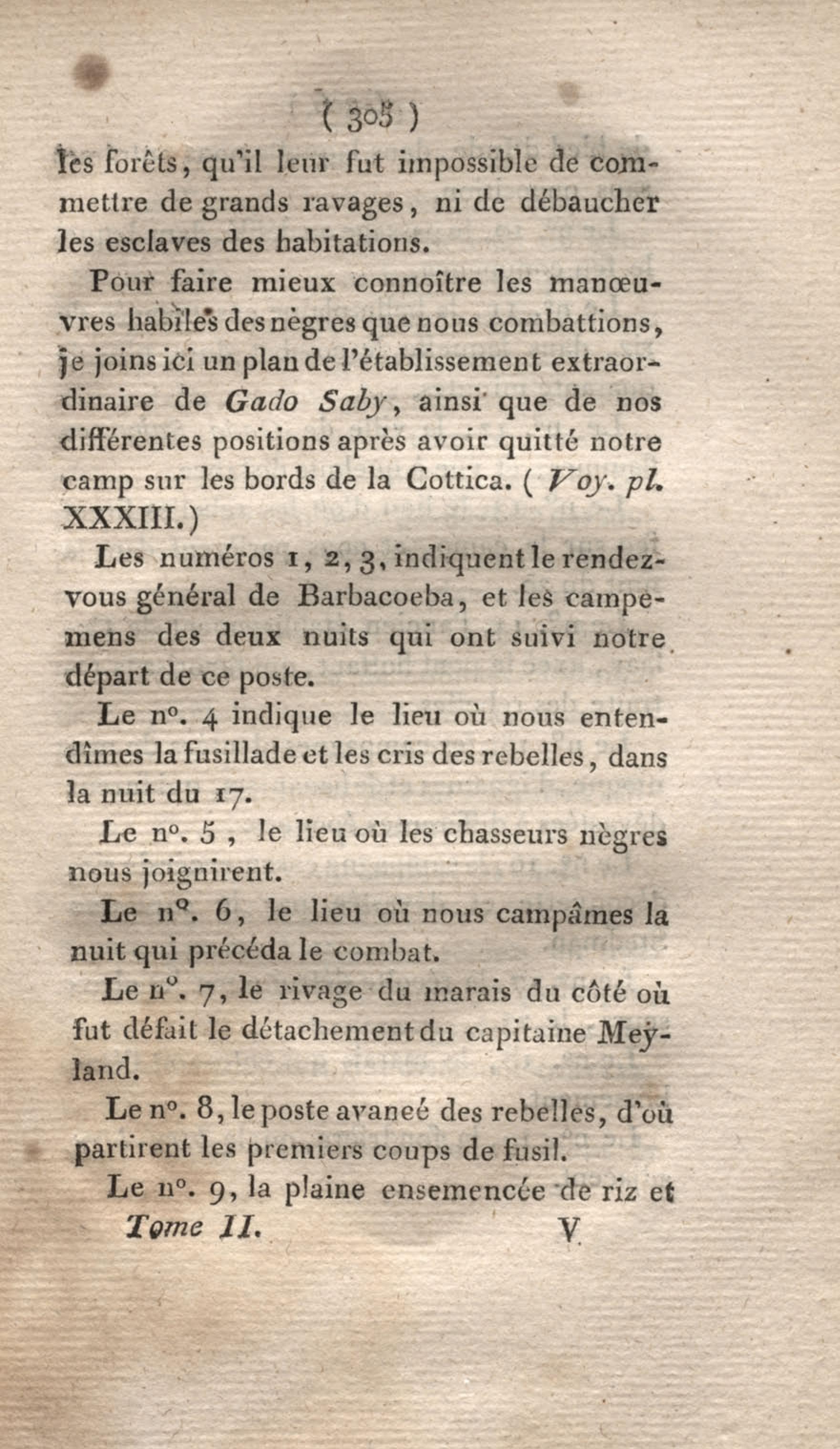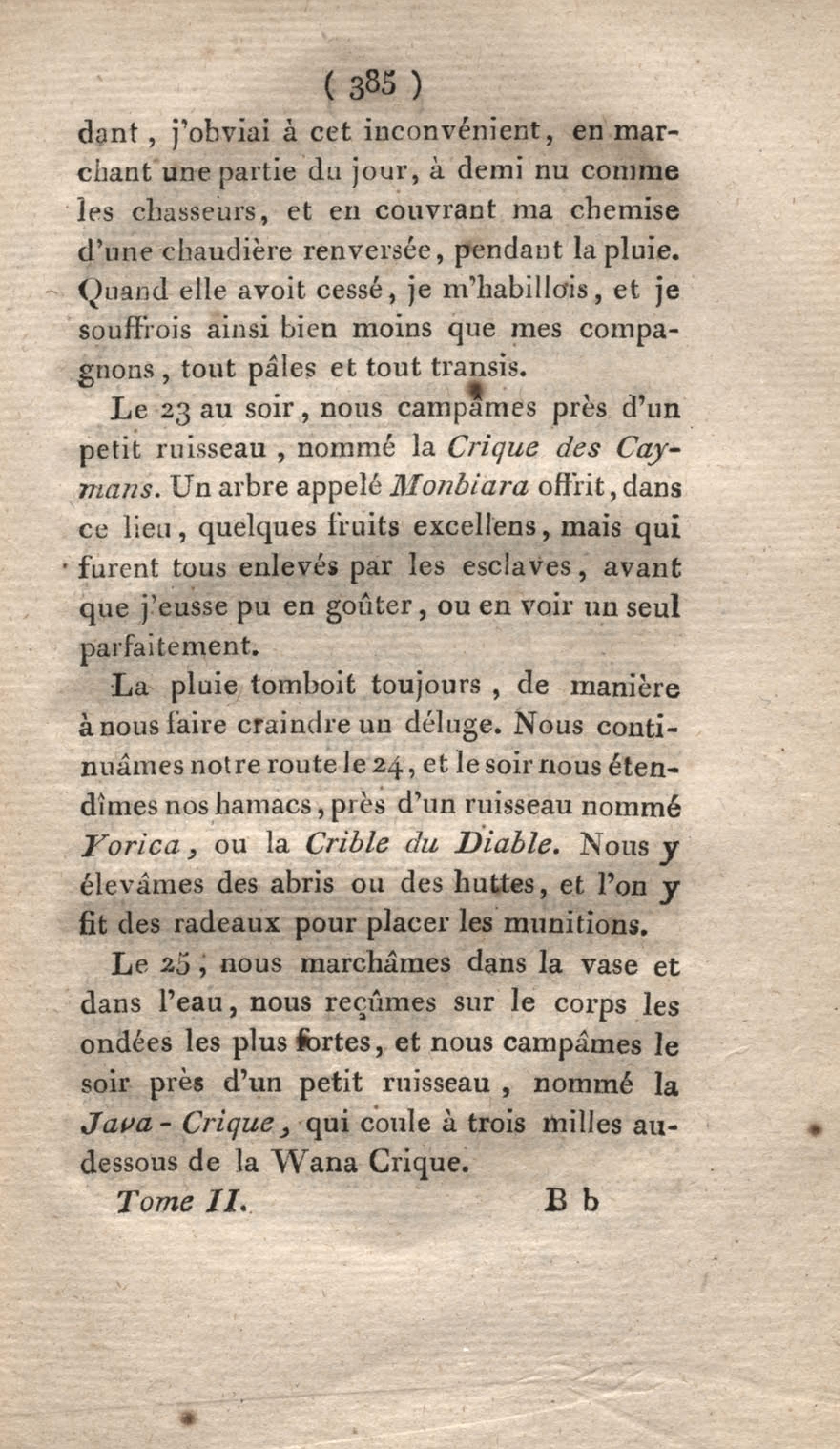 Voyage à Surinam et dans l'intérieur de la Guiane, contenant La Relation de cinq années de courses et d'observations faites dans cette contrée intéressante et peu connue, avec des détails sur les Indiens de la Guiane et les Nègres : suivi du Tableau de la Colonie française de Cayenne. Tome second