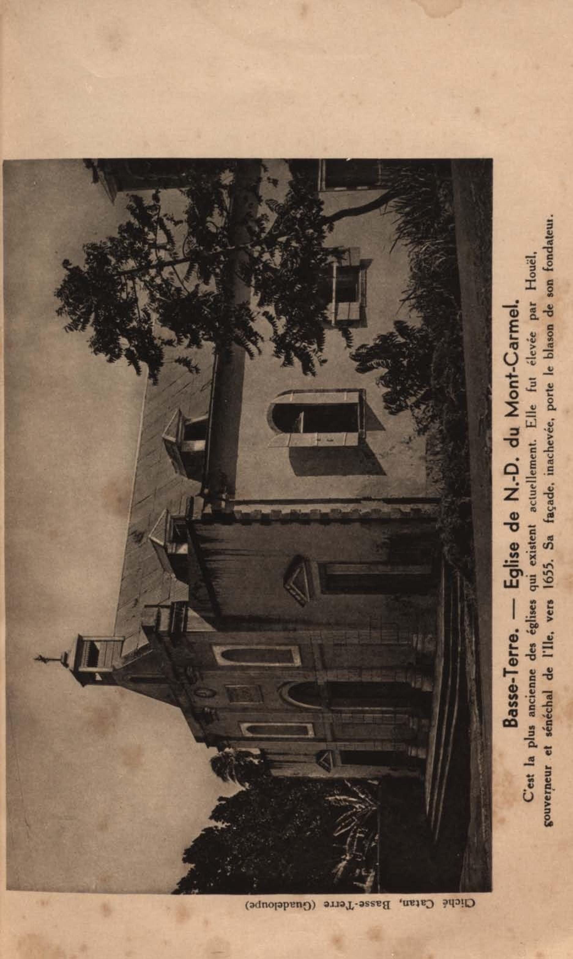 Basse-Terre . - Eglise de N.D. Du Mont-Carmel. C'est la plus ancienne des églises qui existent actuellement. Elle fut élevée par Houël, gouverneur et sénéchal de l'Ile, vers 1655. Sa façade, inachevée, porte le blason de son fondateur