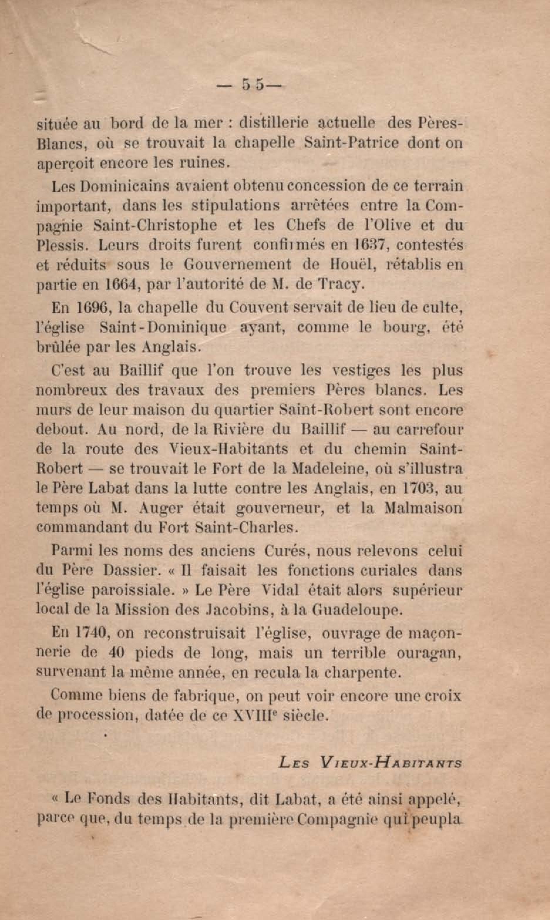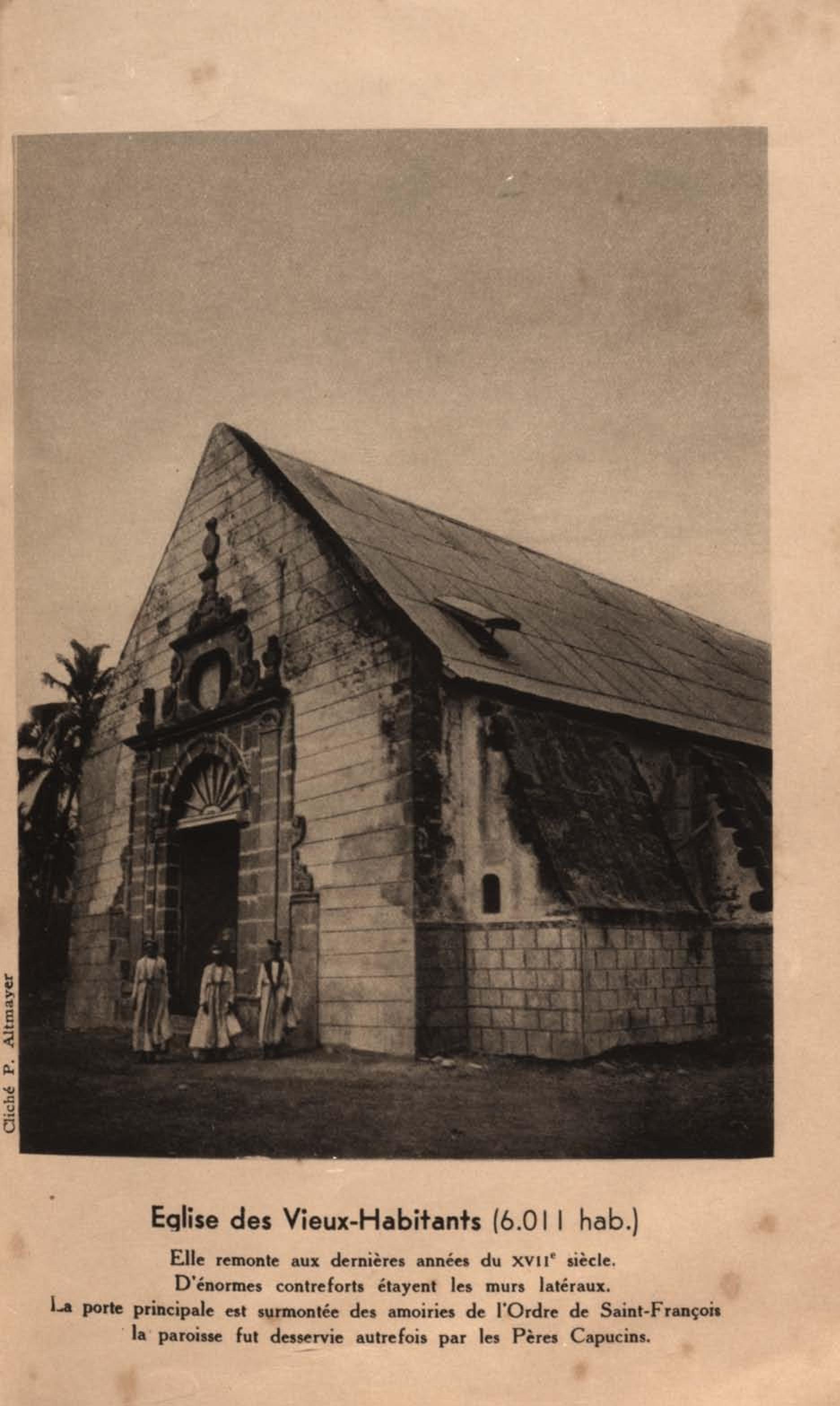 Eglise des Vieux-Habitants ( 6.011 hab ). Elle remonte aux dernières années du XVIIe siècle. D'énormes contreforts étayent les murs latéraux. La porte principale est surmontée des armoiries de l'Ordre de Saint-François, la paroisse fut desservie autrefois par les Pères capucins |