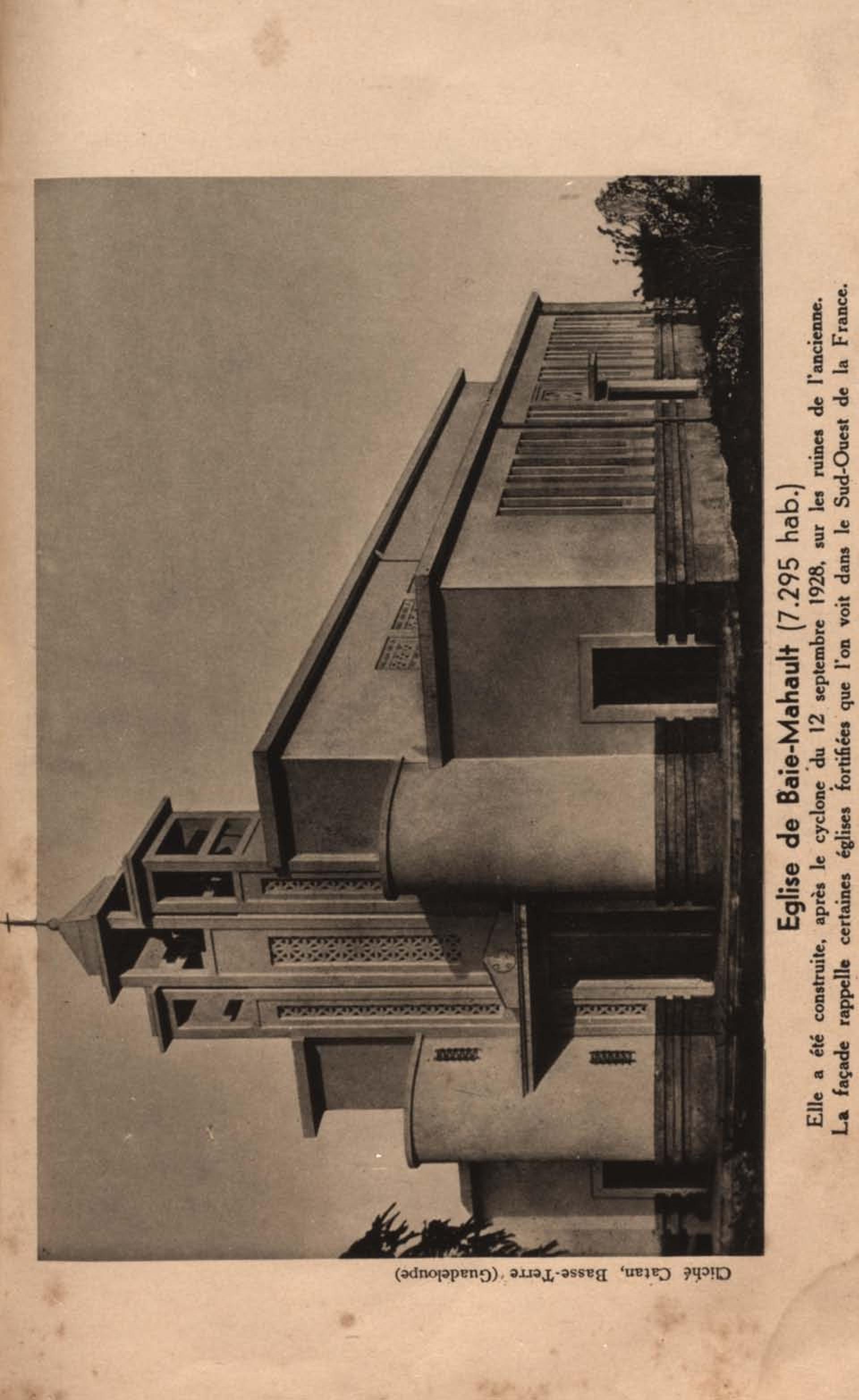 Eglise de Baie-Mahault ( 7.295 hab ). Elle a été construite, après le cyclone du 12 septembre 1928, sur les ruines de l'ancienne. La façade rappelle certaines églises fortifiées que l'on voit dans le Sud-Ouest de la France