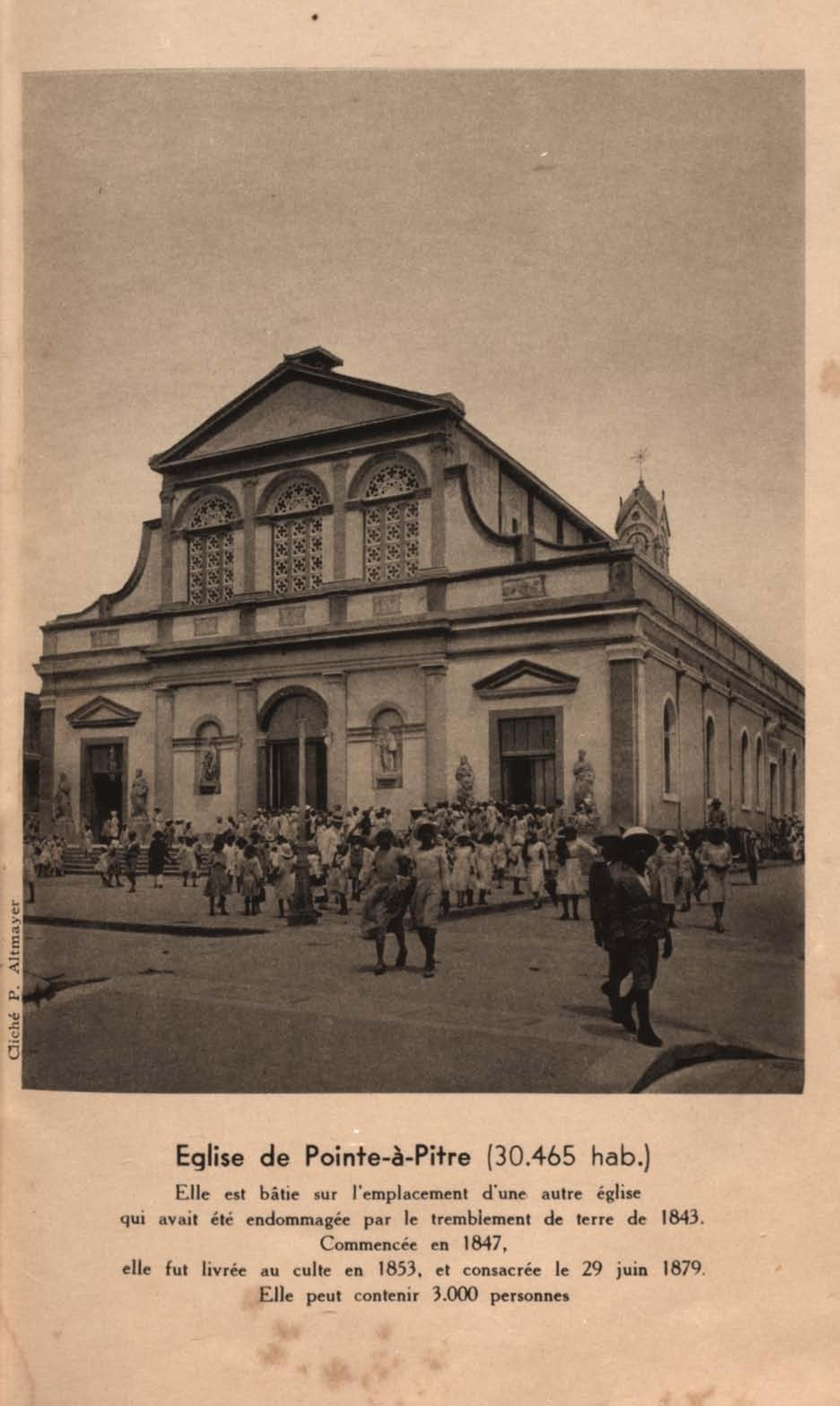 Eglise de Pointe-à-Pitre ( 30.465 hab ). Elle est bâtie sur l'emplacement d'une autre église qui avait été endommagée par le tremblement de terre de 1843. Commencée en 1847, elle fut livrée au culte en 1853, et consacrée le 29 juin 1879. Elle peut contenir 3.000 personnes