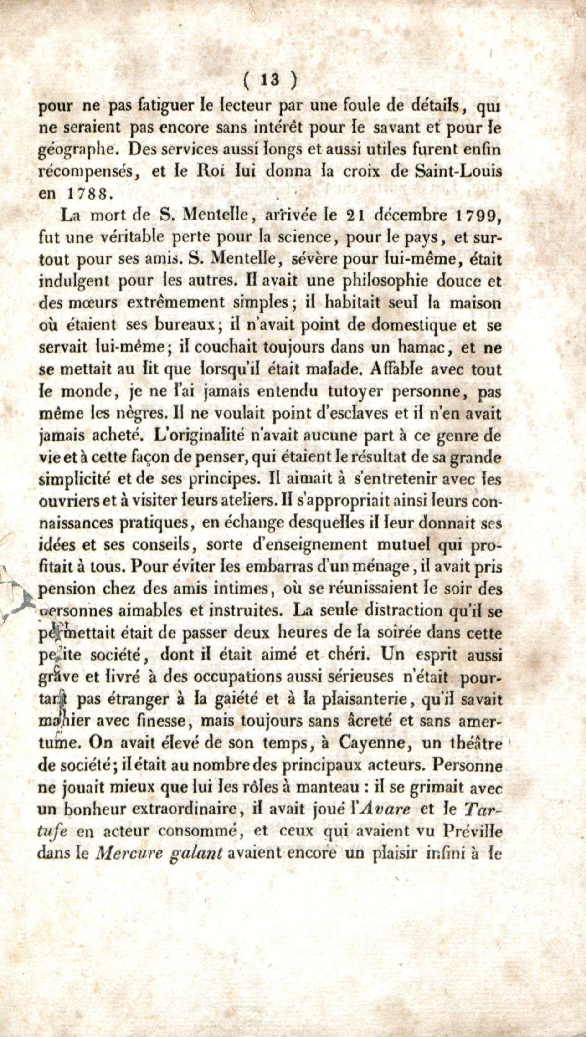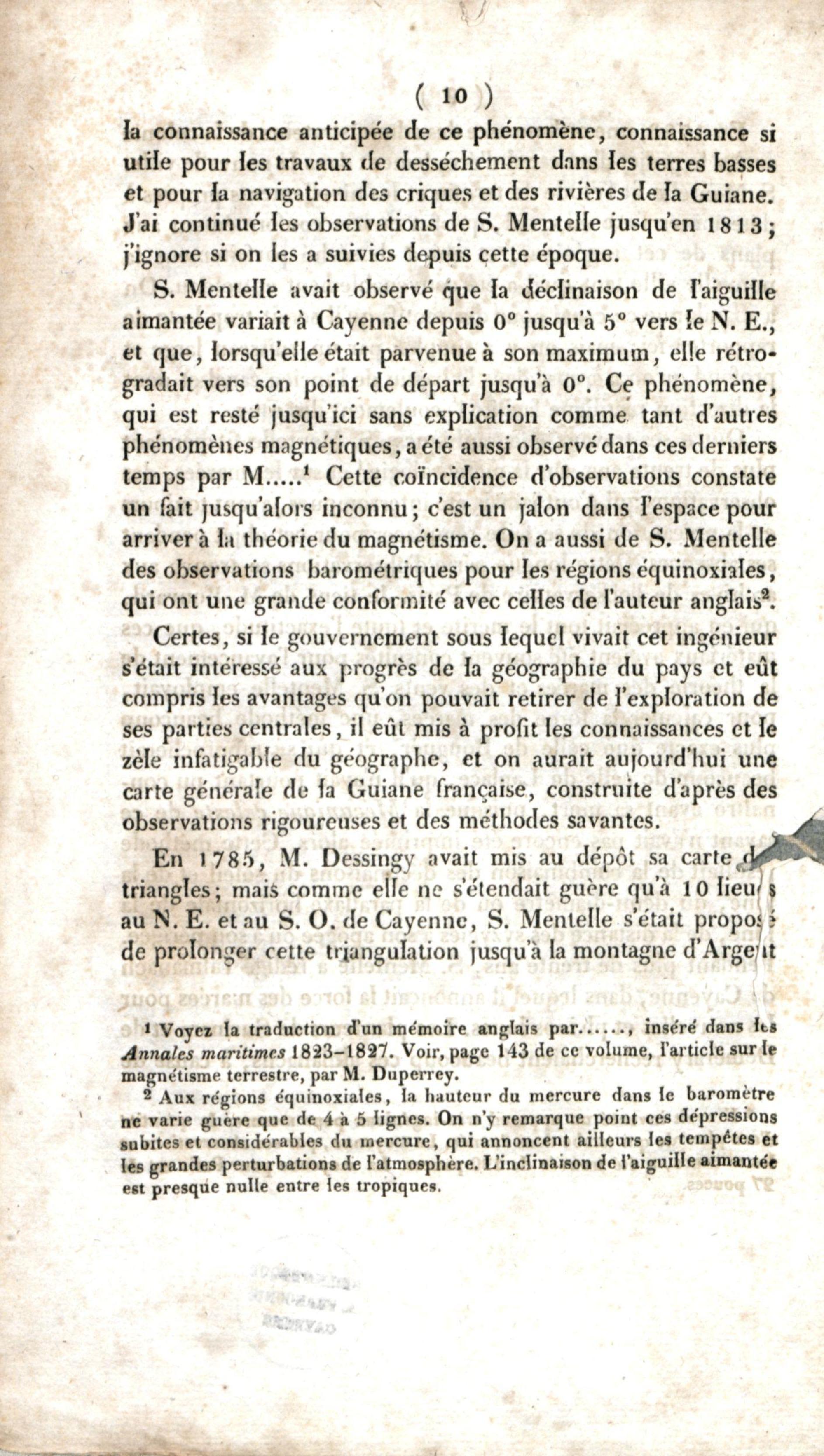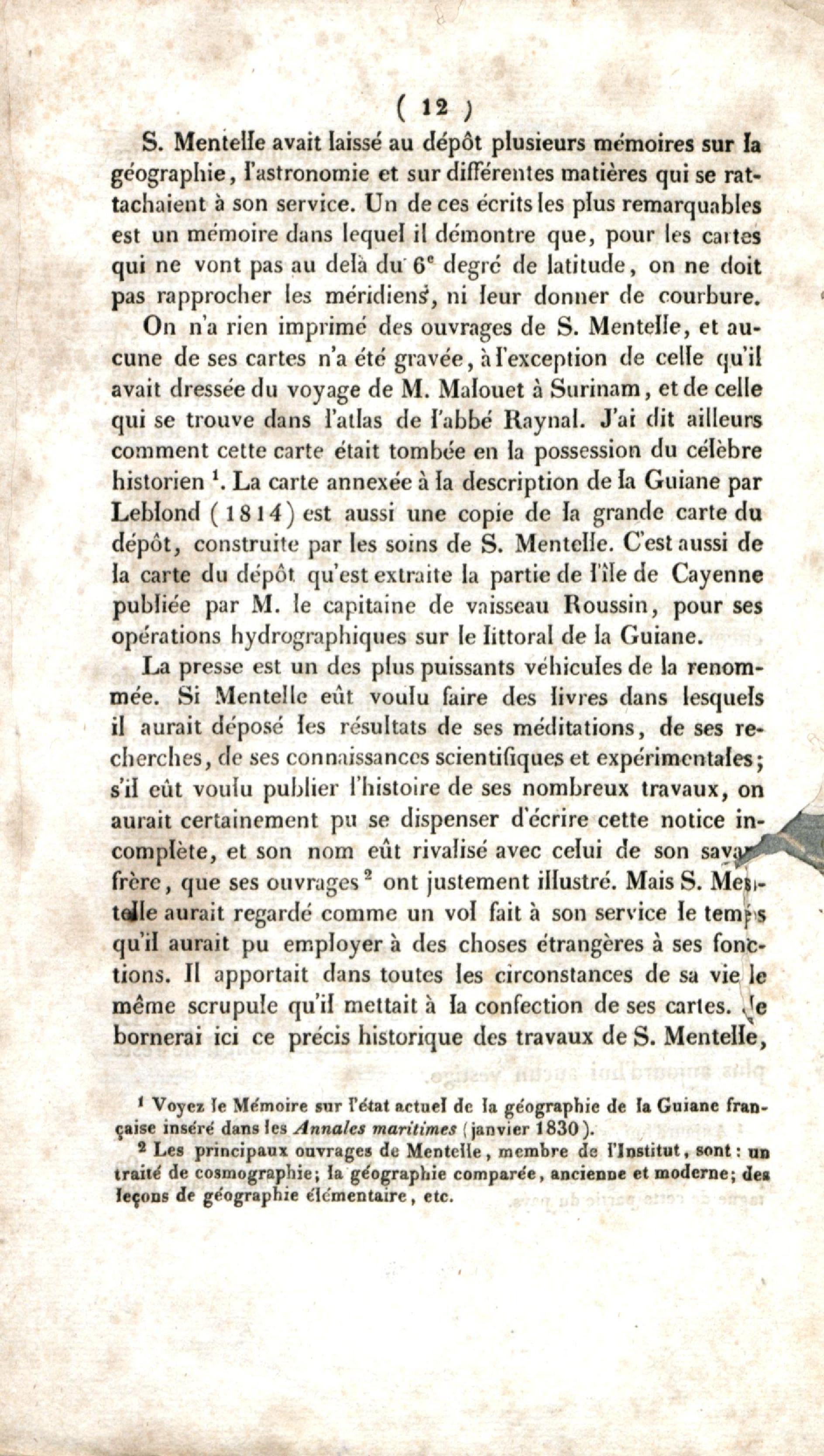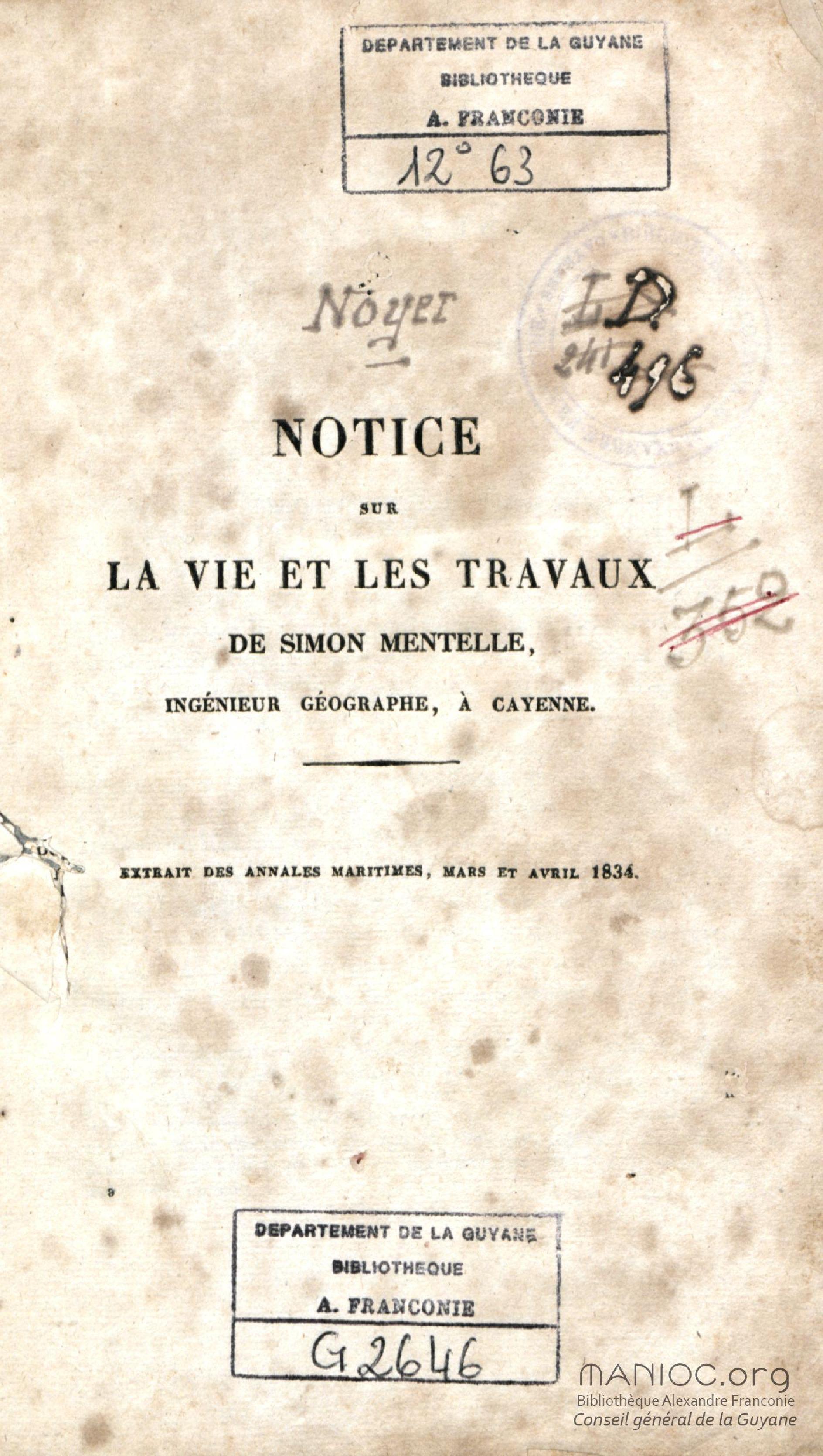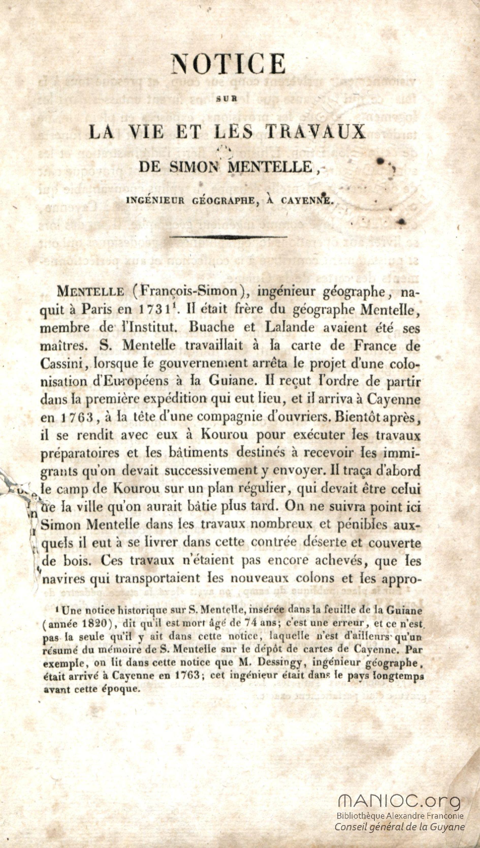 Notice sur la vie et les travaux de Simon Mentelle, ingénieur géographe à Cayenne, extrait des Annales maritimes, mars et avril 1834