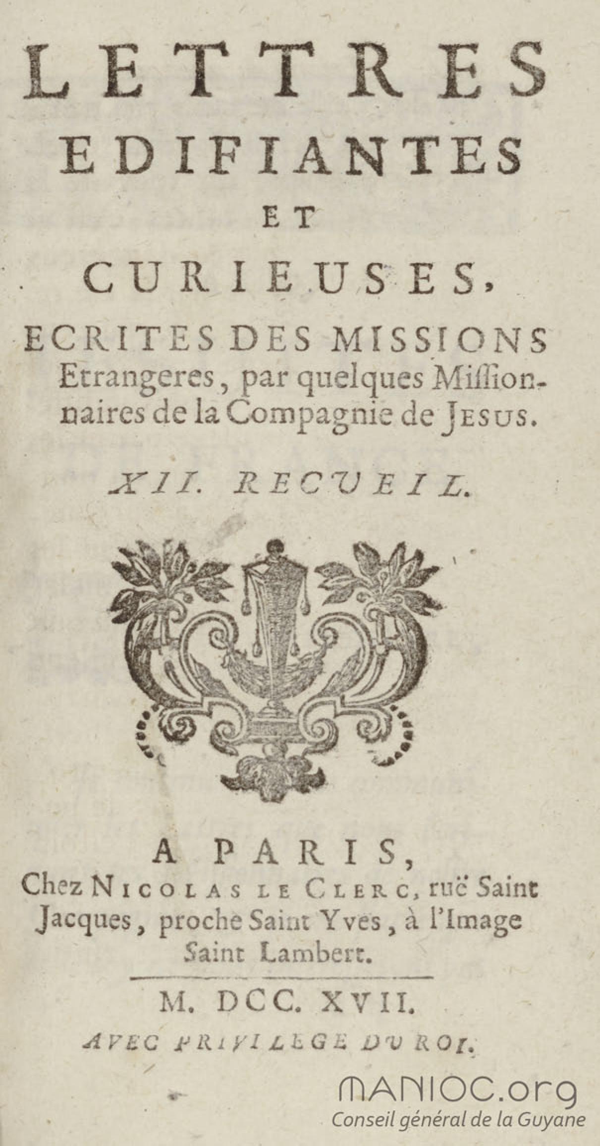 - Lettres édifiantes et curieuses, écrites des missions étrangères par quelques missionnaires de la Compagnie de Jésus. XII, Recueil