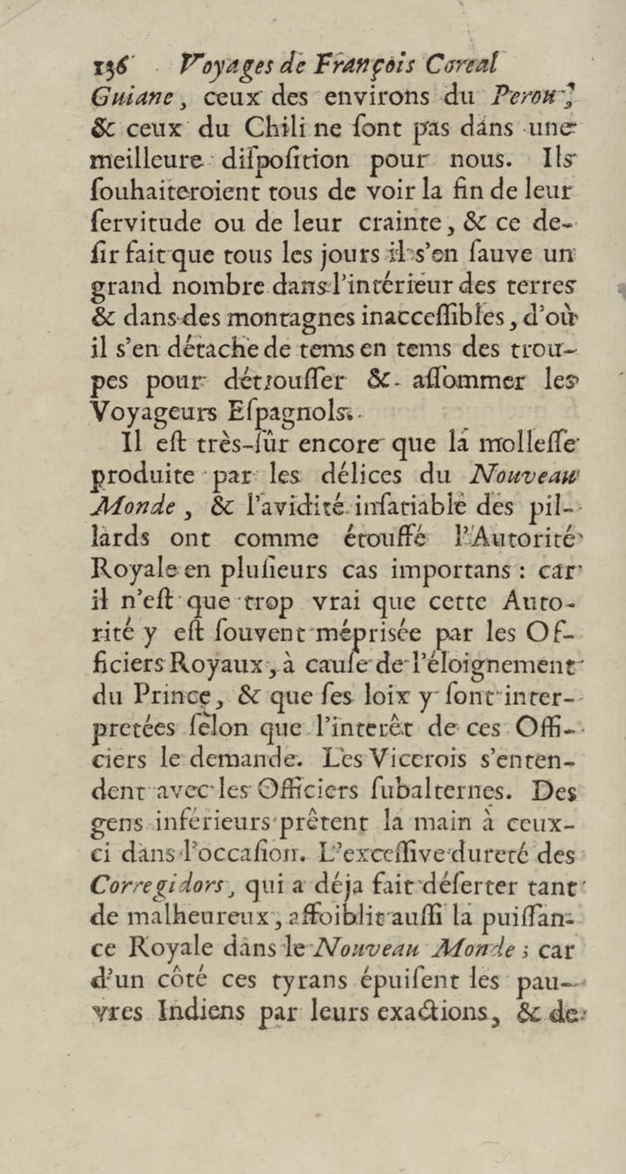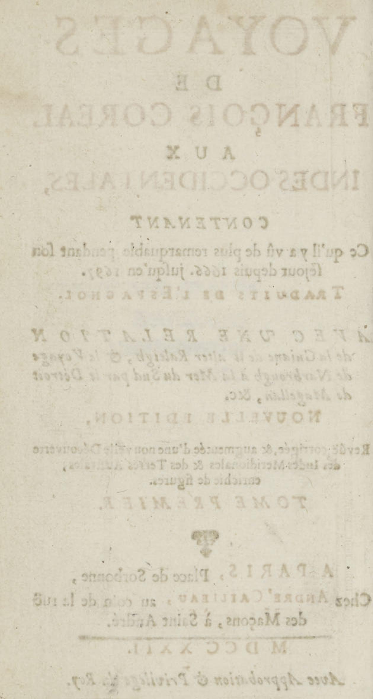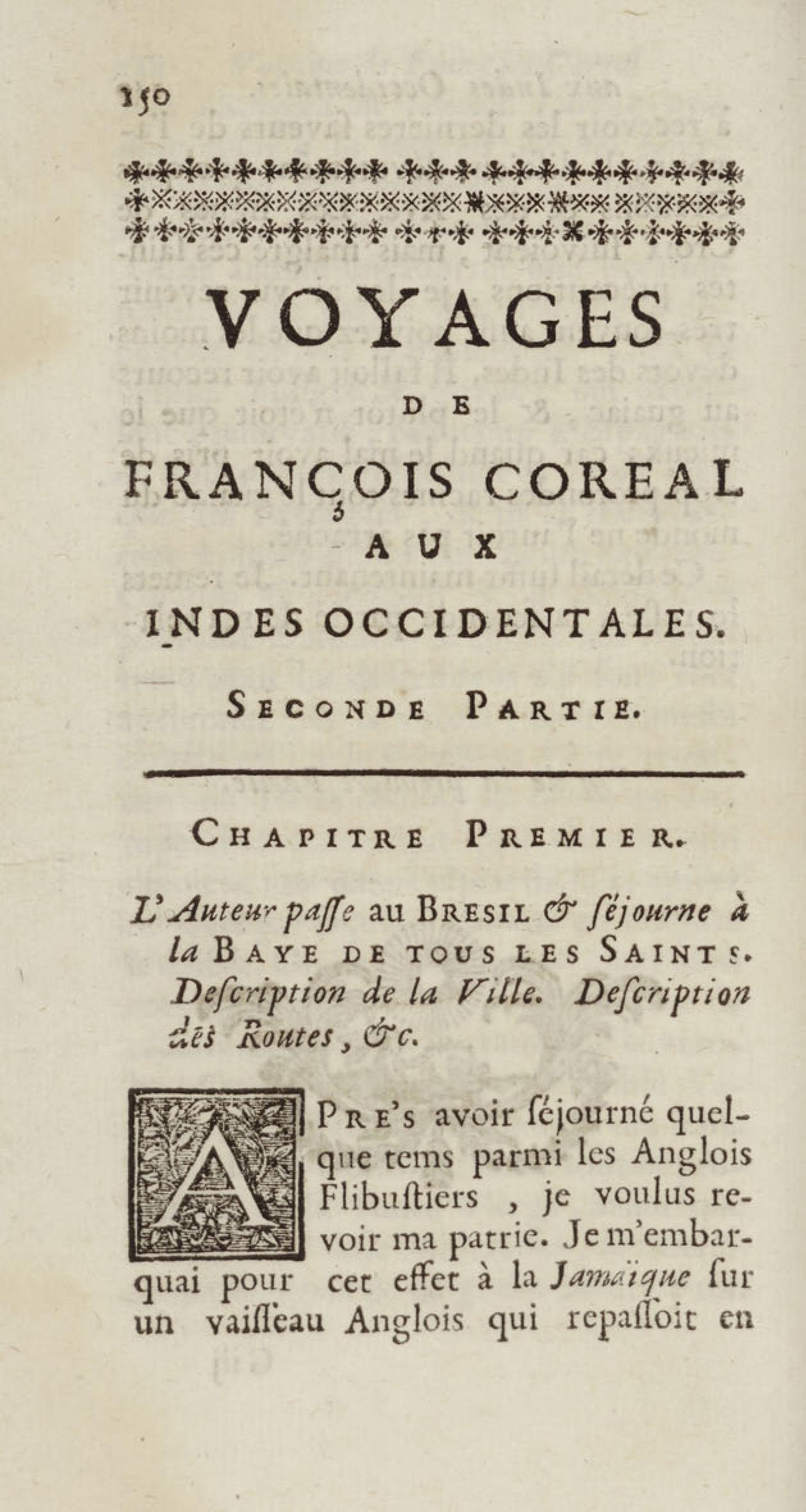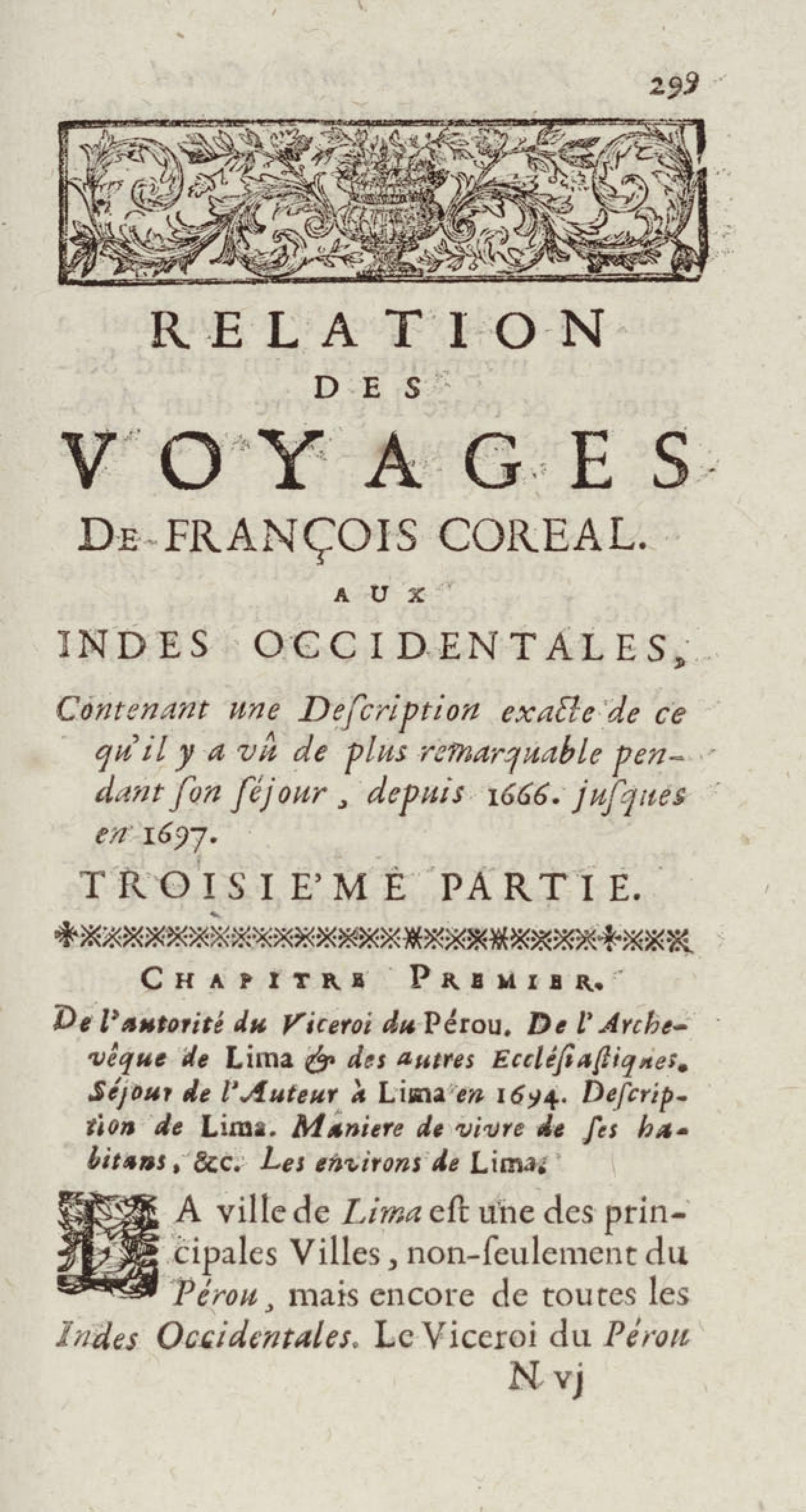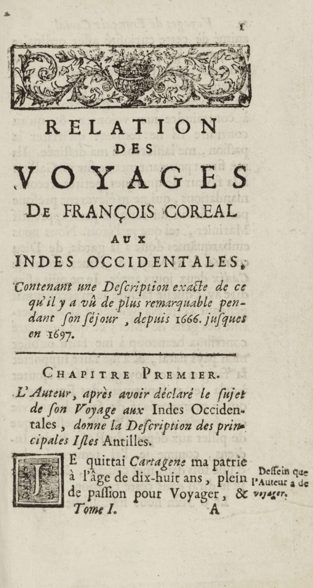 - Voyages de François Coreal aux Indes occidentales, contenant ce qu'il y a vû de plus remarquable pendant son séjour depuis 1666 jusqu'en 1697 : traduits de l'espagnol : avec une relation de la Guiane de Walter Raleigh, & le voyage de Narbrough à la mer du sud par le détroit de Magellan, &c. : nouvelle édition revûë, corrigée, & augmentée d'une nouvelle Découverte des Indes méridionales & des terres australes, enrichie de figures. Tome premier