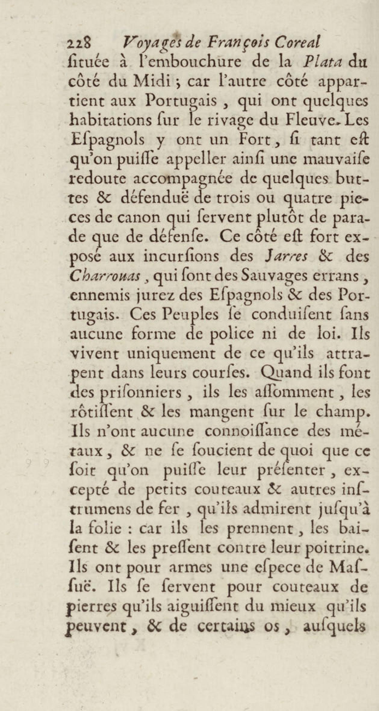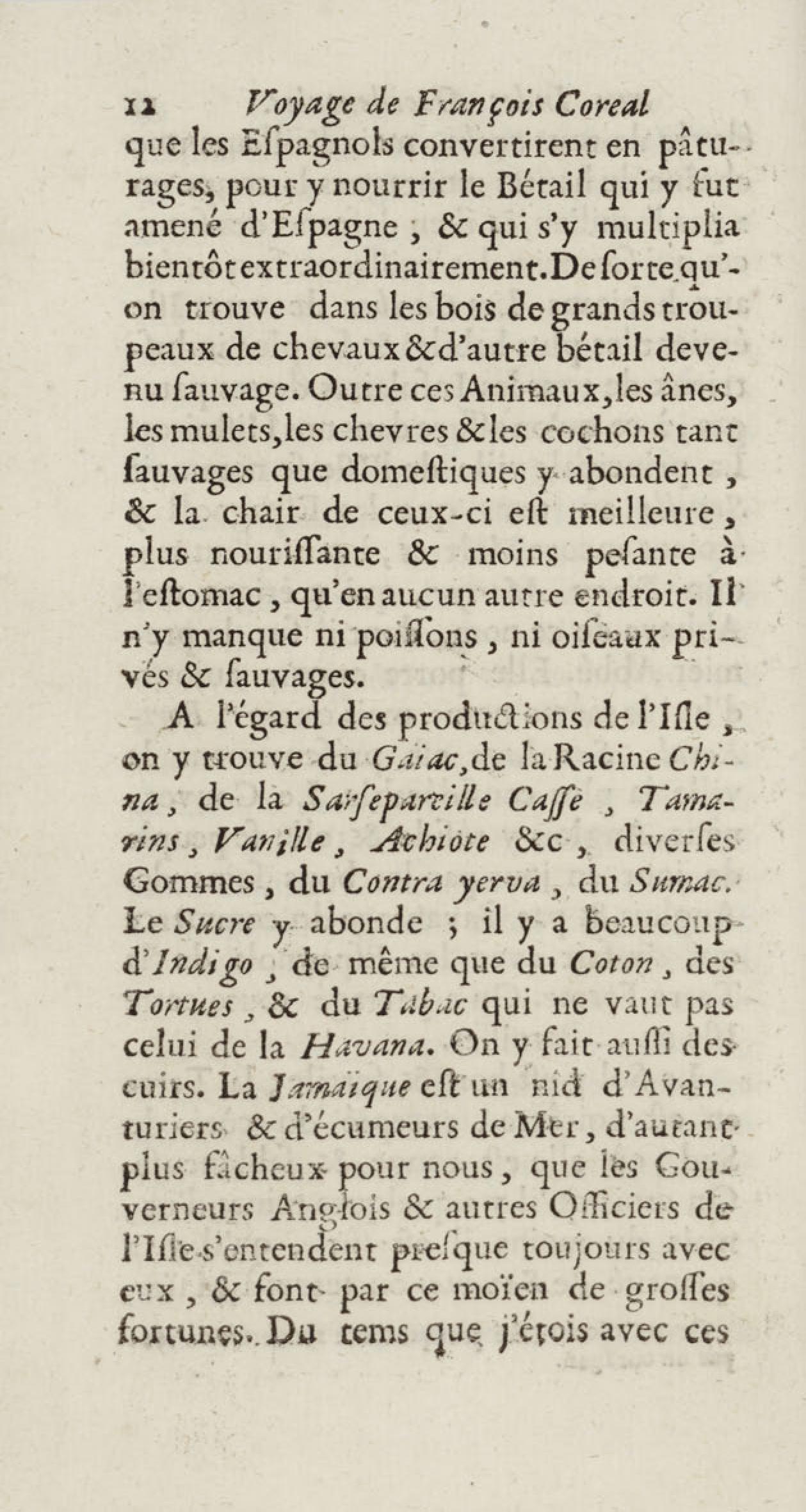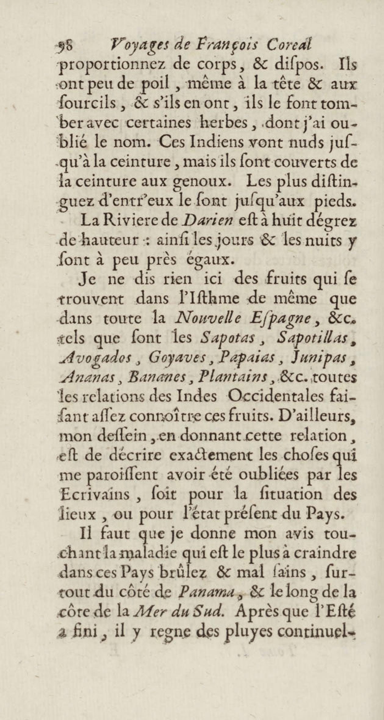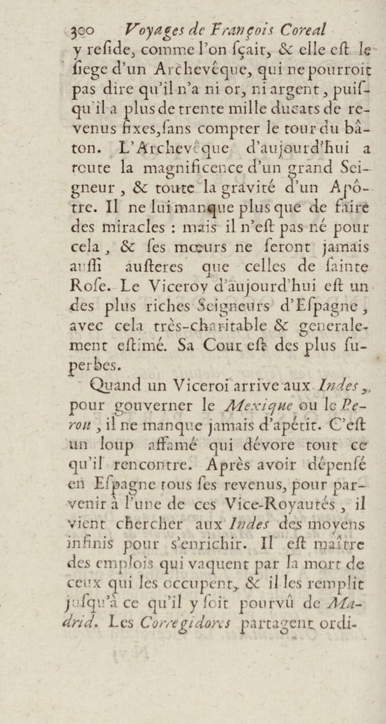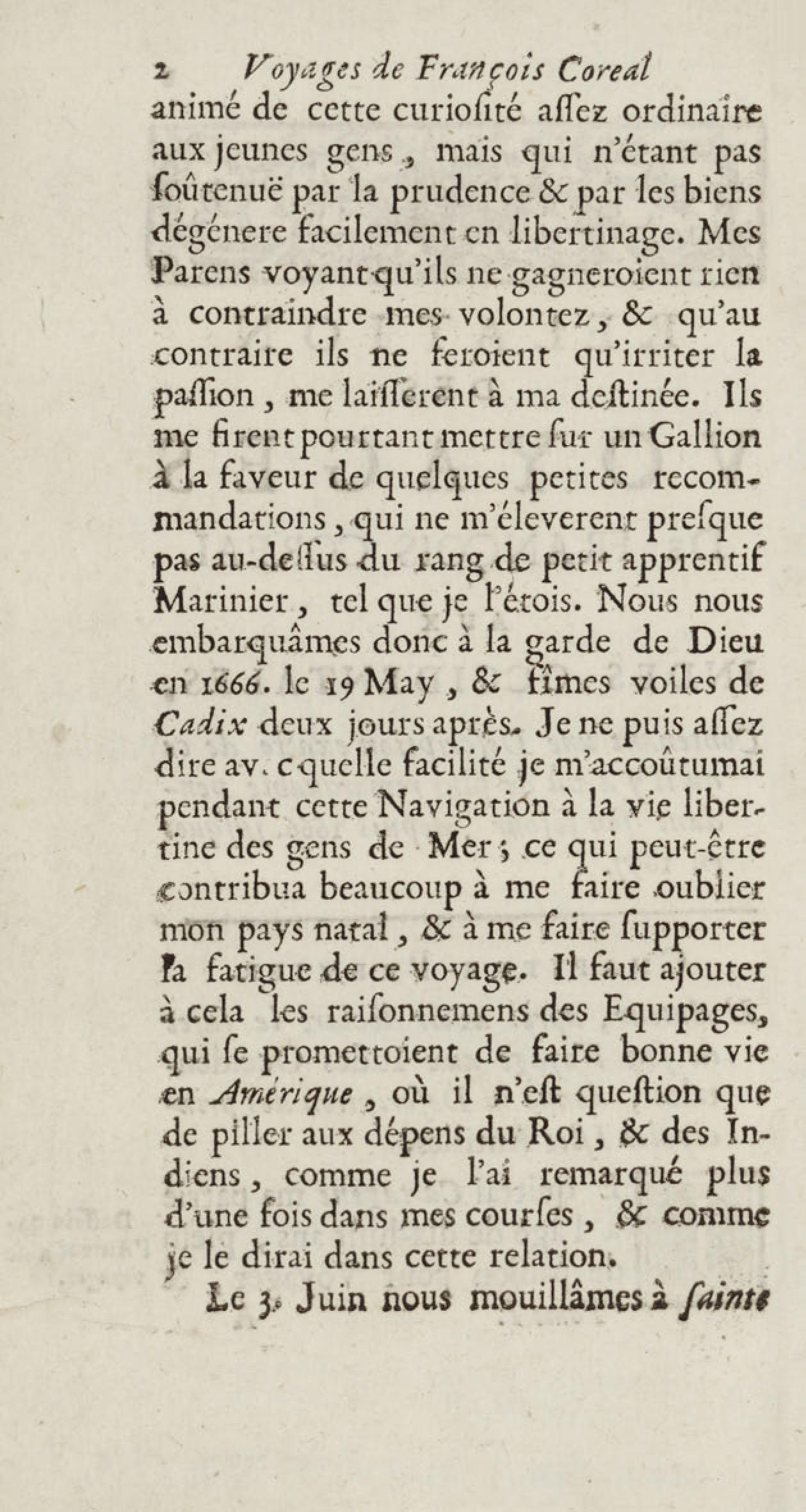 - Voyages de François Coreal aux Indes occidentales, contenant ce qu'il y a vû de plus remarquable pendant son séjour depuis 1666 jusqu'en 1697 : traduits de l'espagnol : avec une relation de la Guiane de Walter Raleigh, & le voyage de Narbrough à la mer du sud par le détroit de Magellan, &c. : nouvelle édition revûë, corrigée, & augmentée d'une nouvelle Découverte des Indes méridionales & des terres australes, enrichie de figures. Tome premier