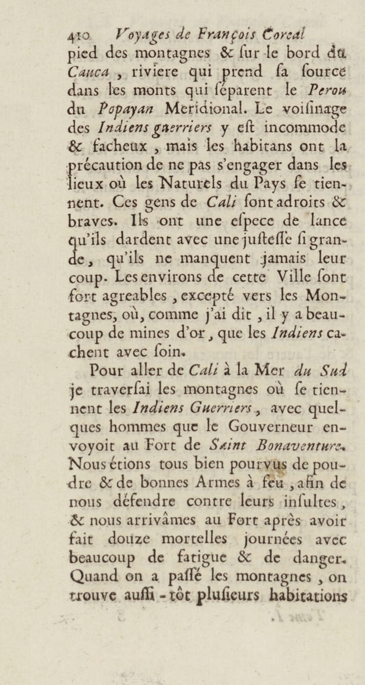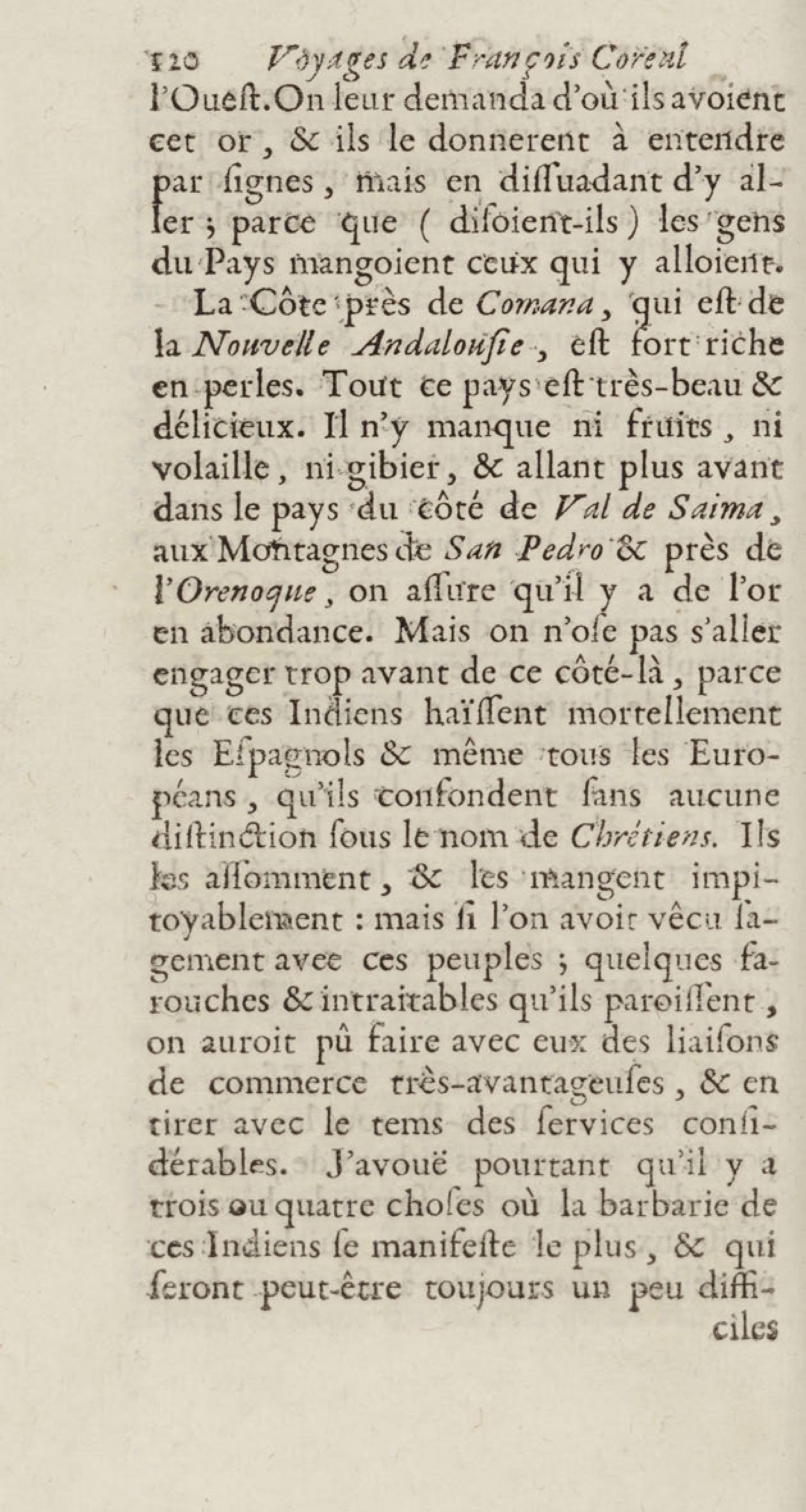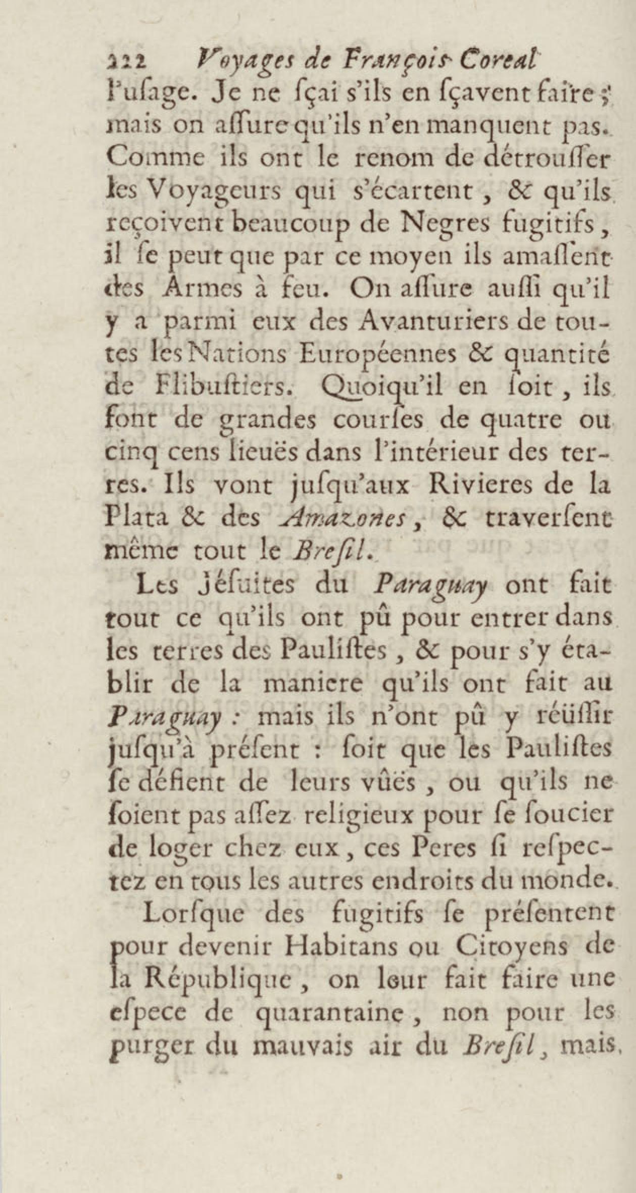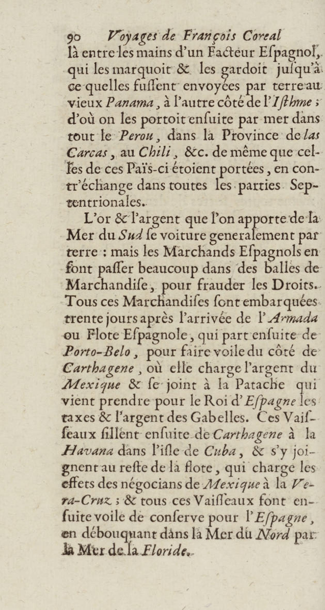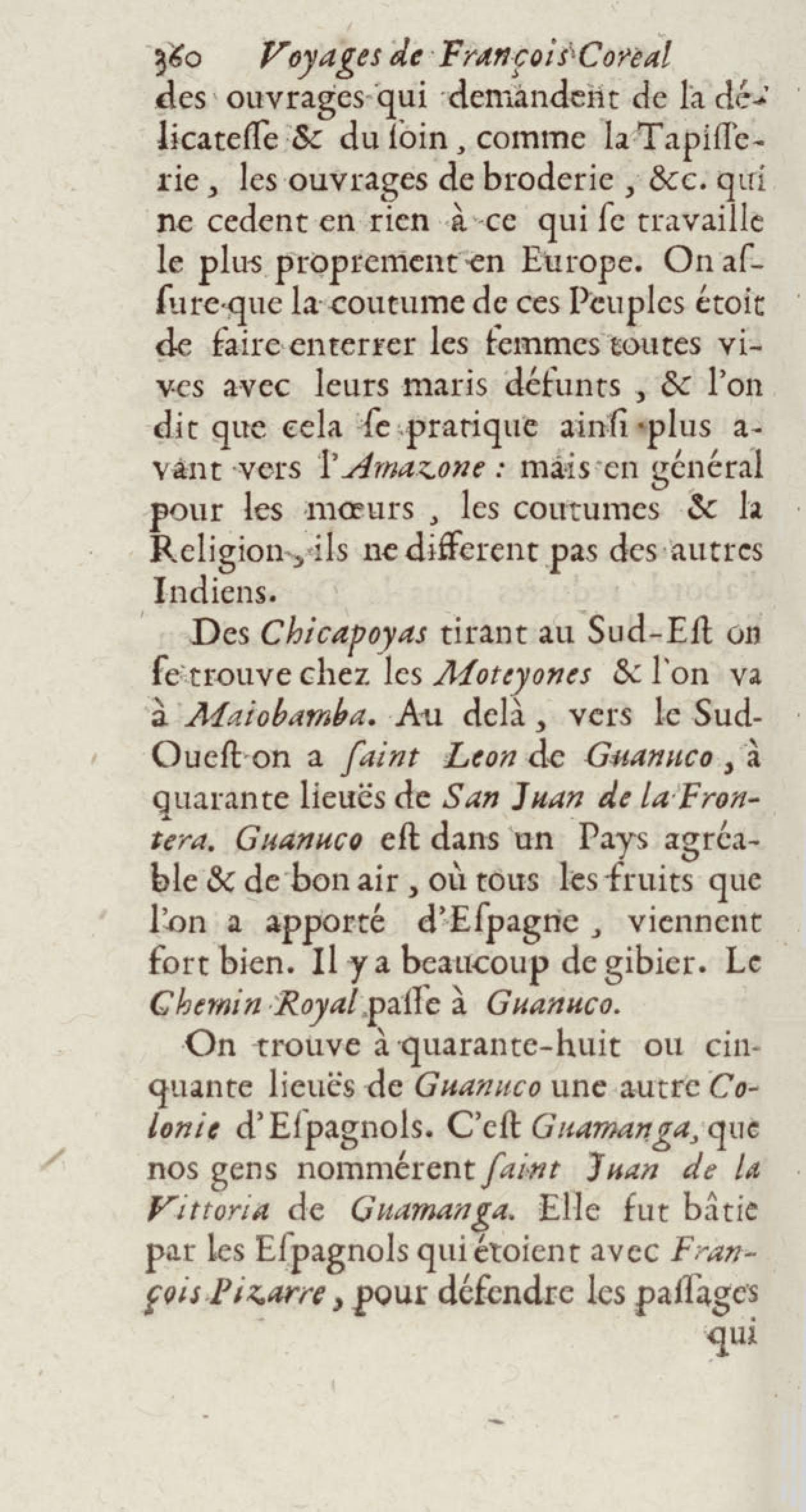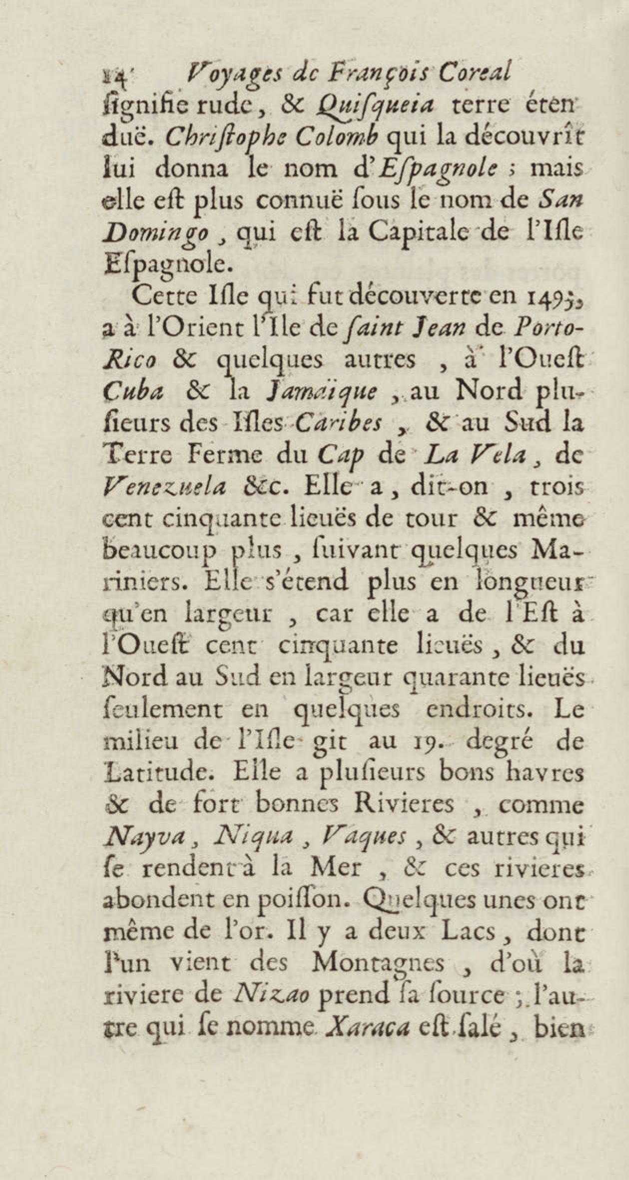 - Voyages de François Coreal aux Indes occidentales, contenant ce qu'il y a vû de plus remarquable pendant son séjour depuis 1666 jusqu'en 1697 : traduits de l'espagnol : avec une relation de la Guiane de Walter Raleigh, & le voyage de Narbrough à la mer du sud par le détroit de Magellan, &c. : nouvelle édition revûë, corrigée, & augmentée d'une nouvelle Découverte des Indes méridionales & des terres australes, enrichie de figures. Tome premier