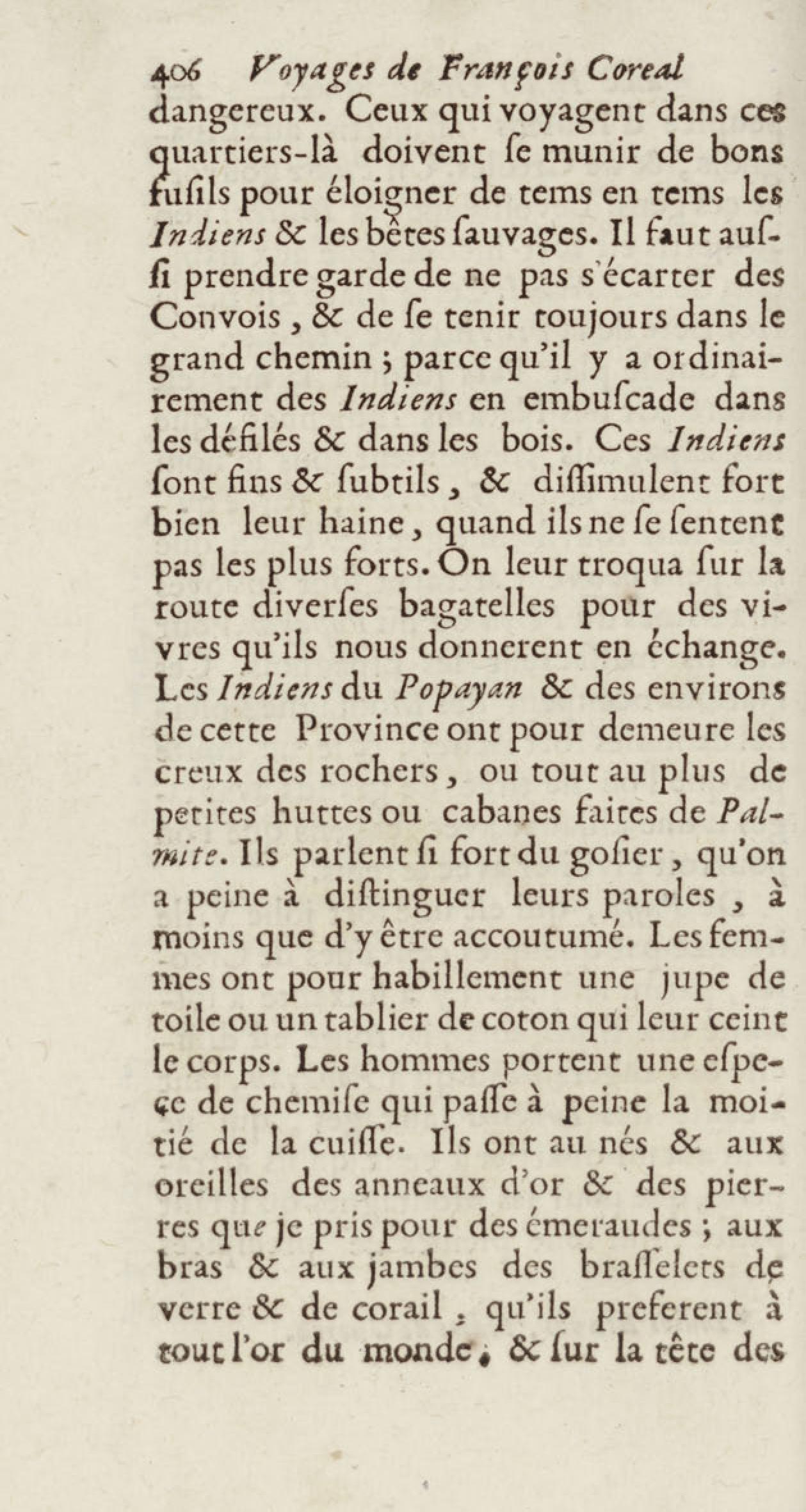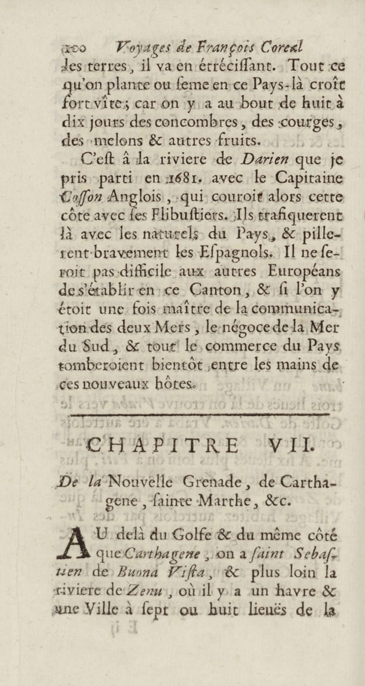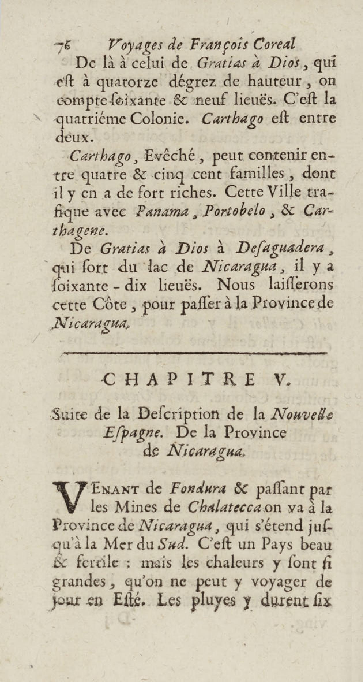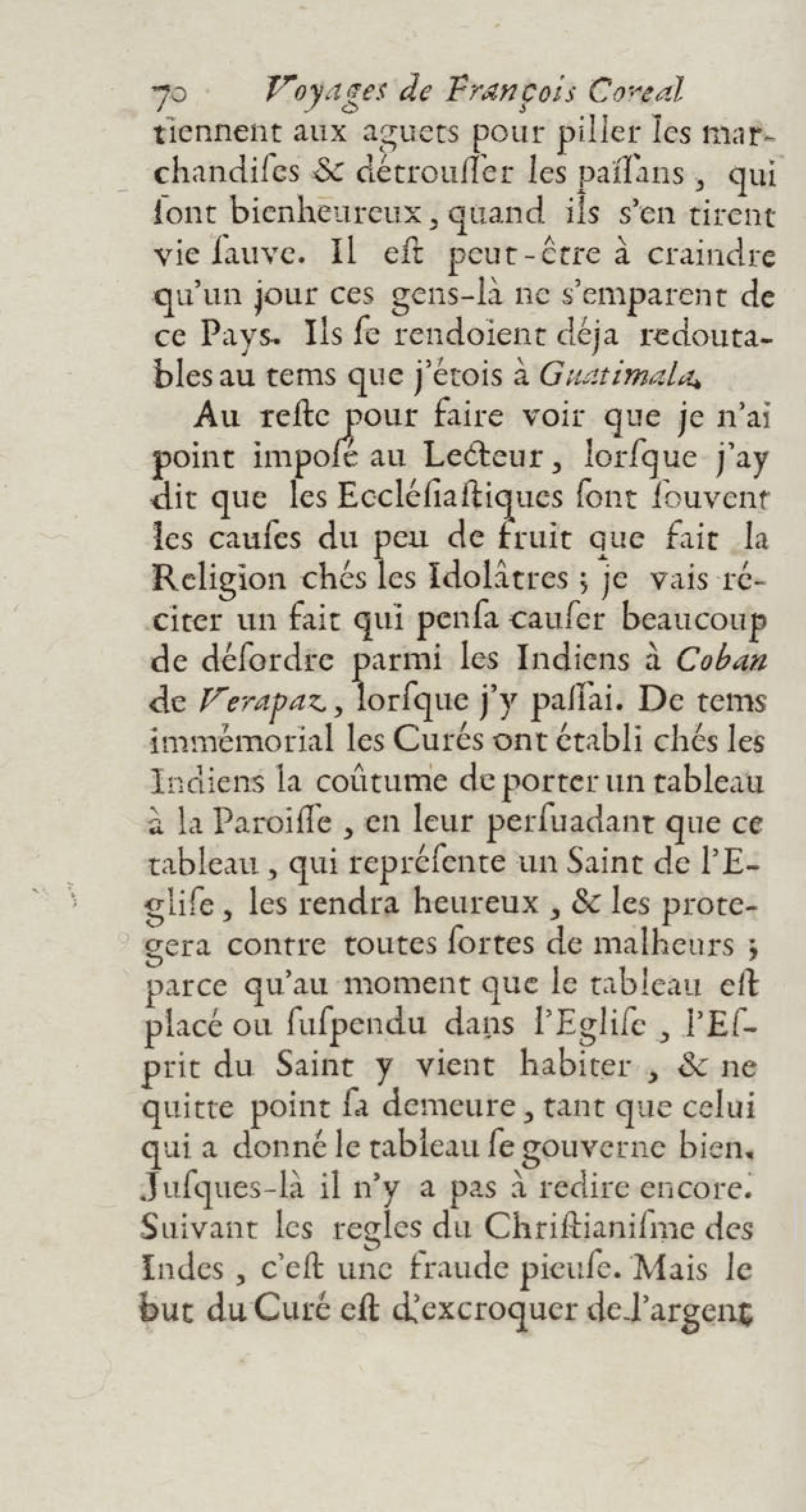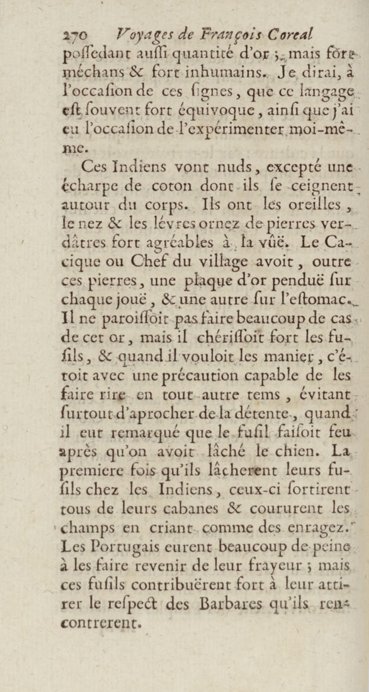 - Voyages de François Coreal aux Indes occidentales, contenant ce qu'il y a vû de plus remarquable pendant son séjour depuis 1666 jusqu'en 1697 : traduits de l'espagnol : avec une relation de la Guiane de Walter Raleigh, & le voyage de Narbrough à la mer du sud par le détroit de Magellan, &c. : nouvelle édition revûë, corrigée, & augmentée d'une nouvelle Découverte des Indes méridionales & des terres australes, enrichie de figures. Tome premier