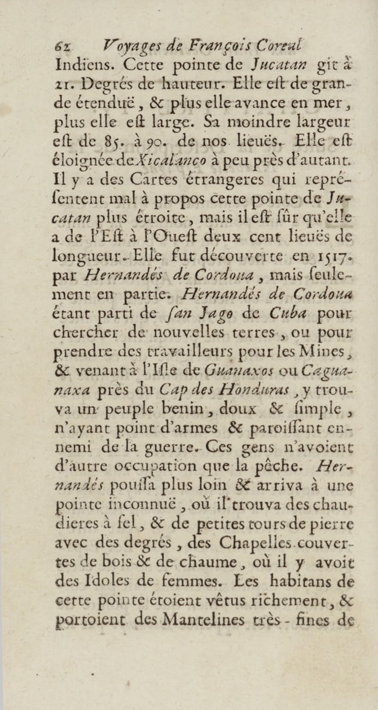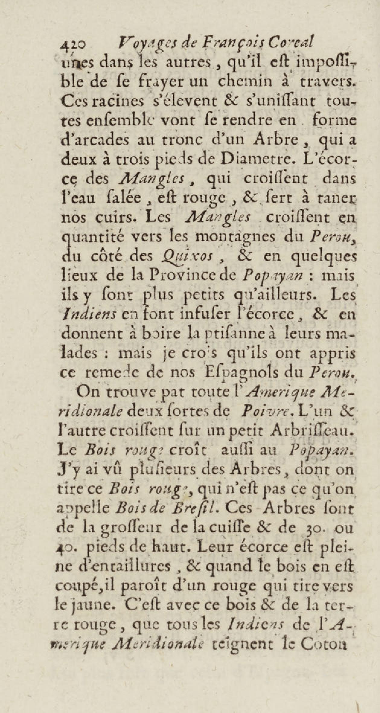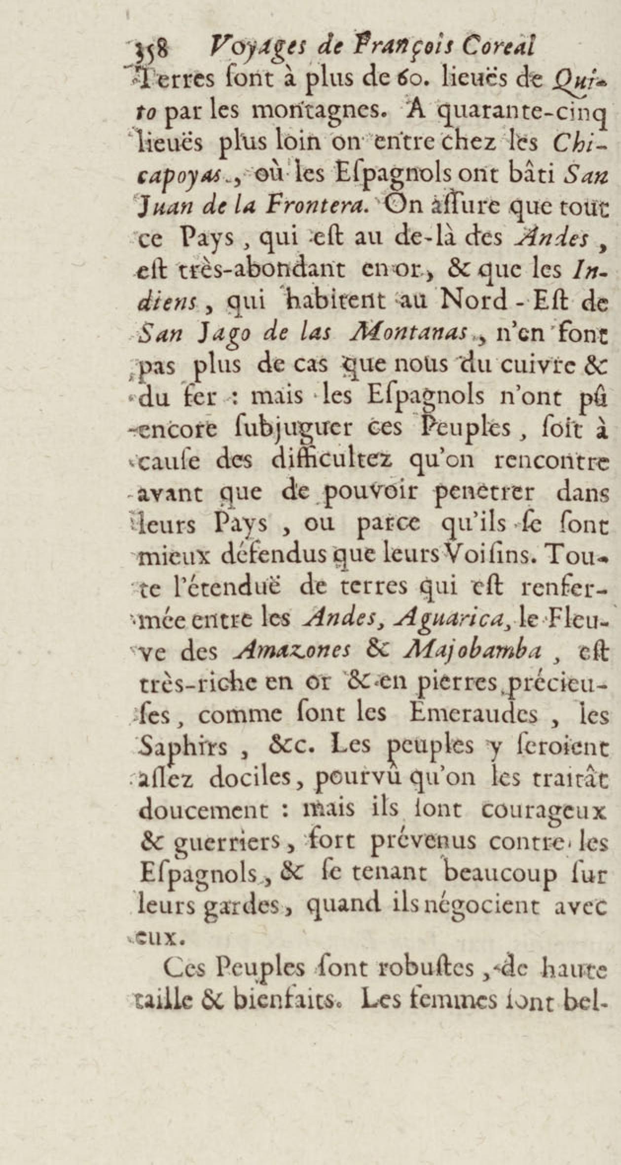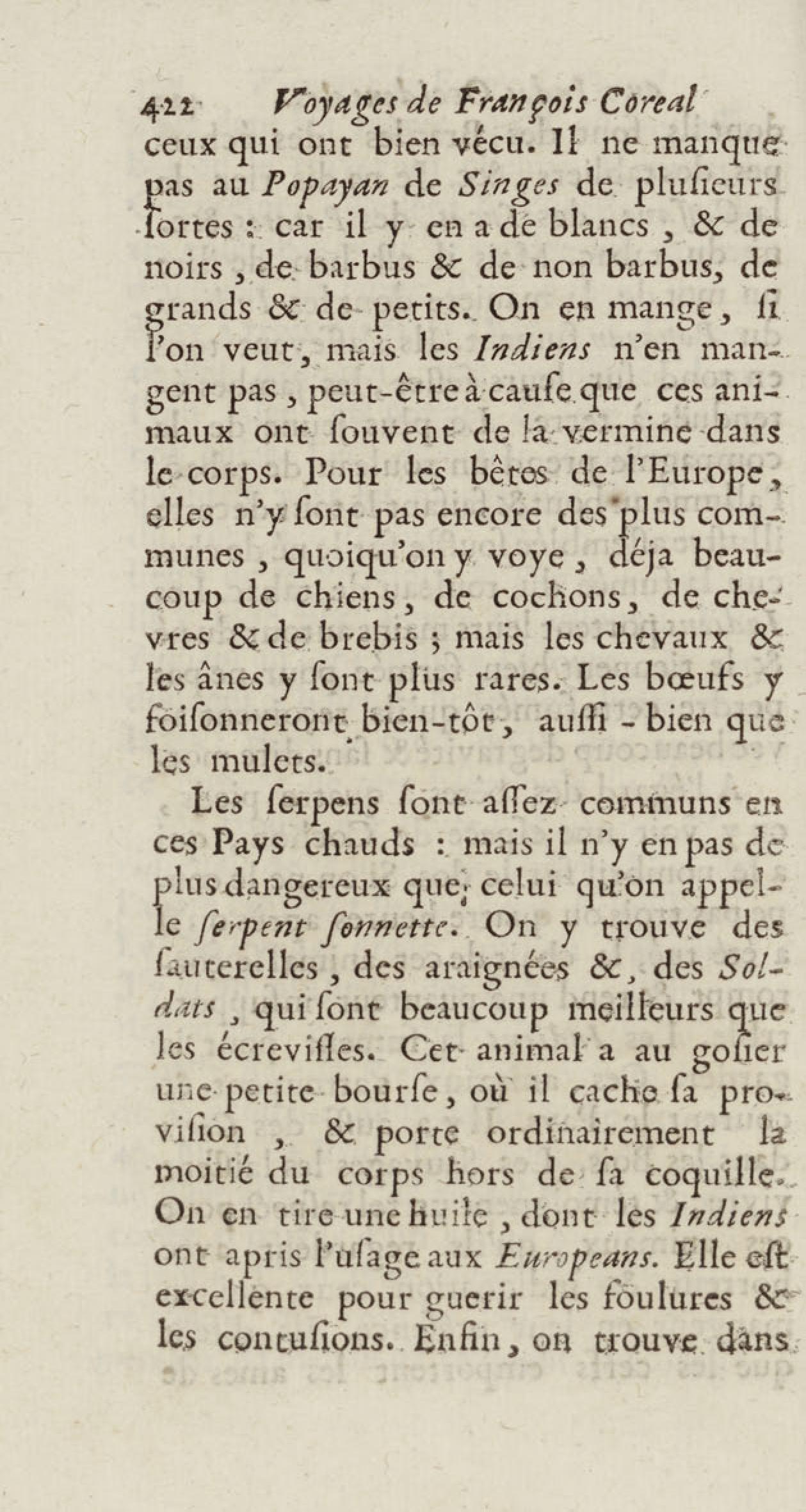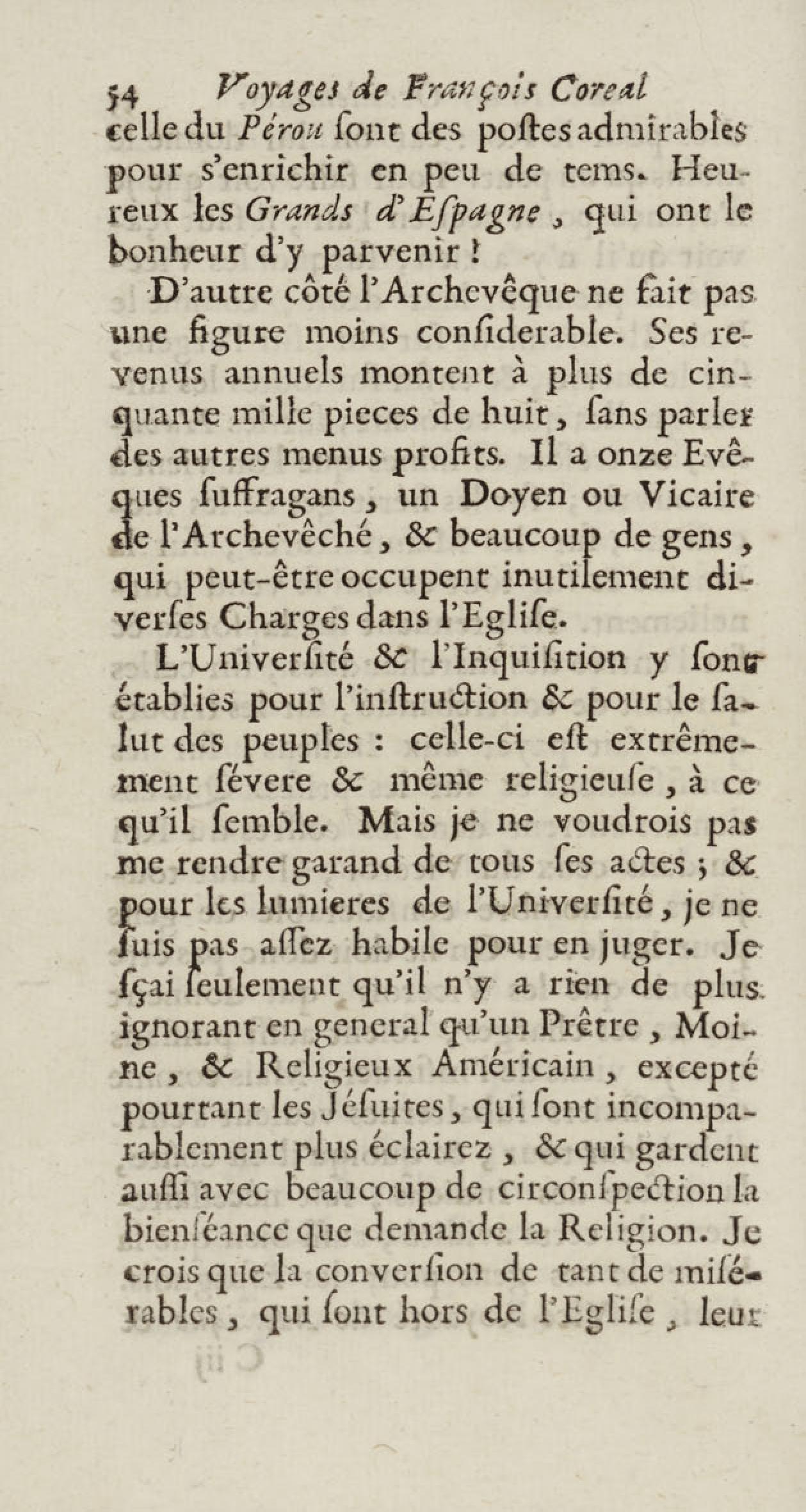 - Voyages de François Coreal aux Indes occidentales, contenant ce qu'il y a vû de plus remarquable pendant son séjour depuis 1666 jusqu'en 1697 : traduits de l'espagnol : avec une relation de la Guiane de Walter Raleigh, & le voyage de Narbrough à la mer du sud par le détroit de Magellan, &c. : nouvelle édition revûë, corrigée, & augmentée d'une nouvelle Découverte des Indes méridionales & des terres australes, enrichie de figures. Tome premier