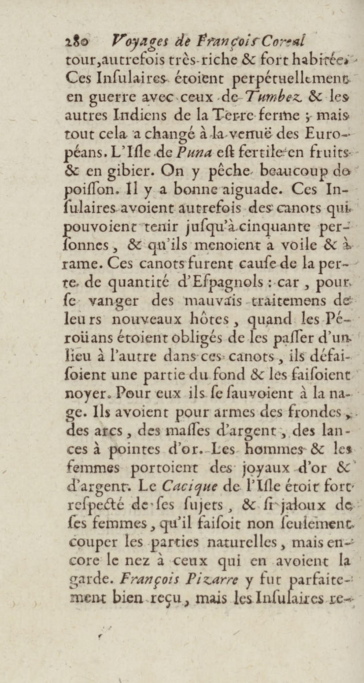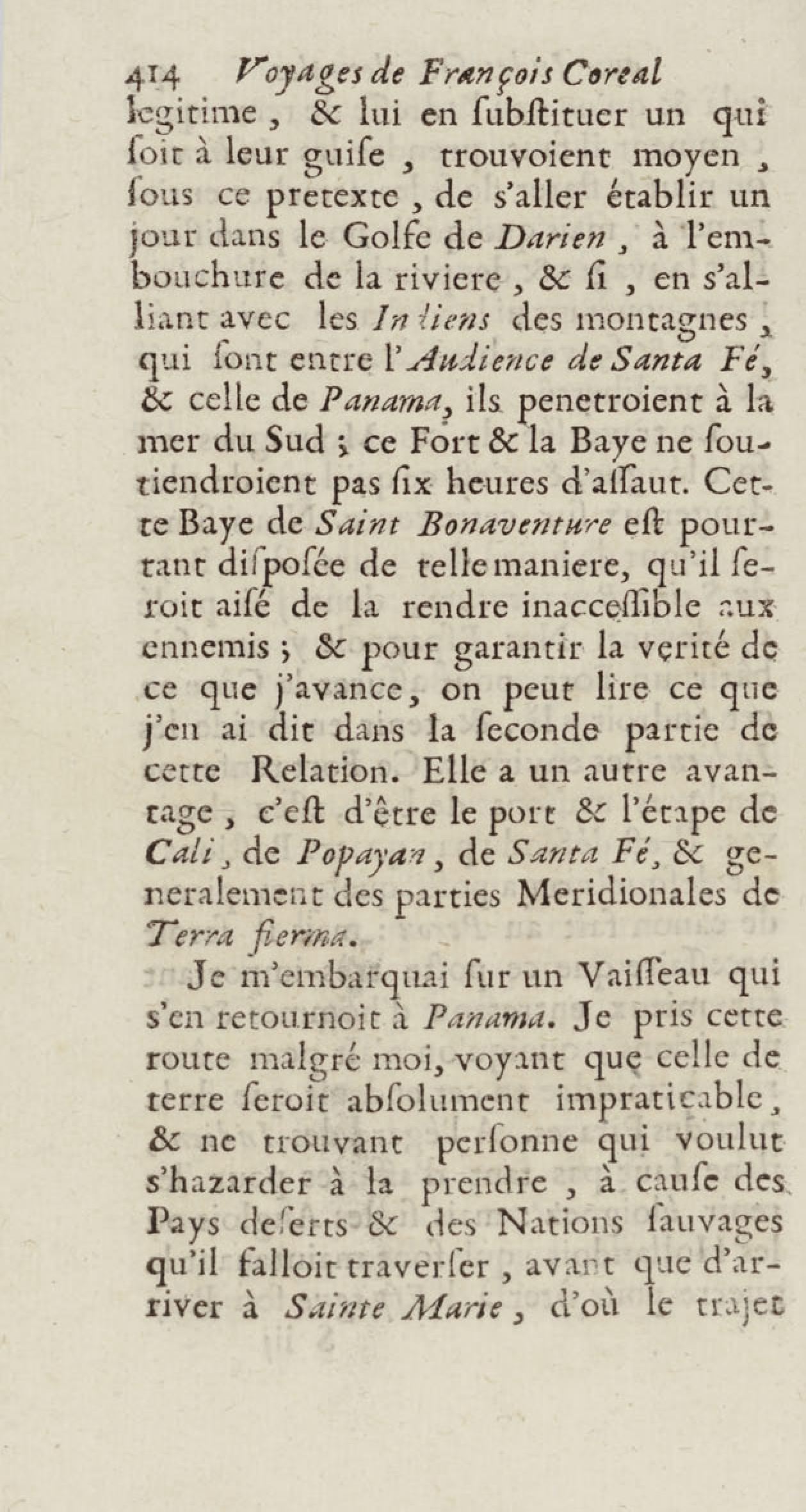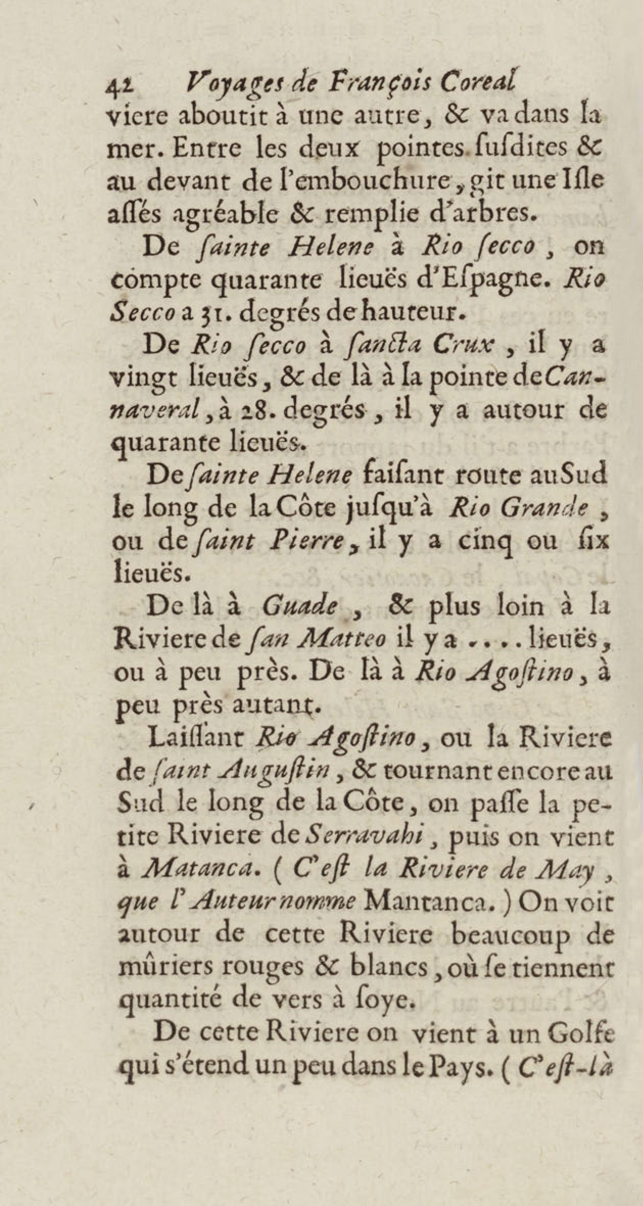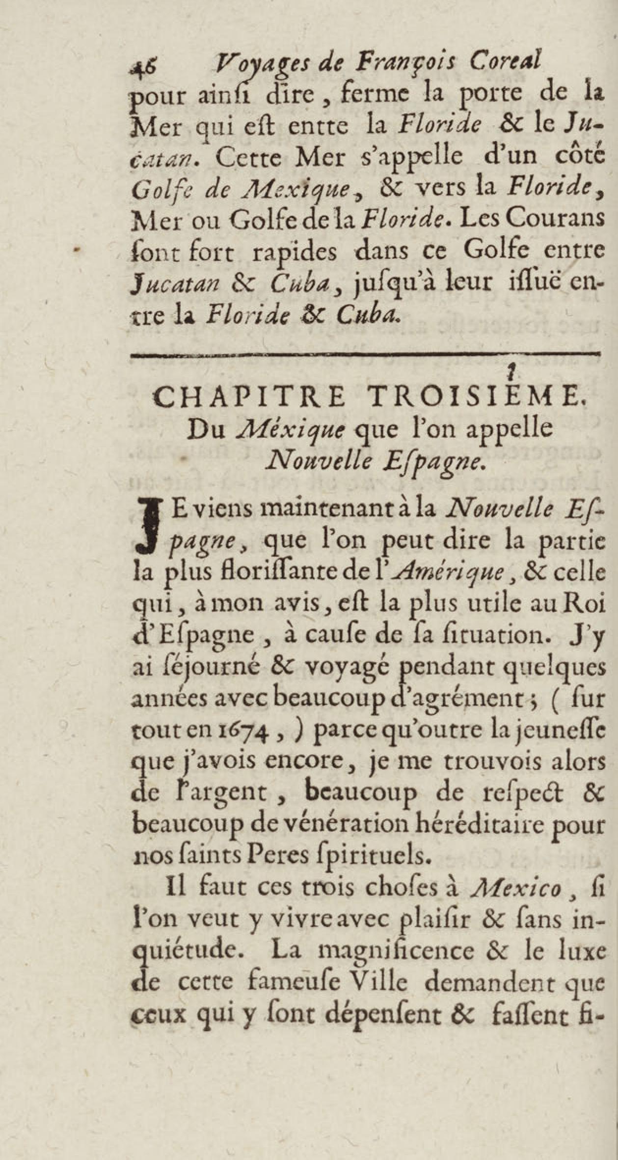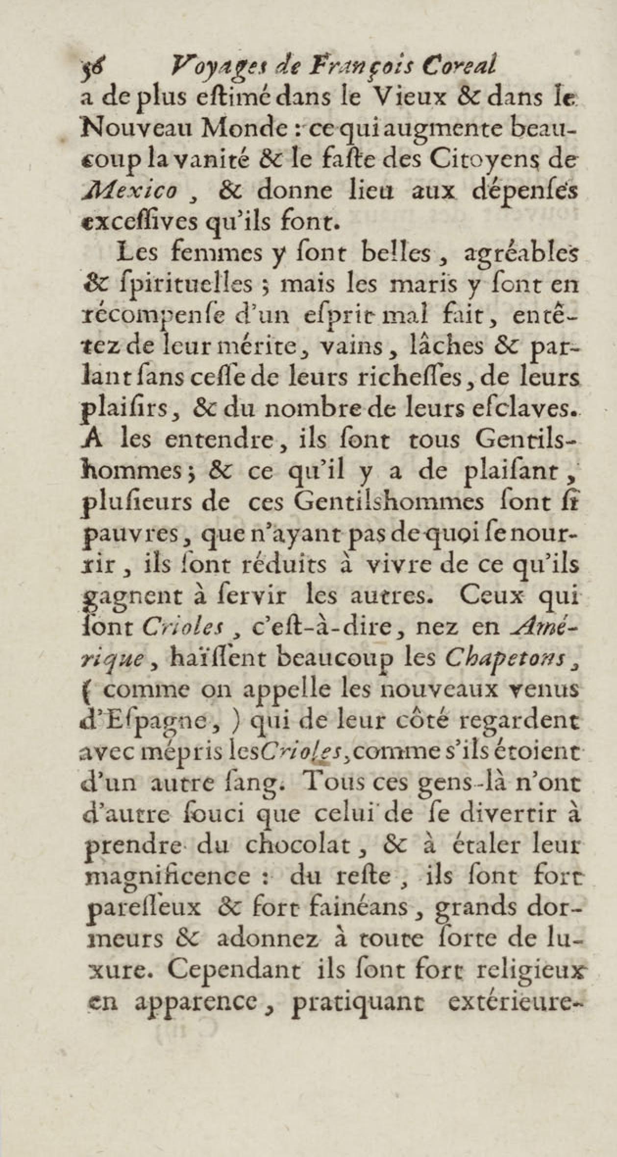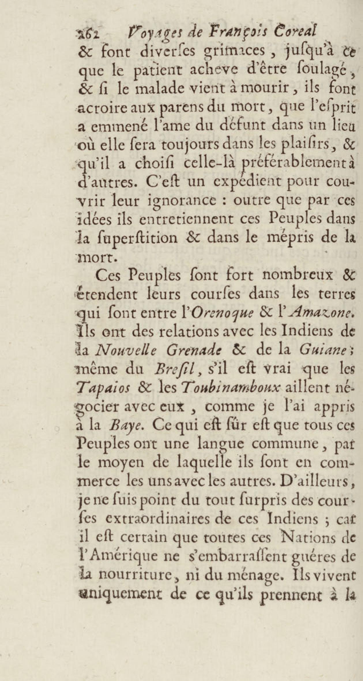 - Voyages de François Coreal aux Indes occidentales, contenant ce qu'il y a vû de plus remarquable pendant son séjour depuis 1666 jusqu'en 1697 : traduits de l'espagnol : avec une relation de la Guiane de Walter Raleigh, & le voyage de Narbrough à la mer du sud par le détroit de Magellan, &c. : nouvelle édition revûë, corrigée, & augmentée d'une nouvelle Découverte des Indes méridionales & des terres australes, enrichie de figures. Tome premier