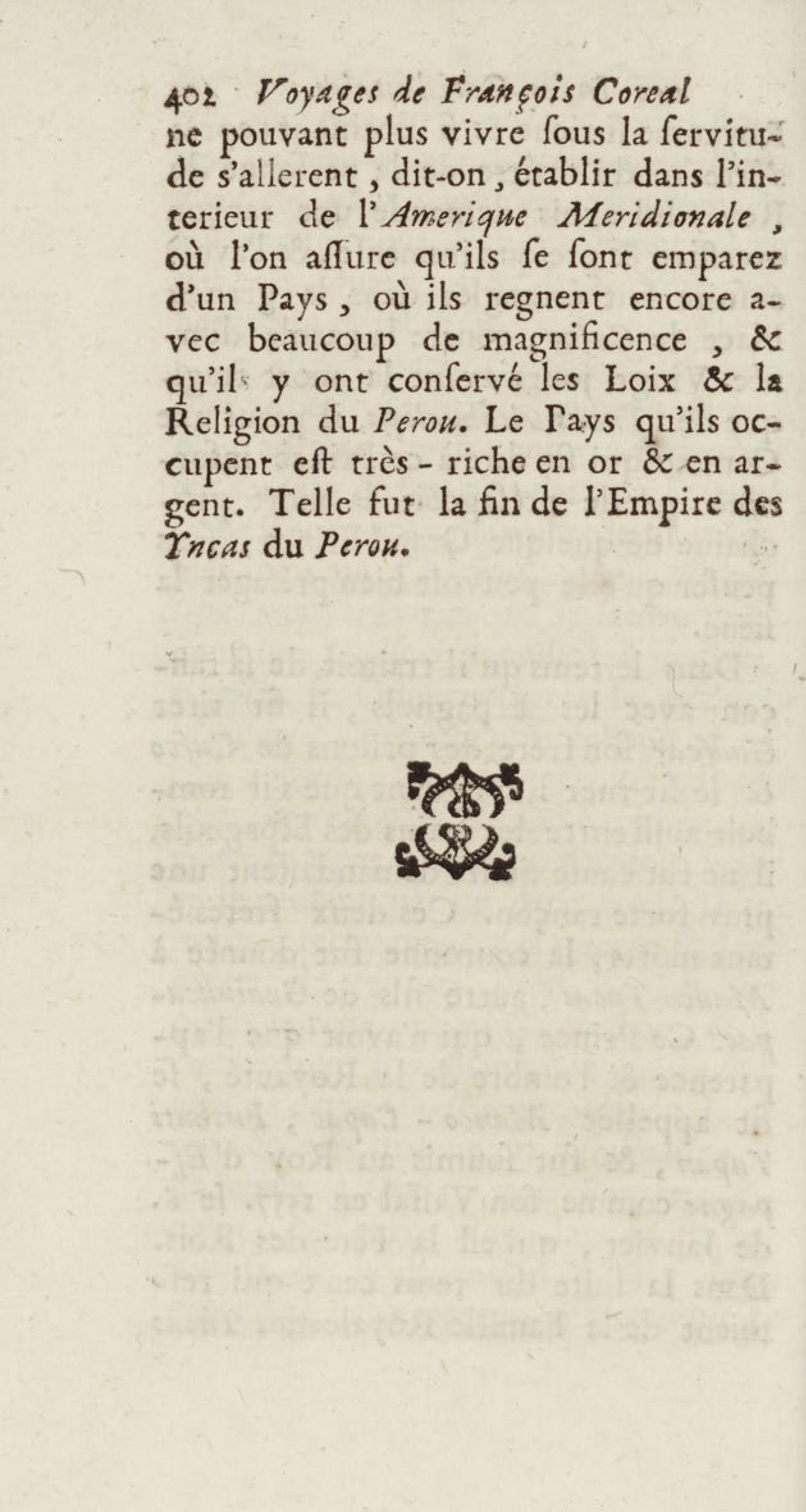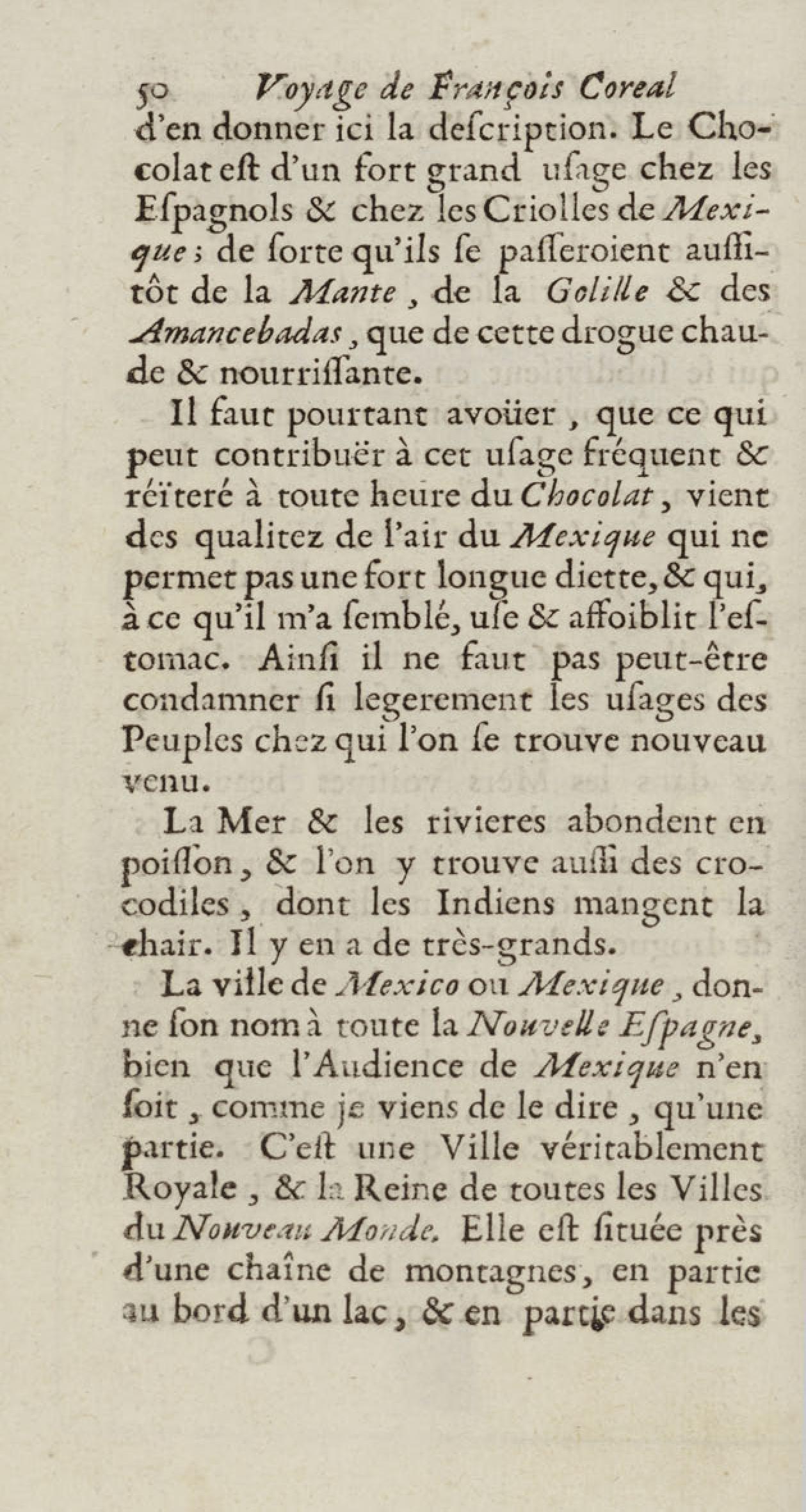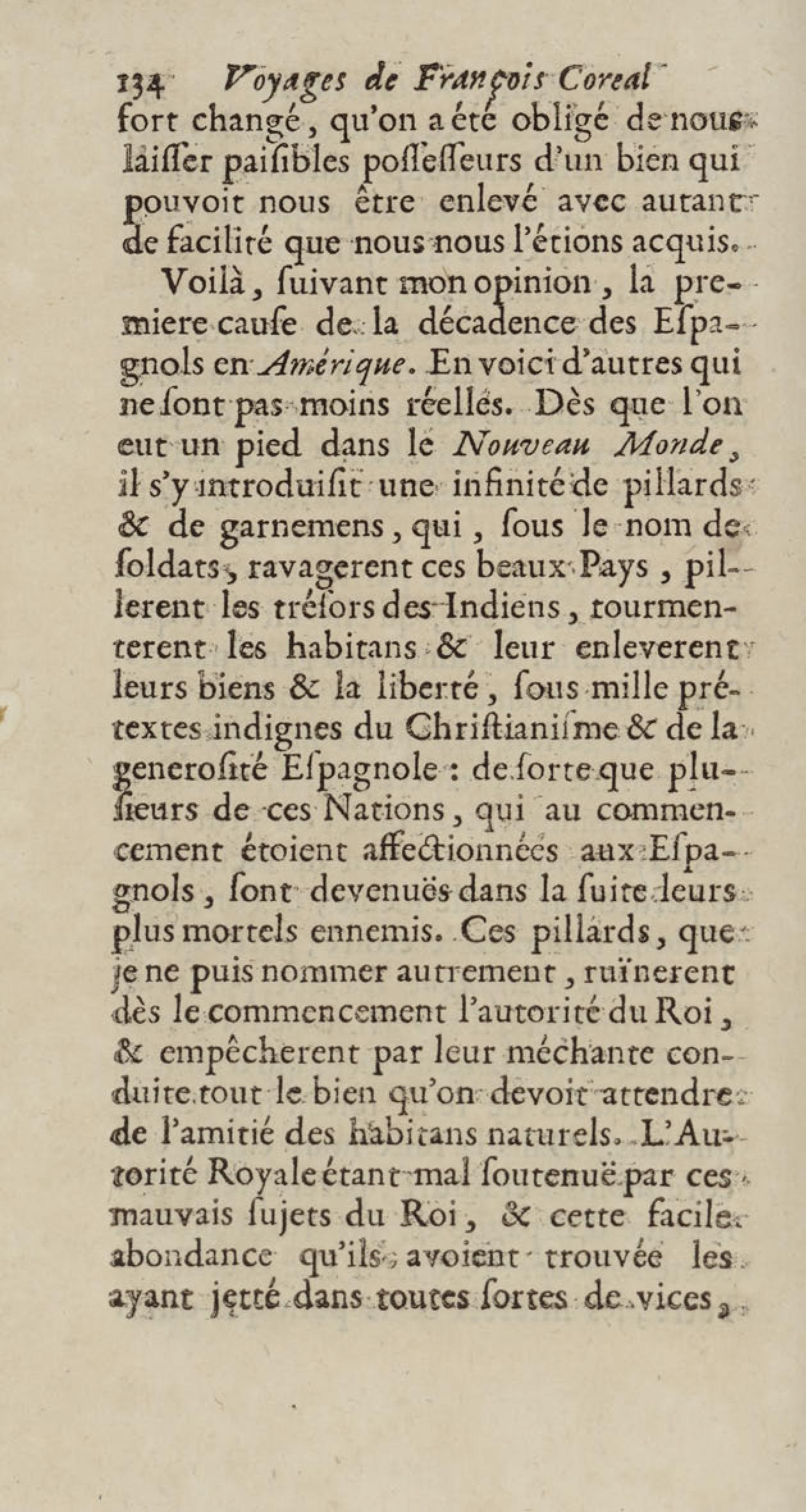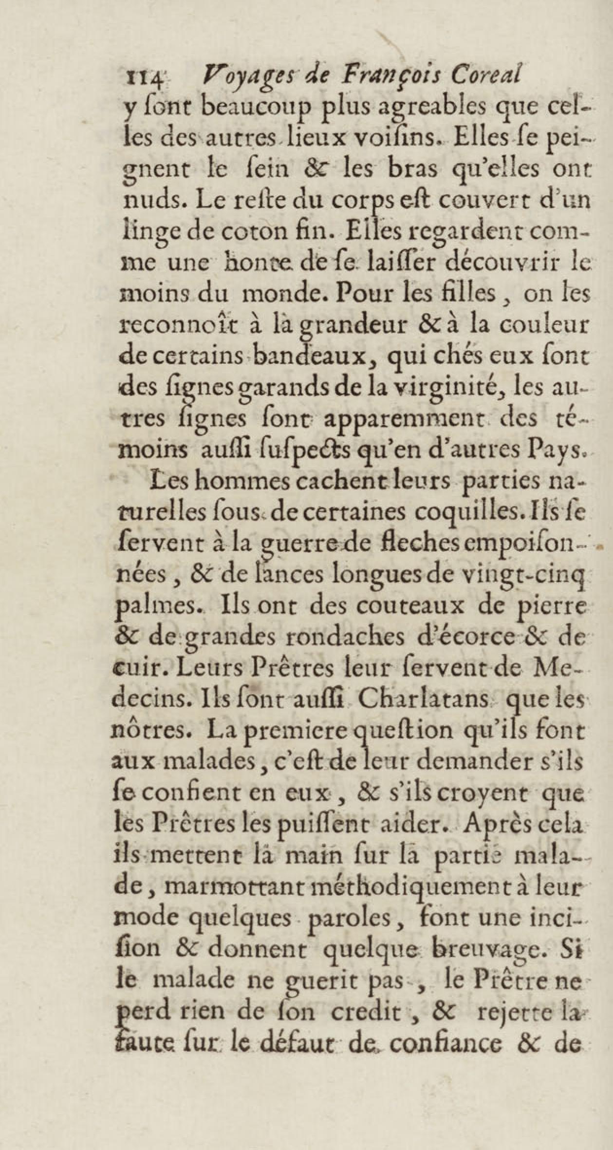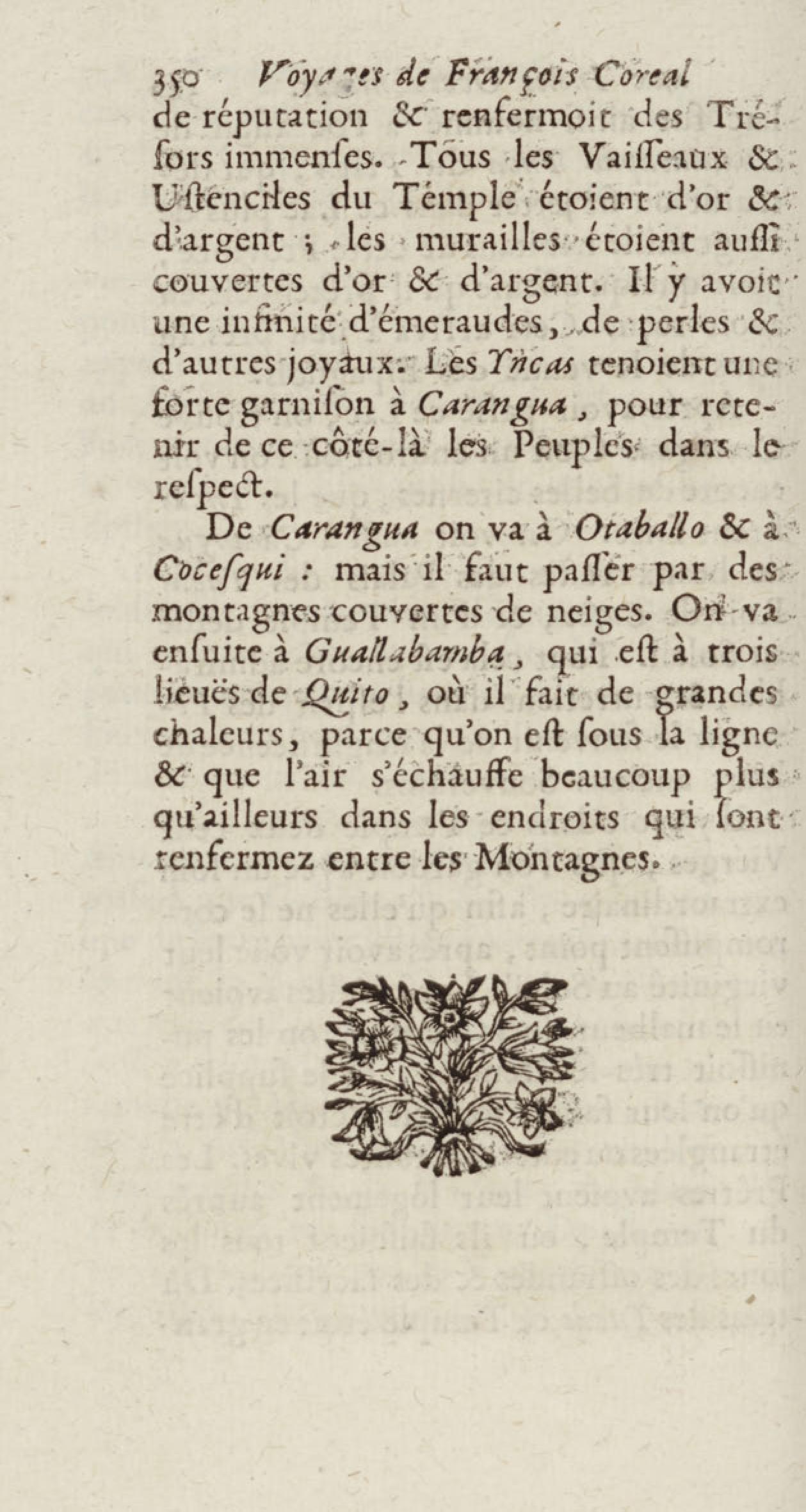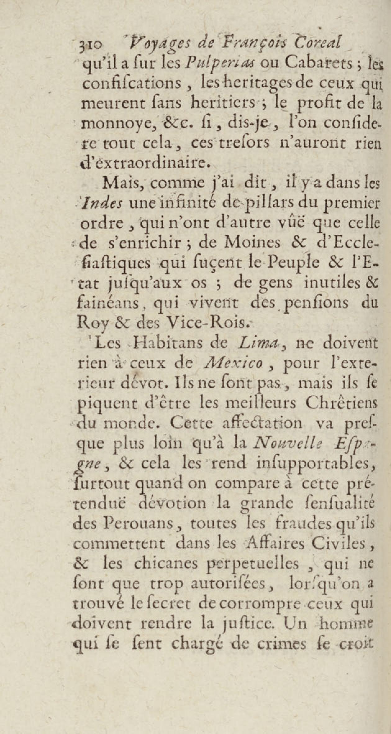 - Voyages de François Coreal aux Indes occidentales, contenant ce qu'il y a vû de plus remarquable pendant son séjour depuis 1666 jusqu'en 1697 : traduits de l'espagnol : avec une relation de la Guiane de Walter Raleigh, & le voyage de Narbrough à la mer du sud par le détroit de Magellan, &c. : nouvelle édition revûë, corrigée, & augmentée d'une nouvelle Découverte des Indes méridionales & des terres australes, enrichie de figures. Tome premier