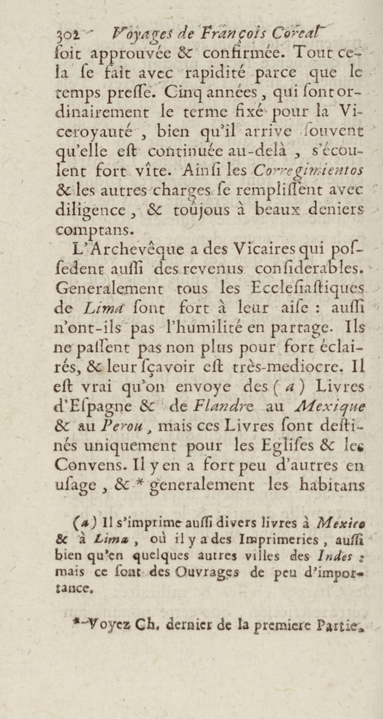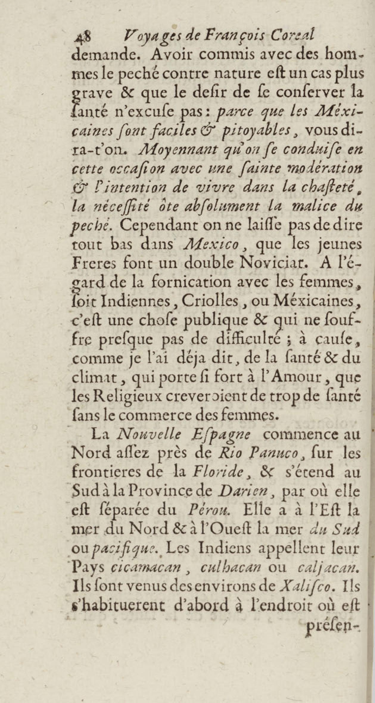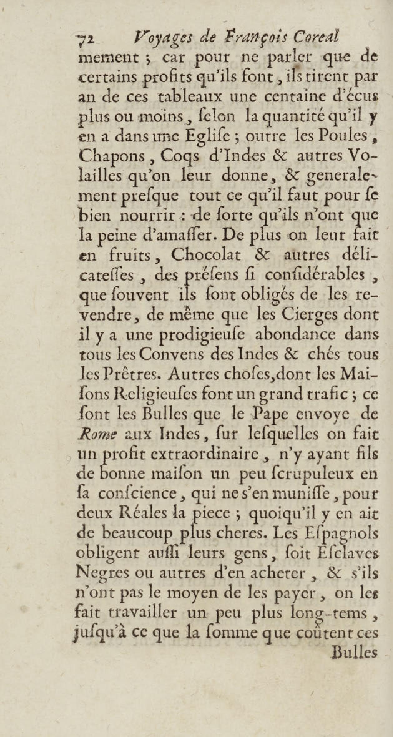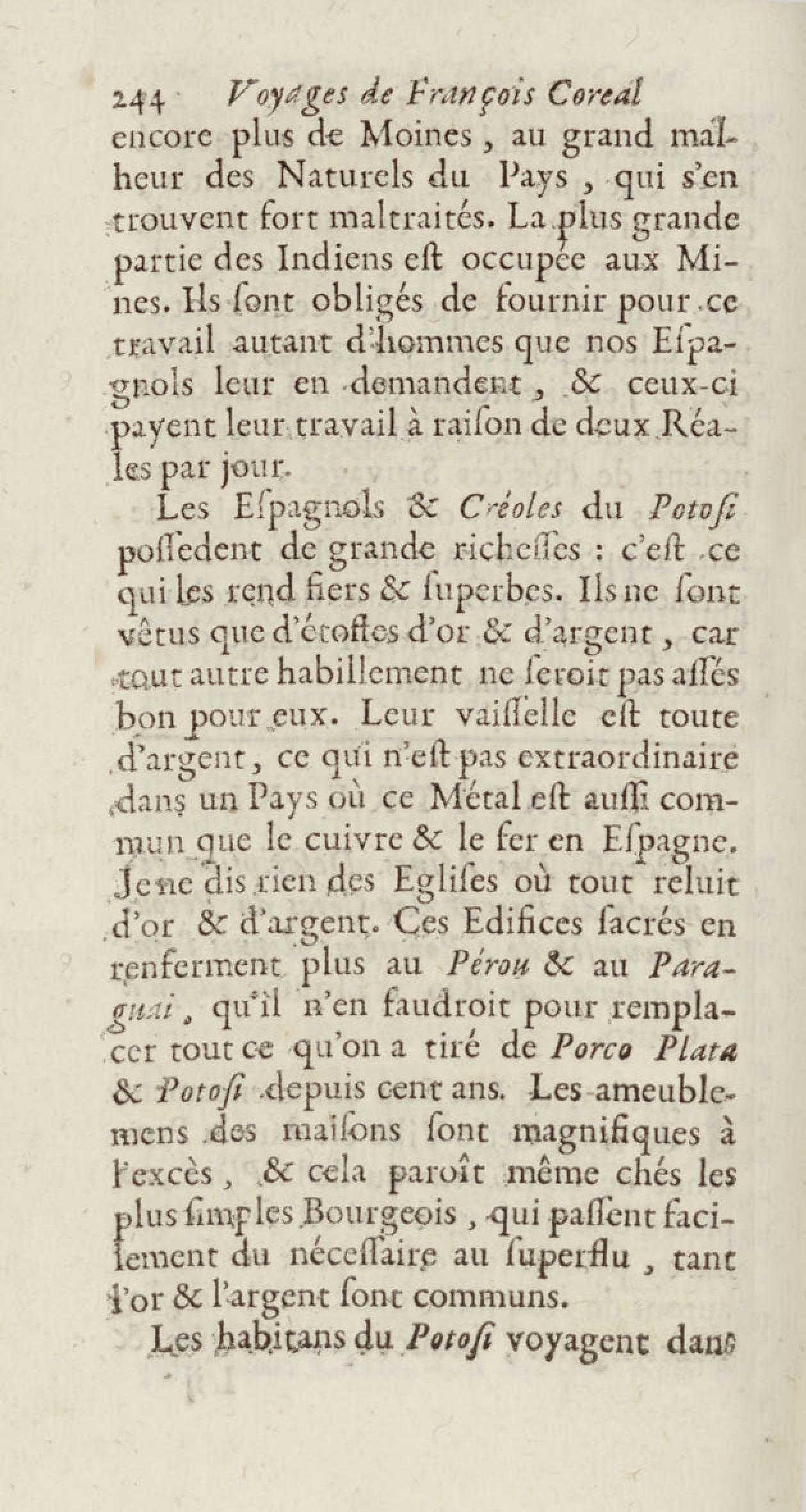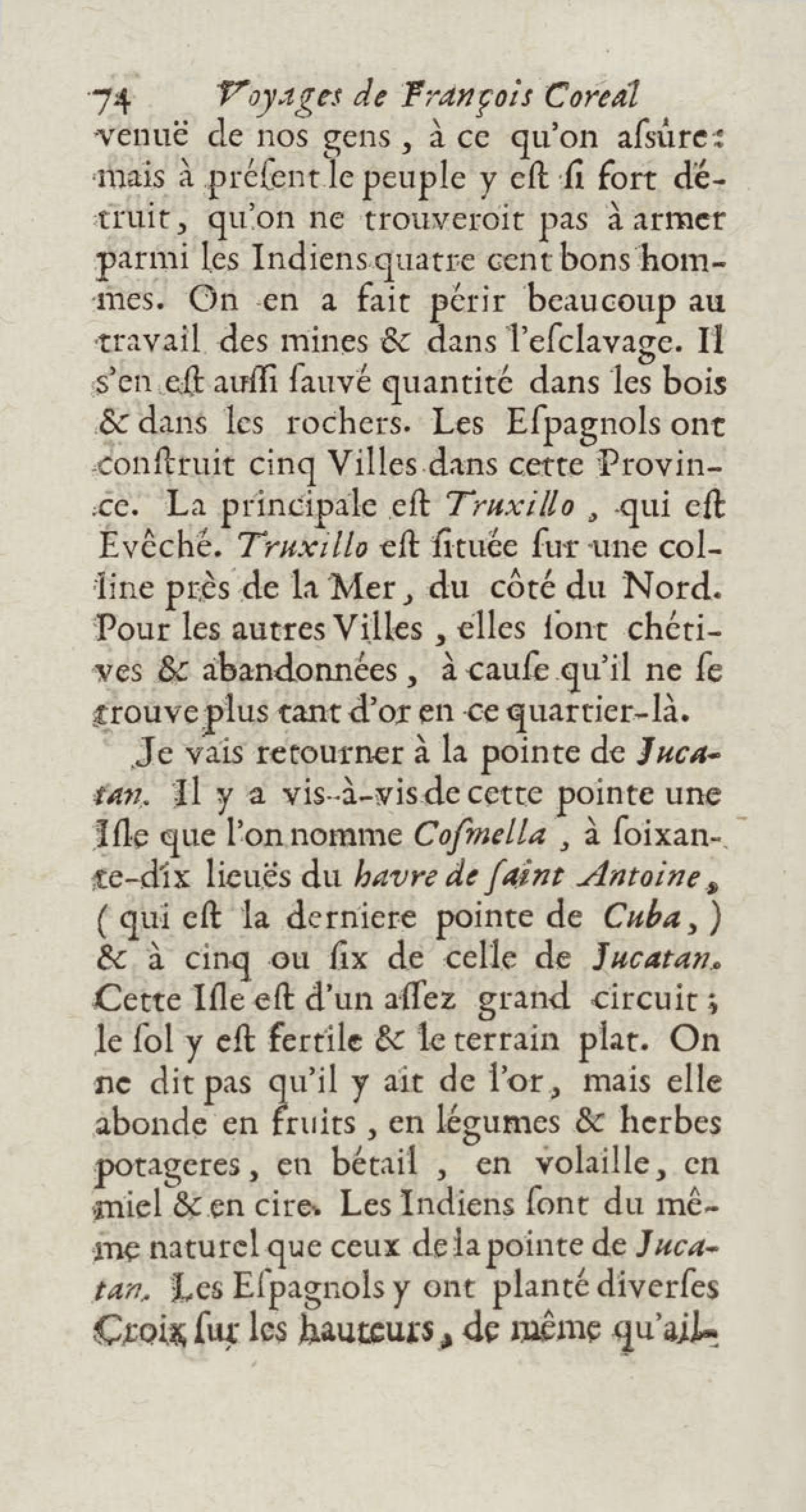 - Voyages de François Coreal aux Indes occidentales, contenant ce qu'il y a vû de plus remarquable pendant son séjour depuis 1666 jusqu'en 1697 : traduits de l'espagnol : avec une relation de la Guiane de Walter Raleigh, & le voyage de Narbrough à la mer du sud par le détroit de Magellan, &c. : nouvelle édition revûë, corrigée, & augmentée d'une nouvelle Découverte des Indes méridionales & des terres australes, enrichie de figures. Tome premier
