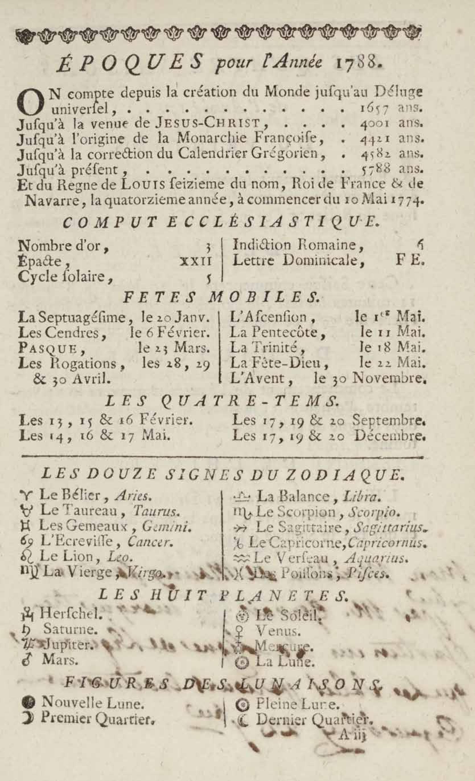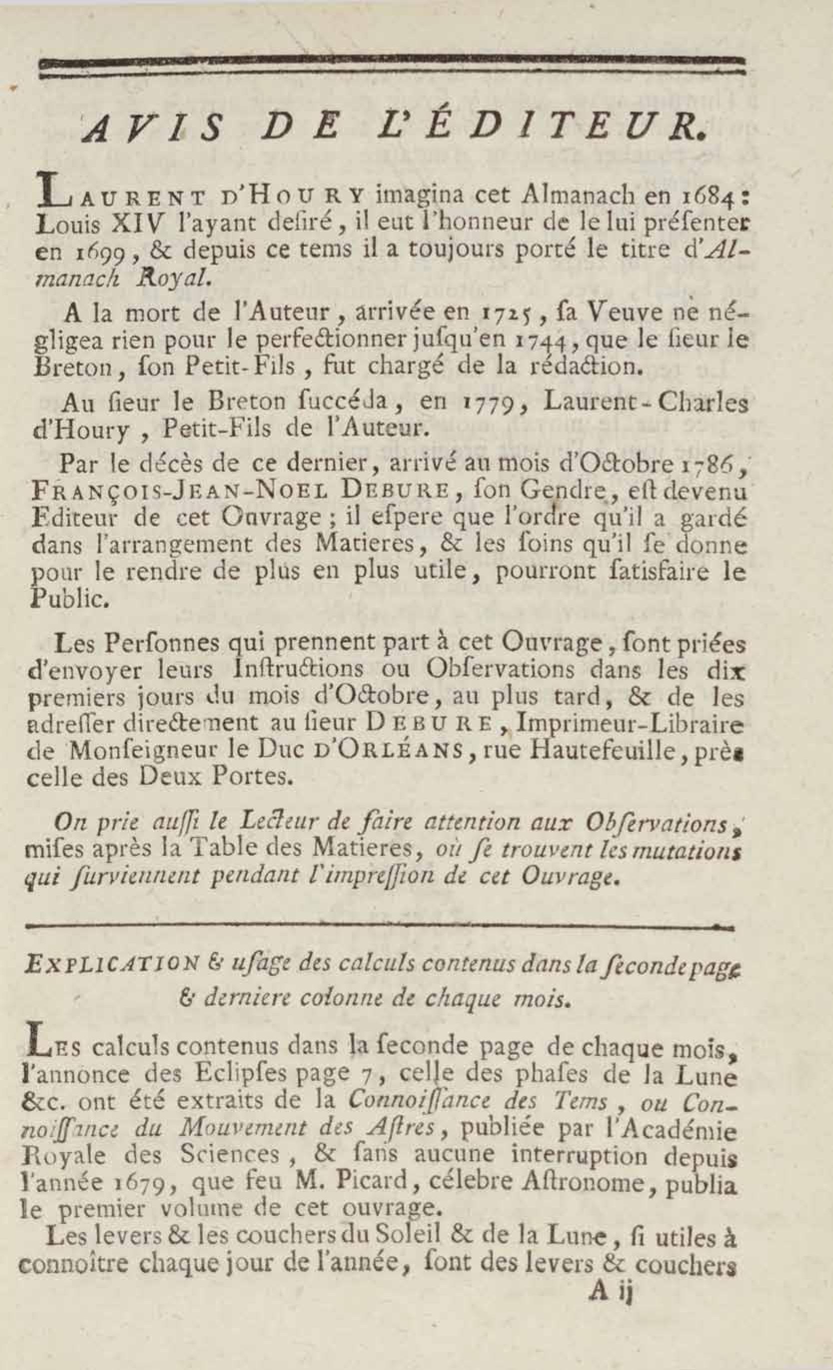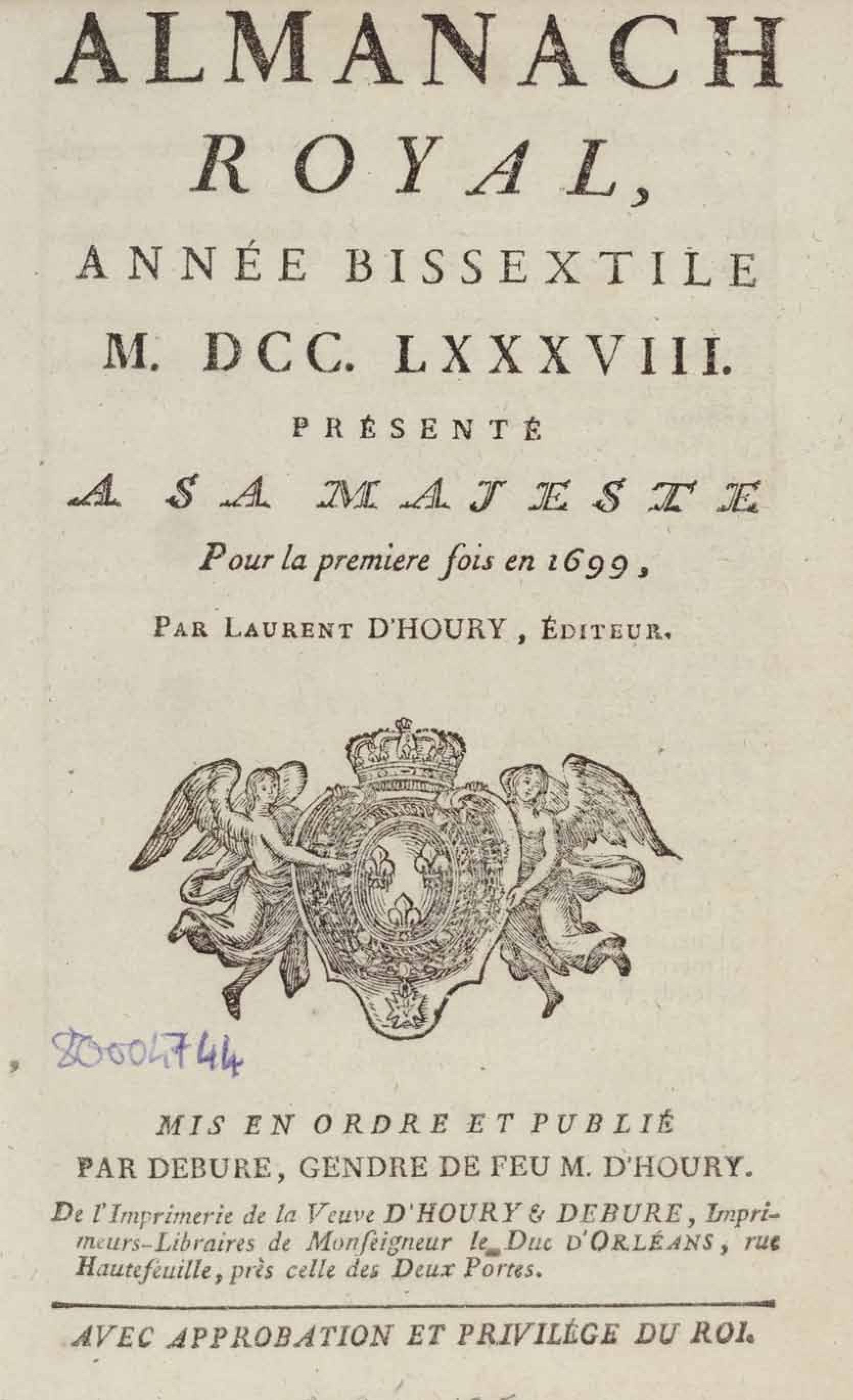 Almanach royal, année bissextile M.DCC.LXXXVIII présenté à sa majesté pour la première fois en 1699