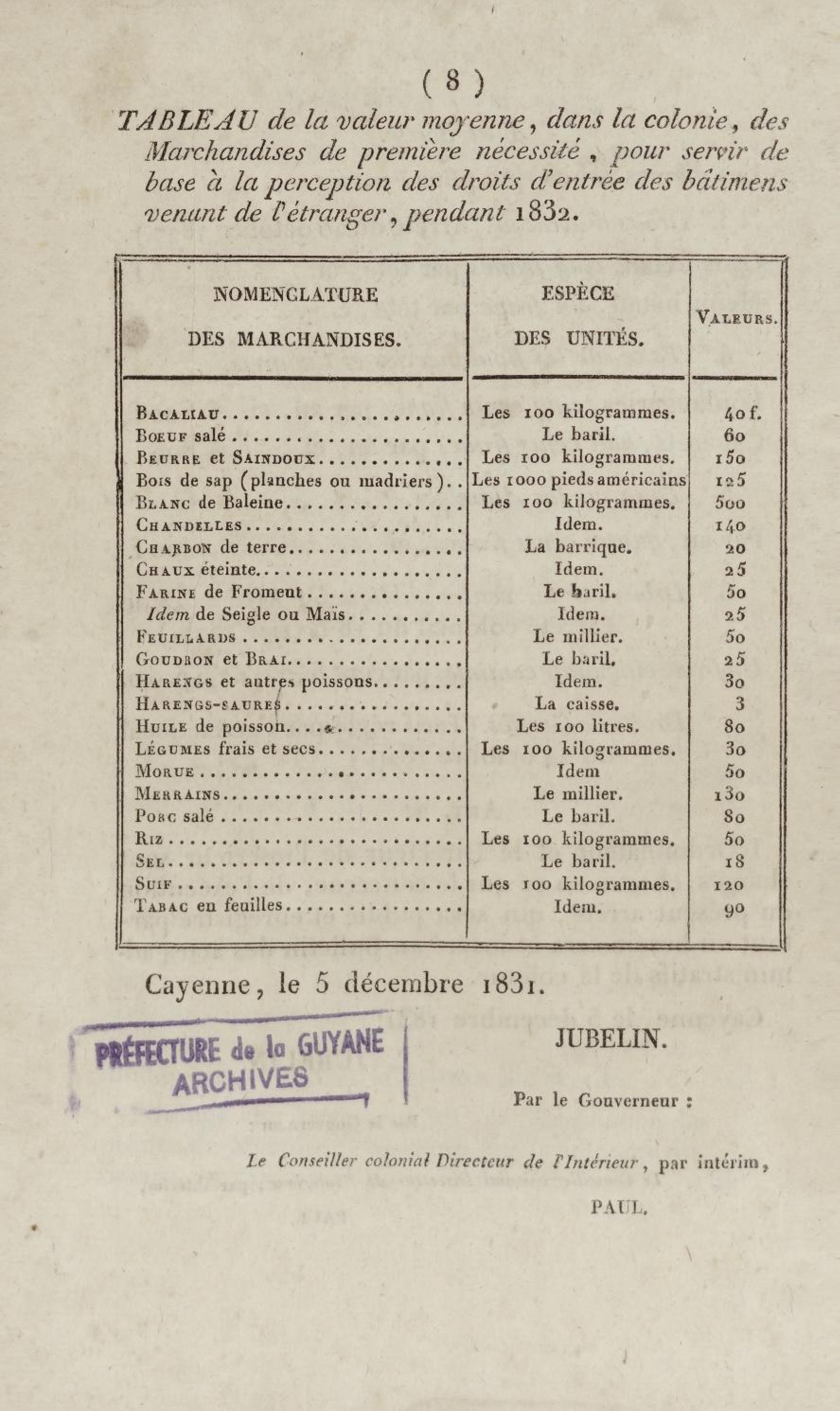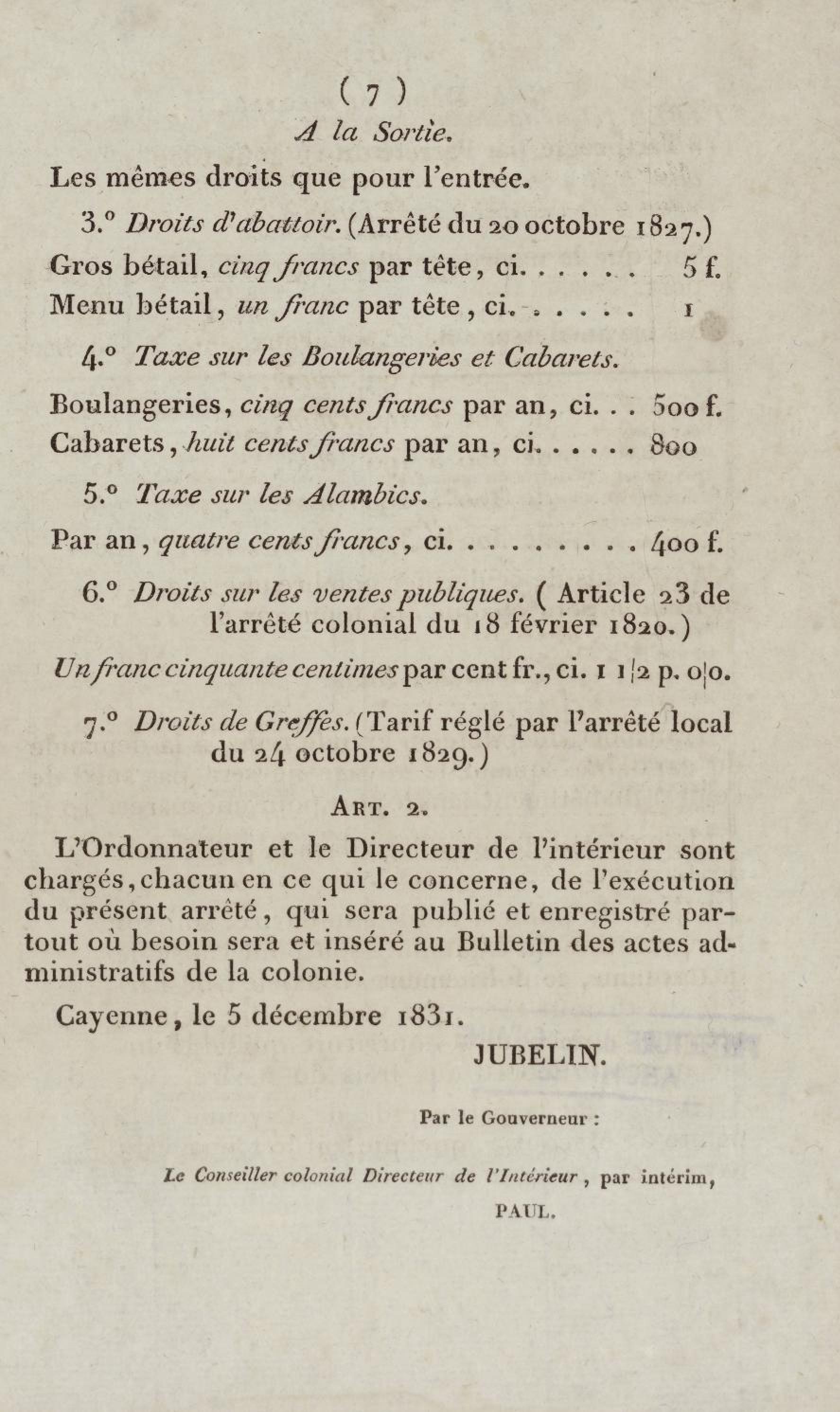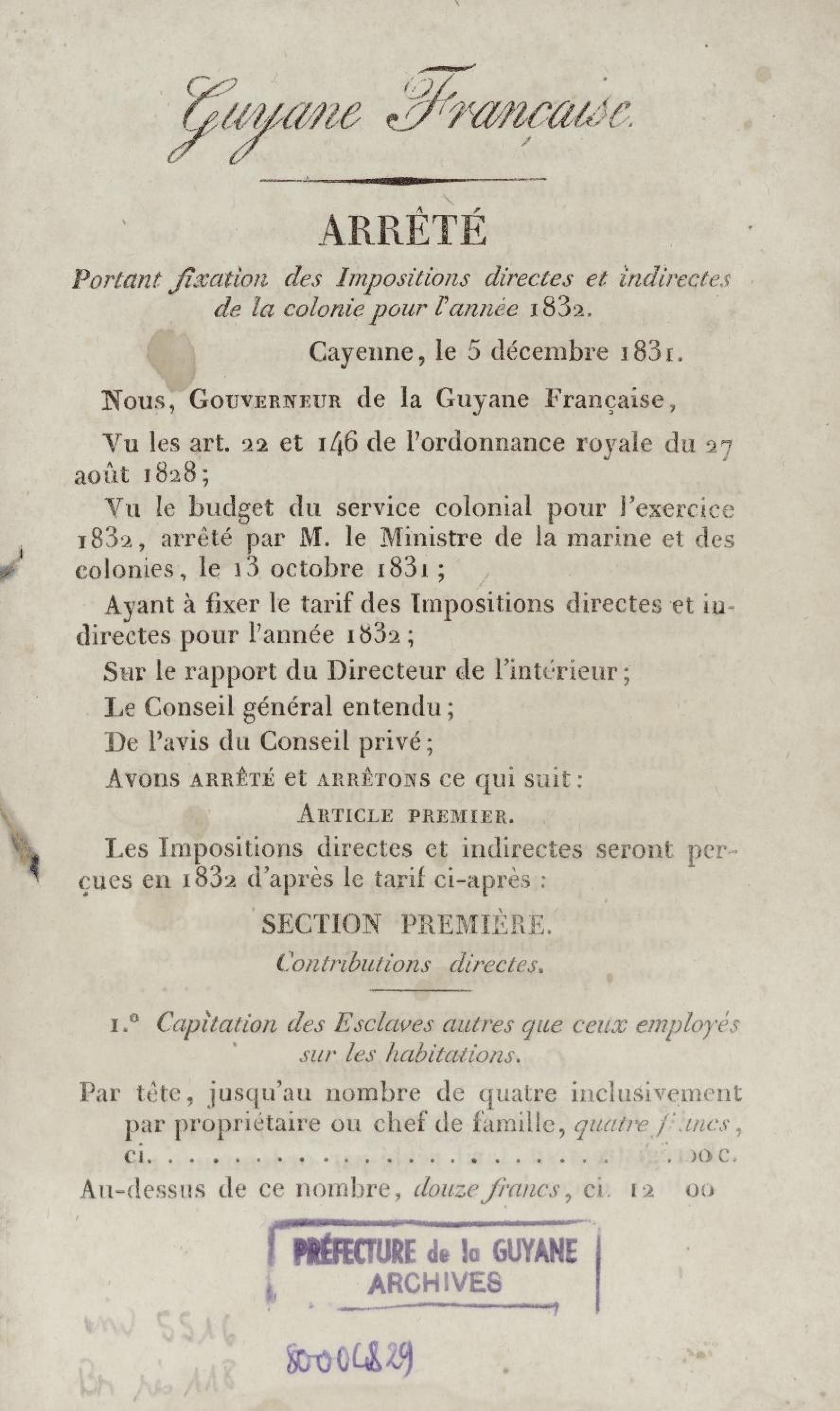 - Arrêté portant fixation des impositions directes et indirectes de la colonie pour l'année 1832