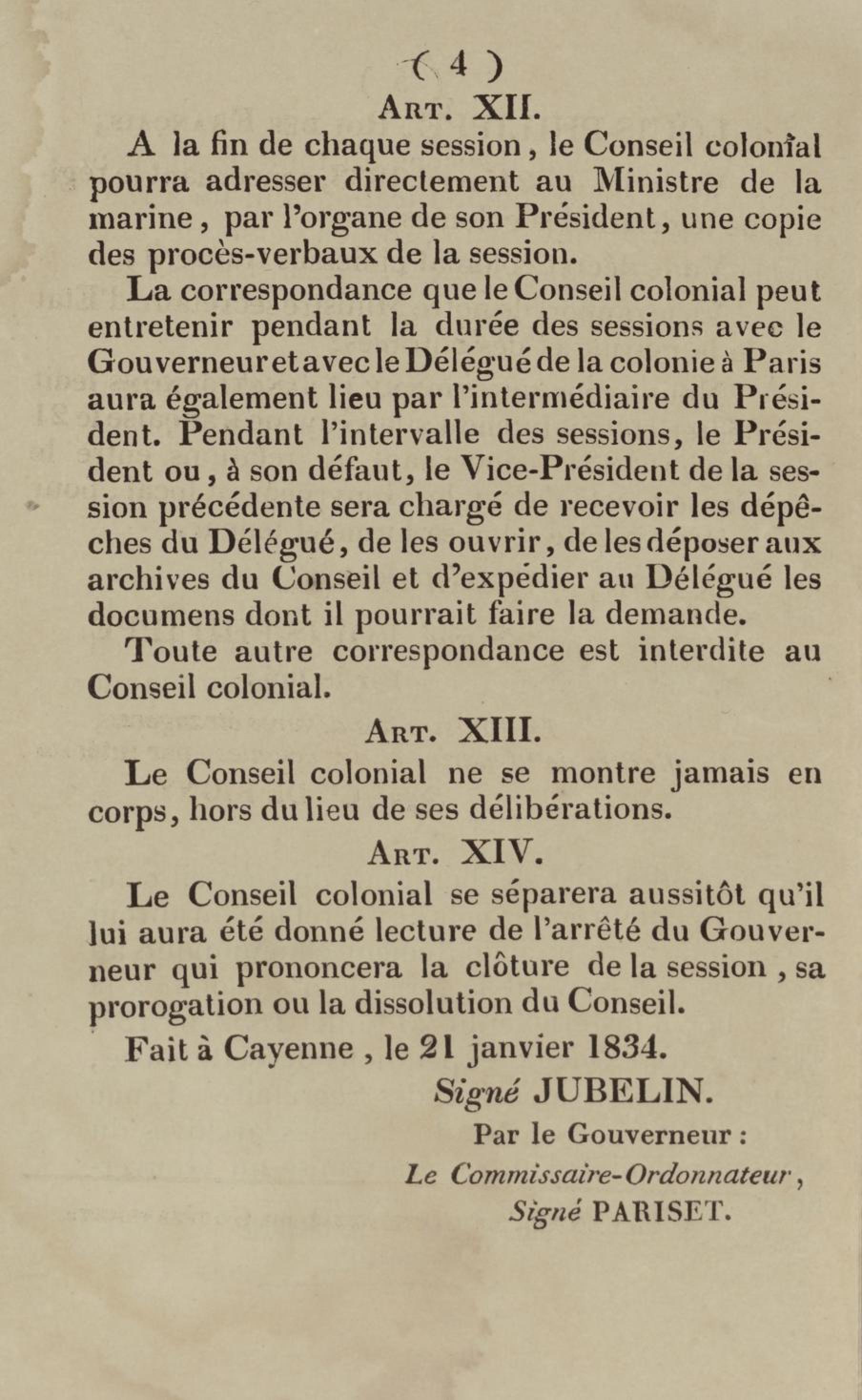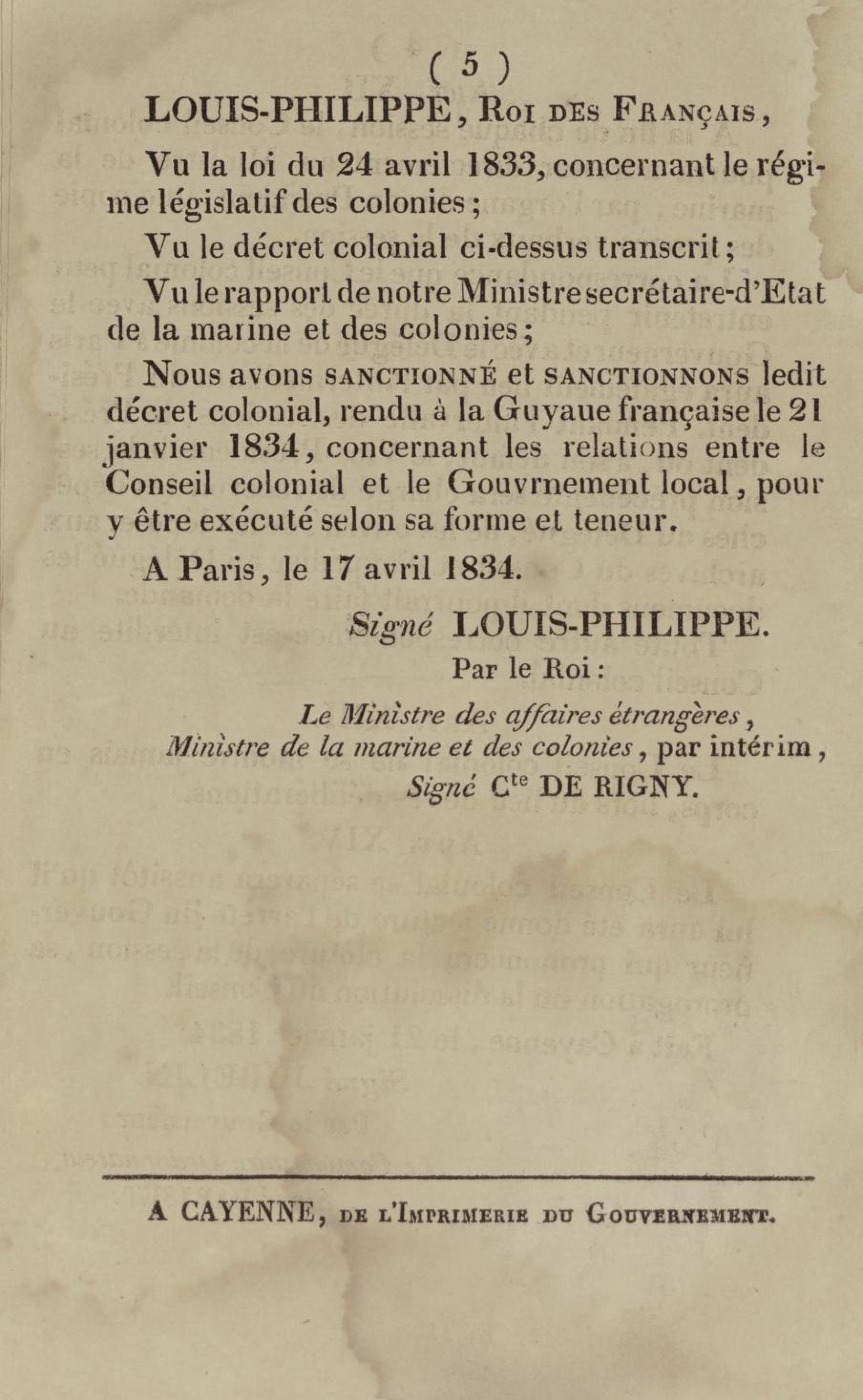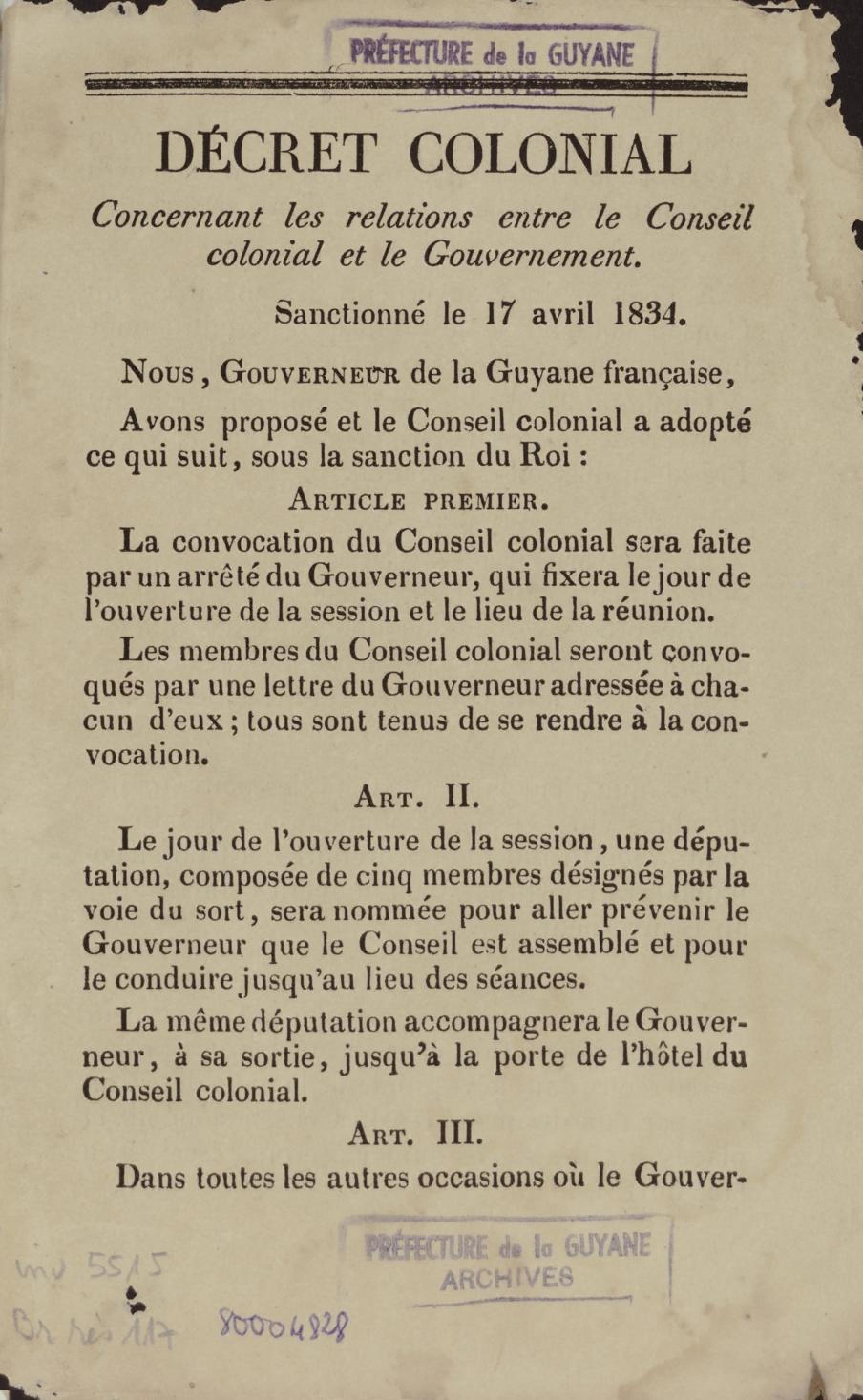 - Décret colonial concernant les relations entre le conseil colonial et le gouvernement : sanctionné le 17 avril 1834