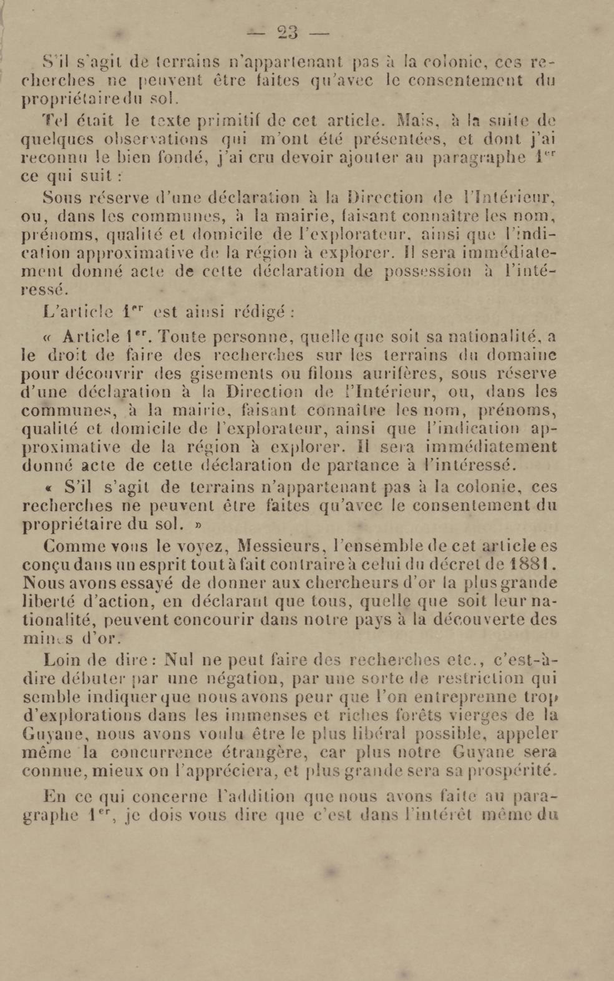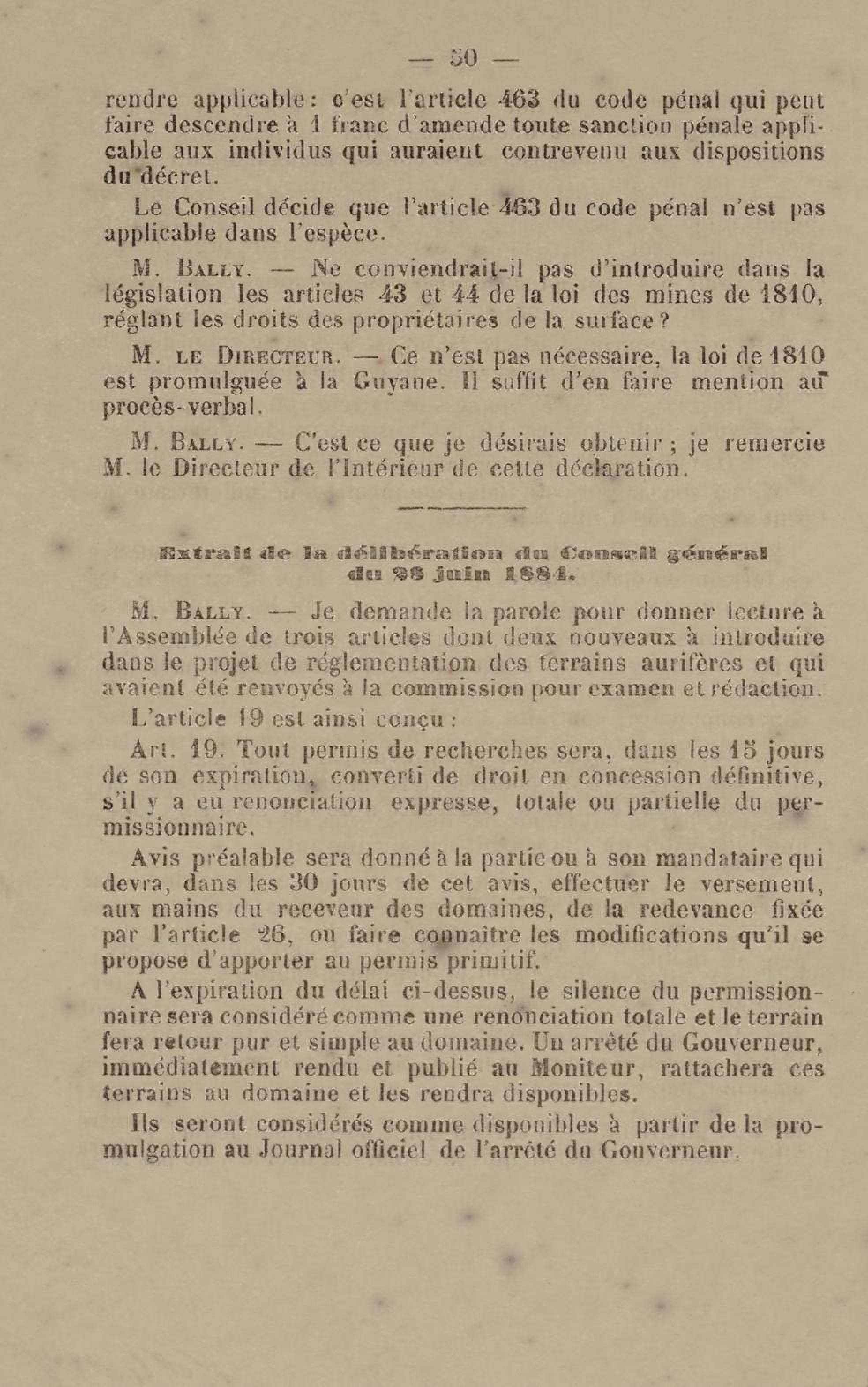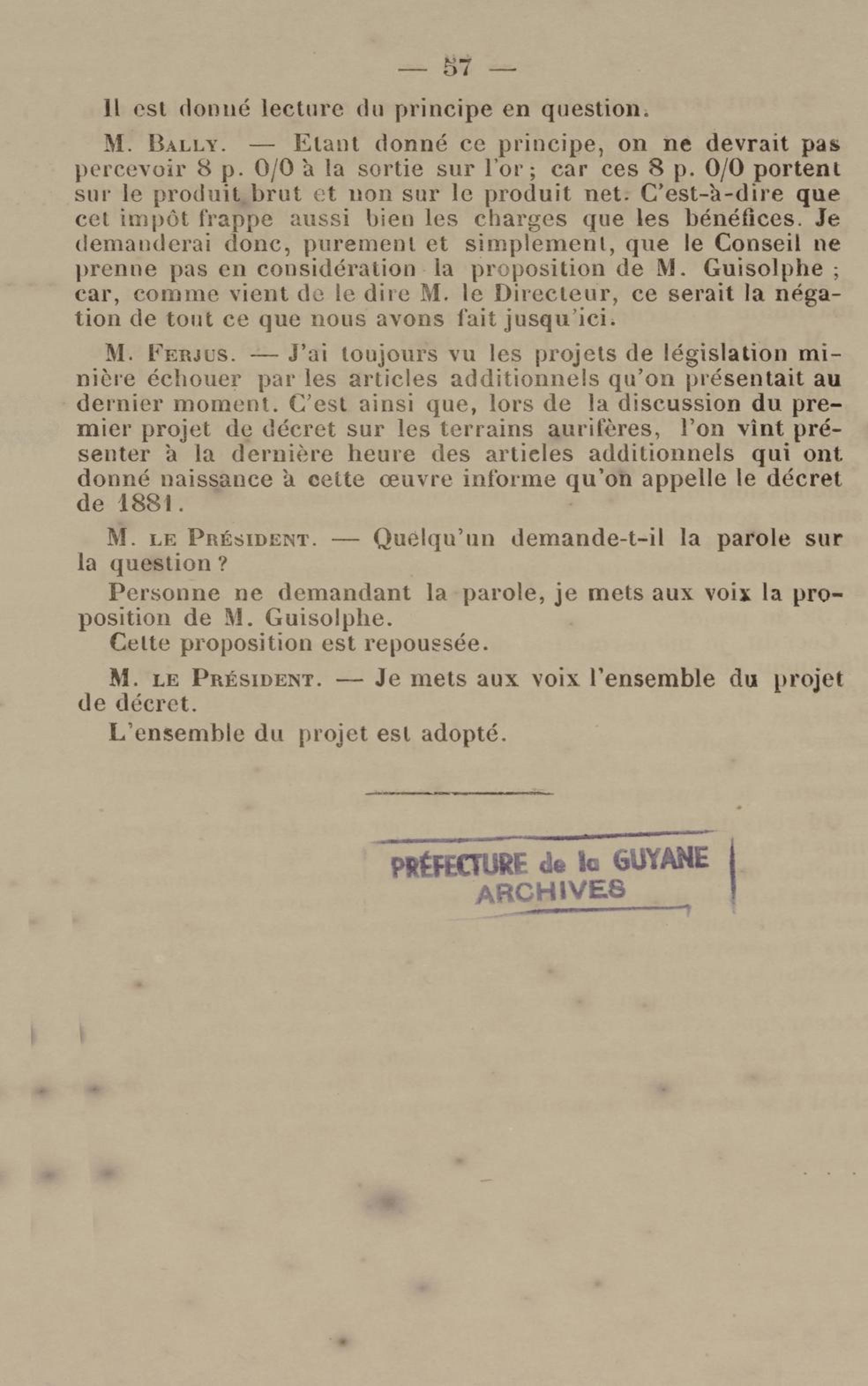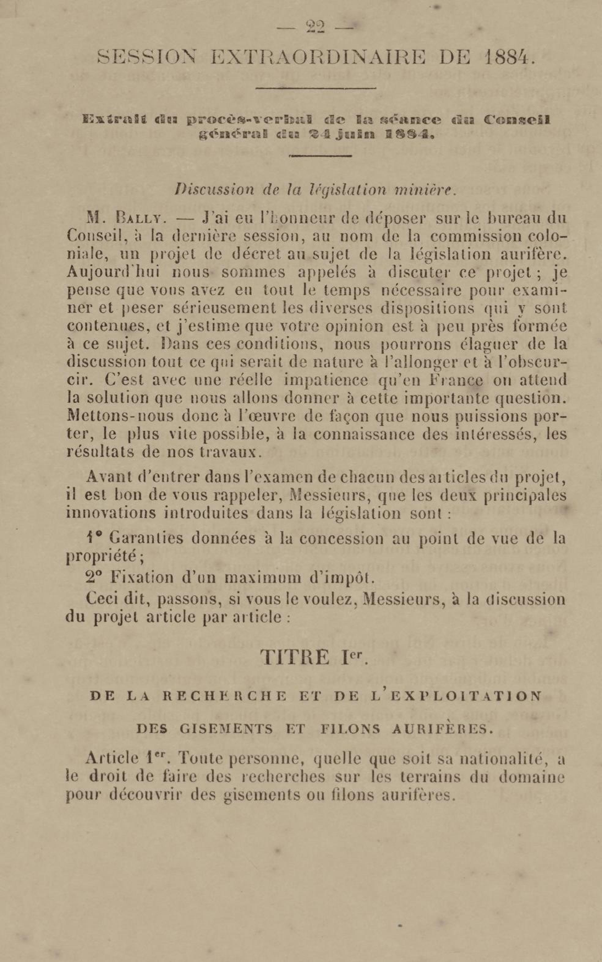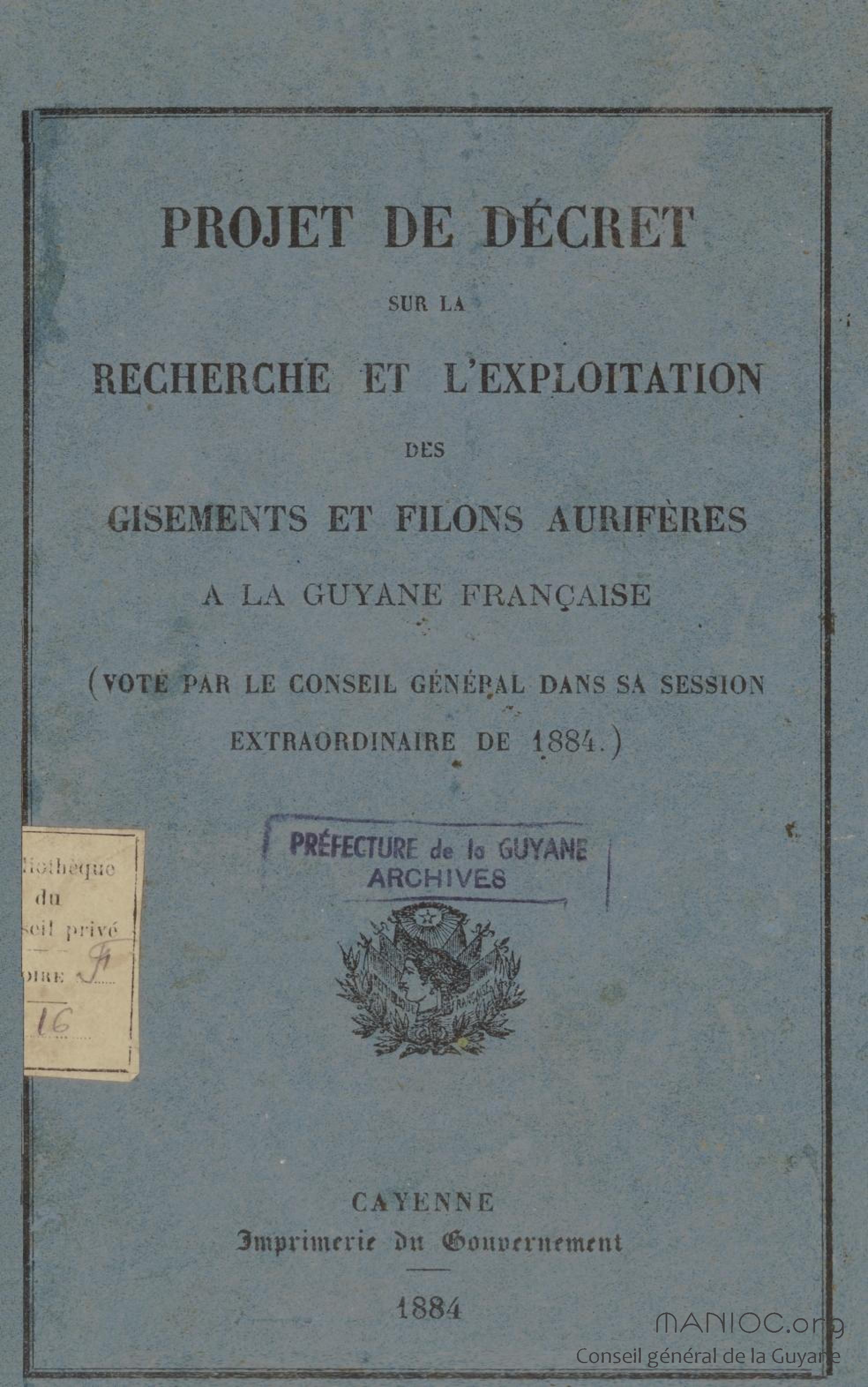 - Projet de décret sur la recherche et l'exploitation des gisements et filons aurifères à la Guyane française : voté par le Conseil général dans sa session extraordinaire de 1884