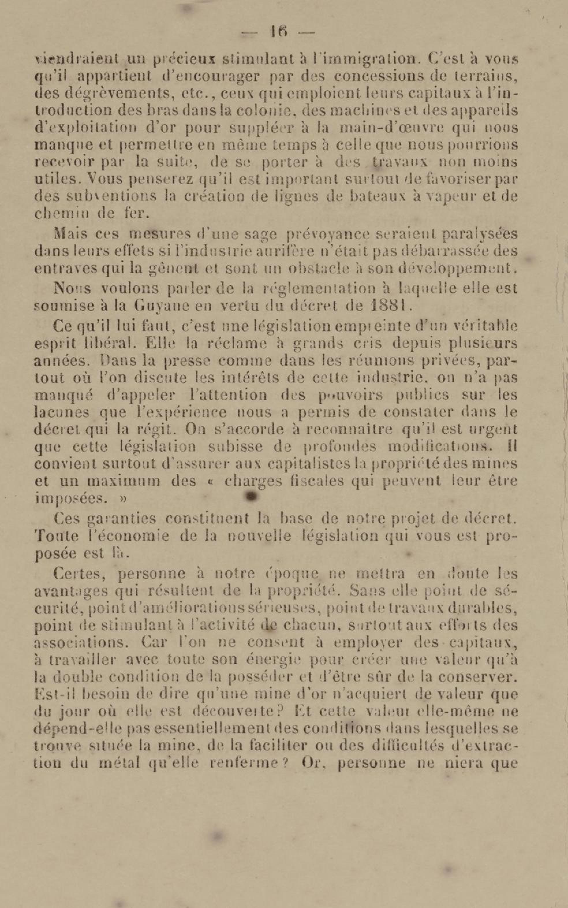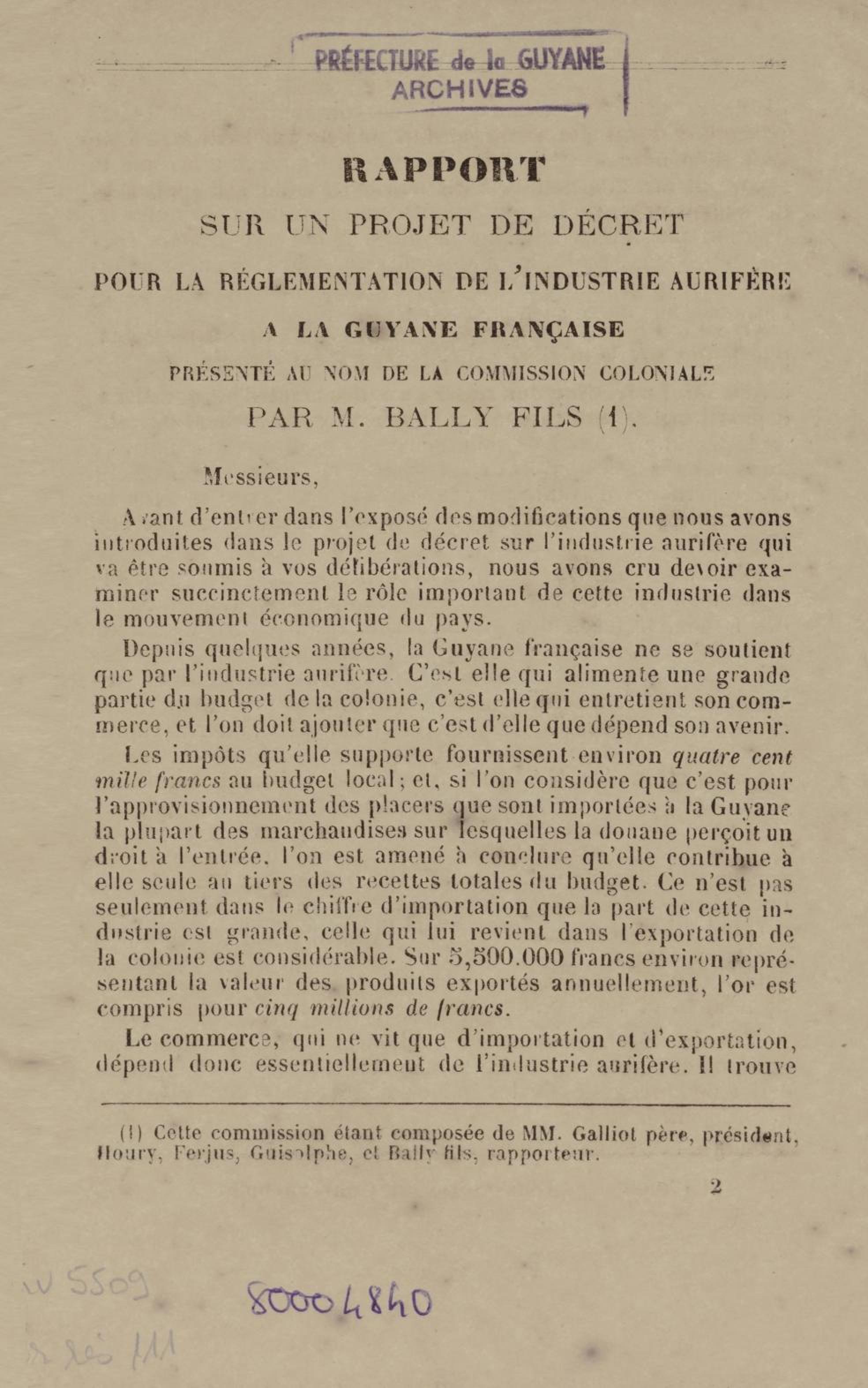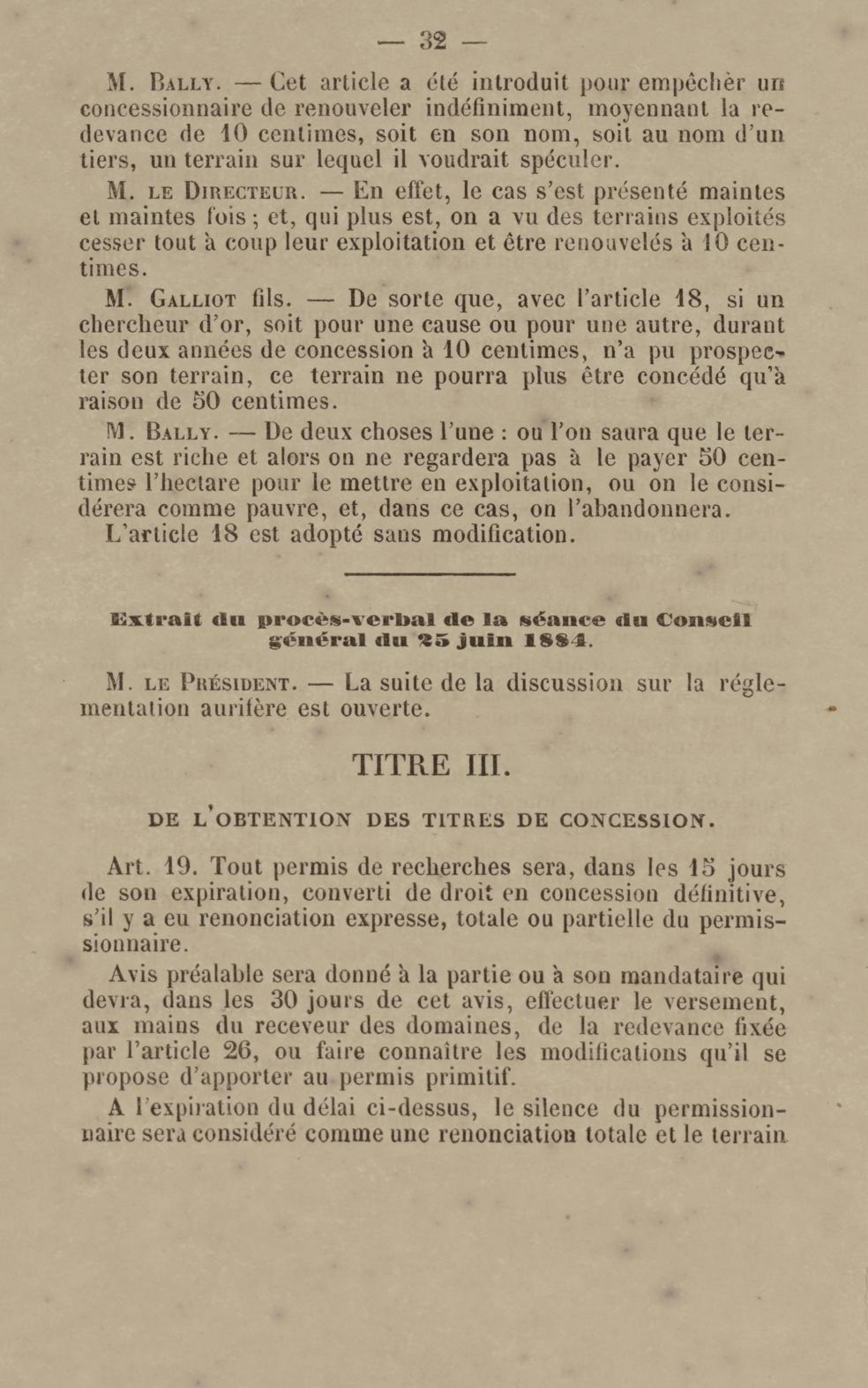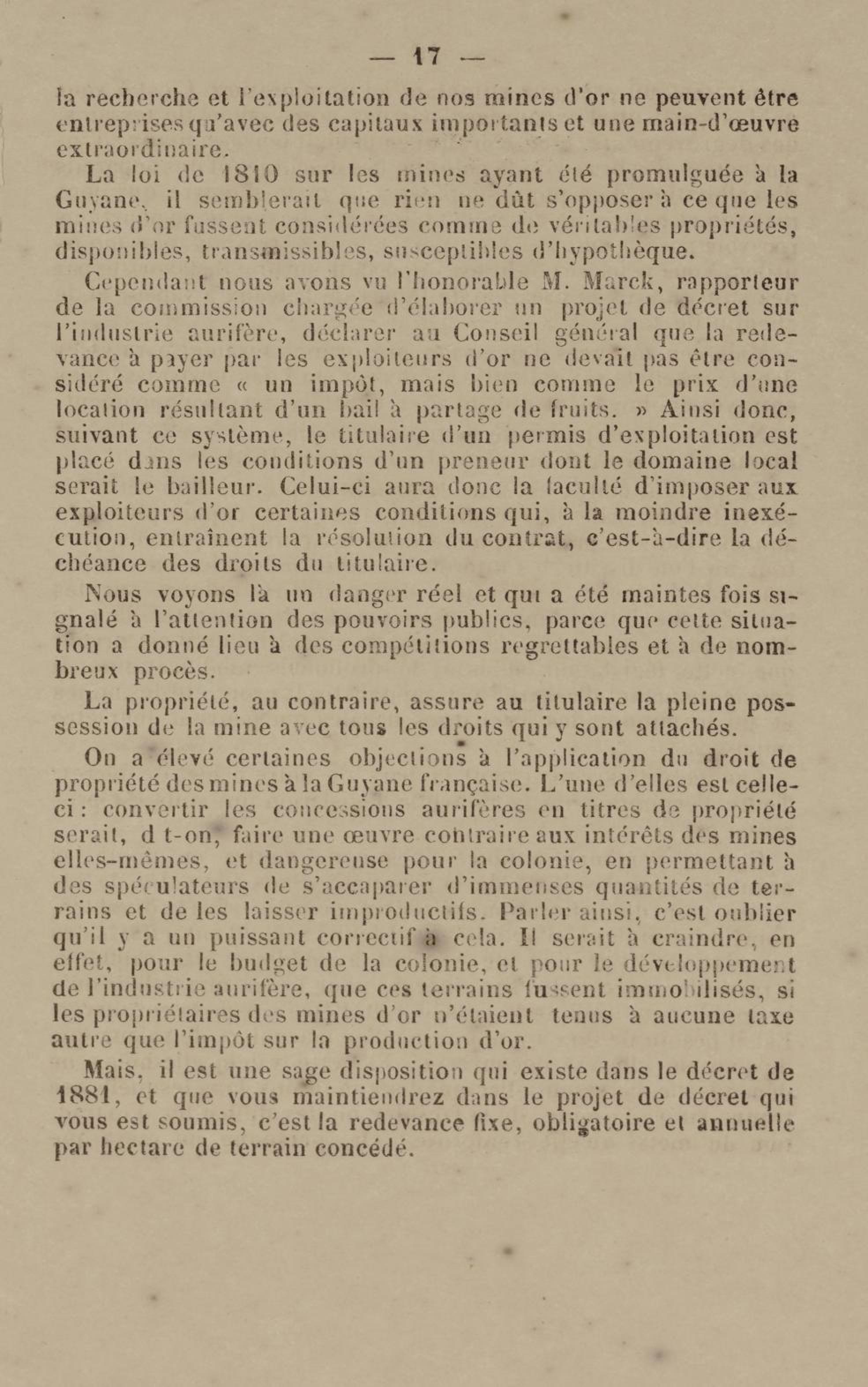 - Projet de décret sur la recherche et l'exploitation des gisements et filons aurifères à la Guyane française : voté par le Conseil général dans sa session extraordinaire de 1884