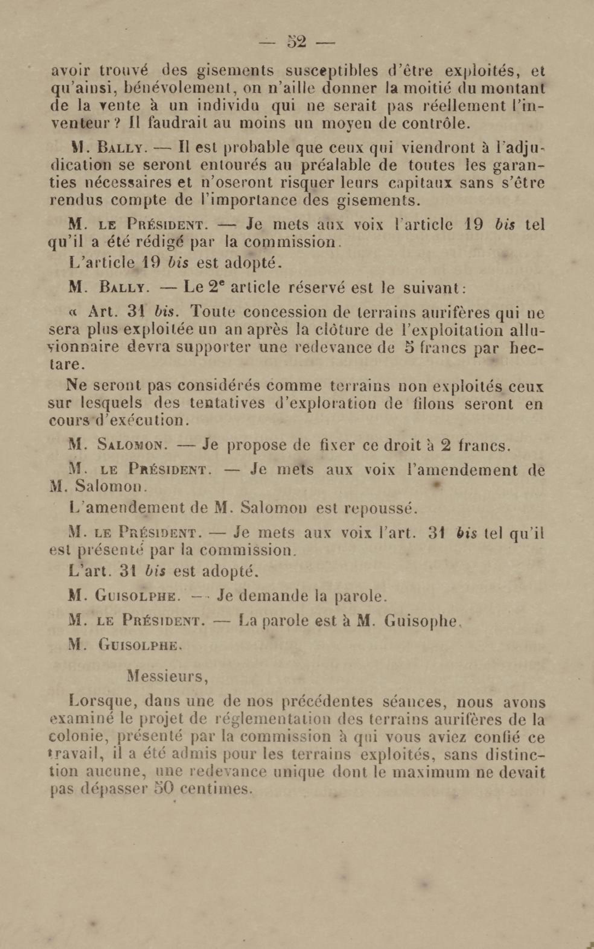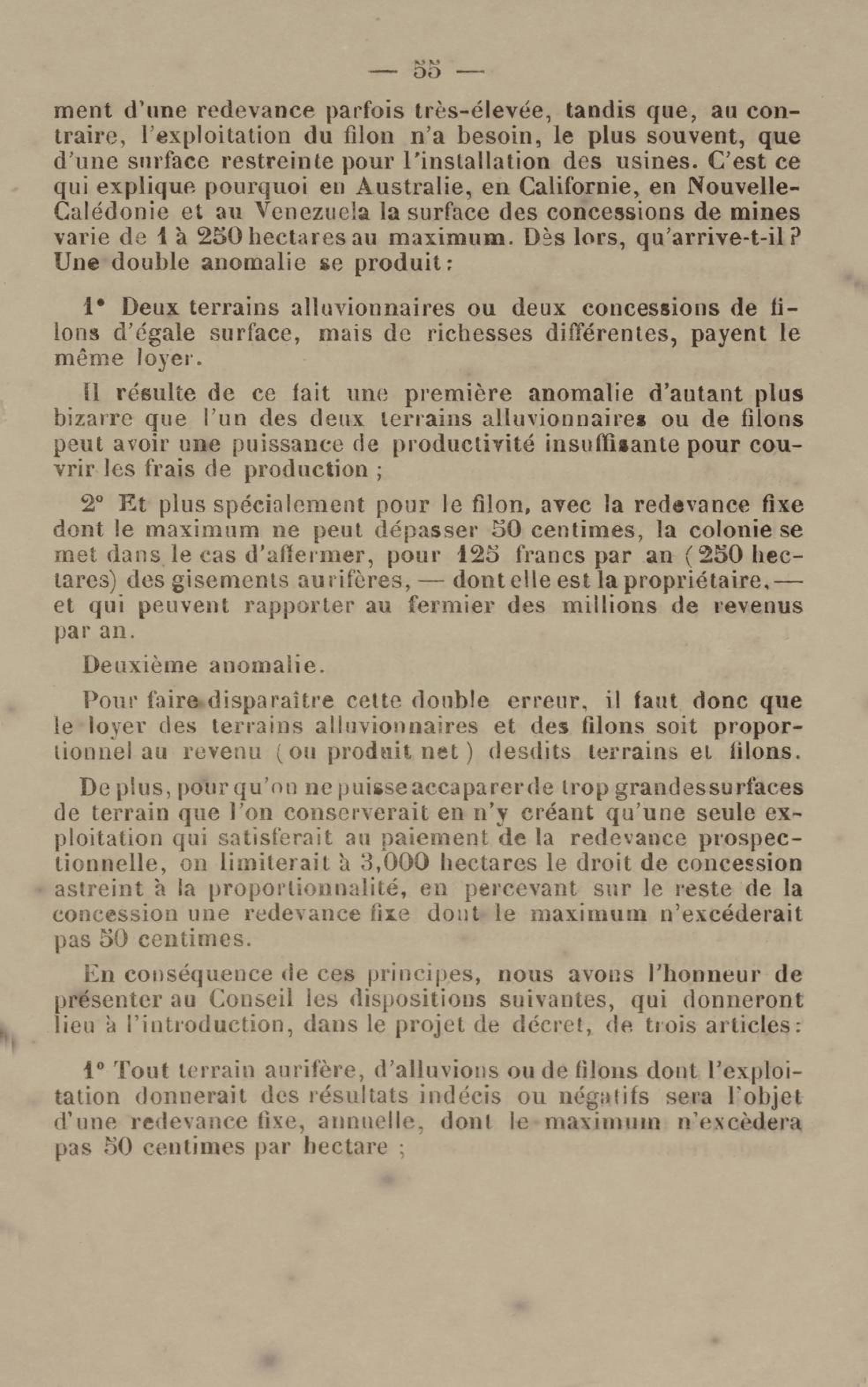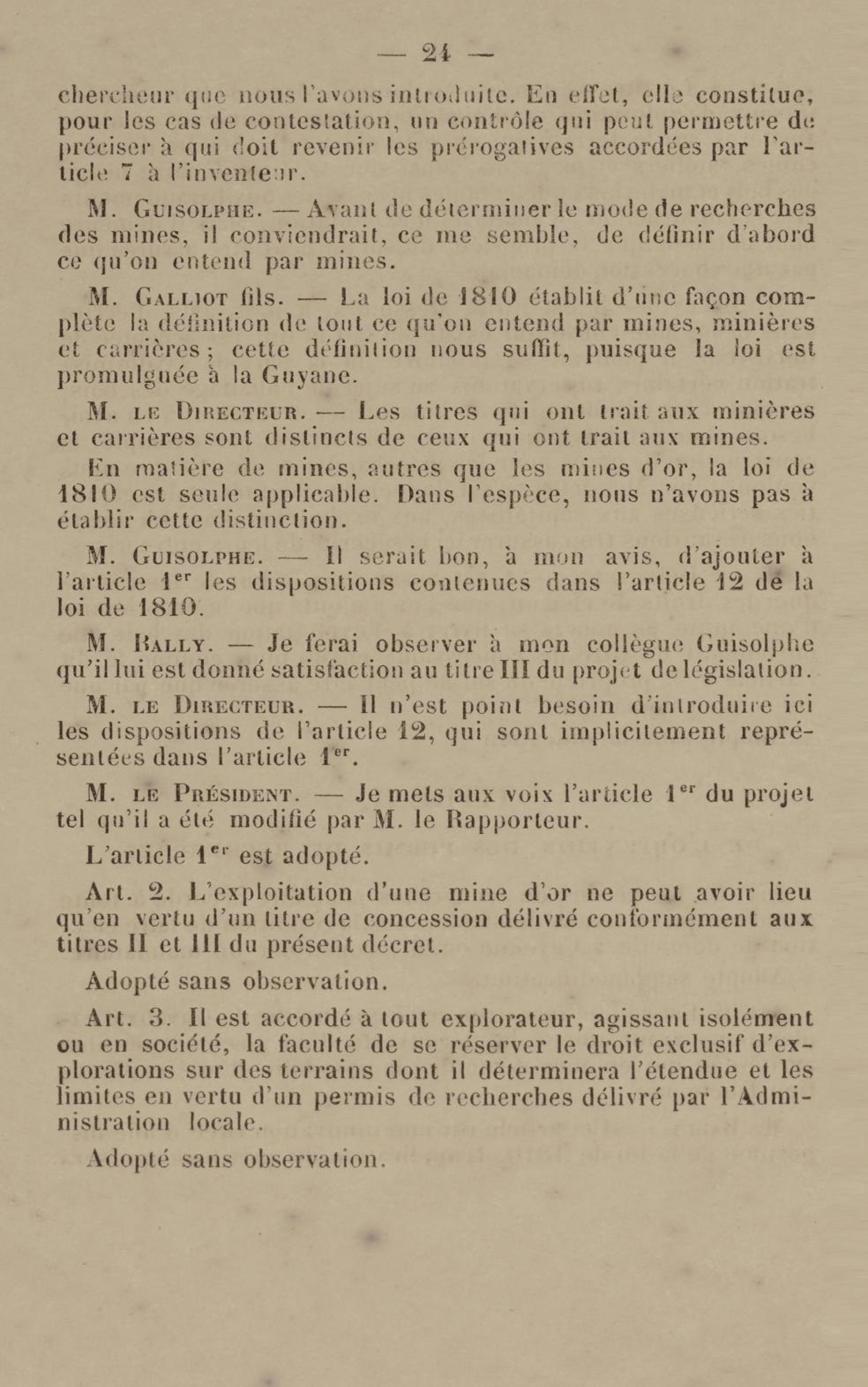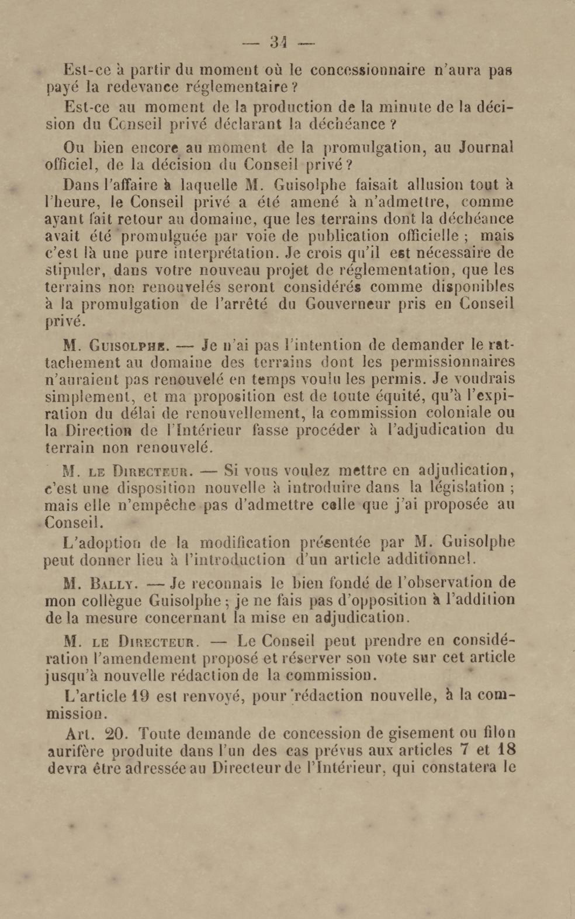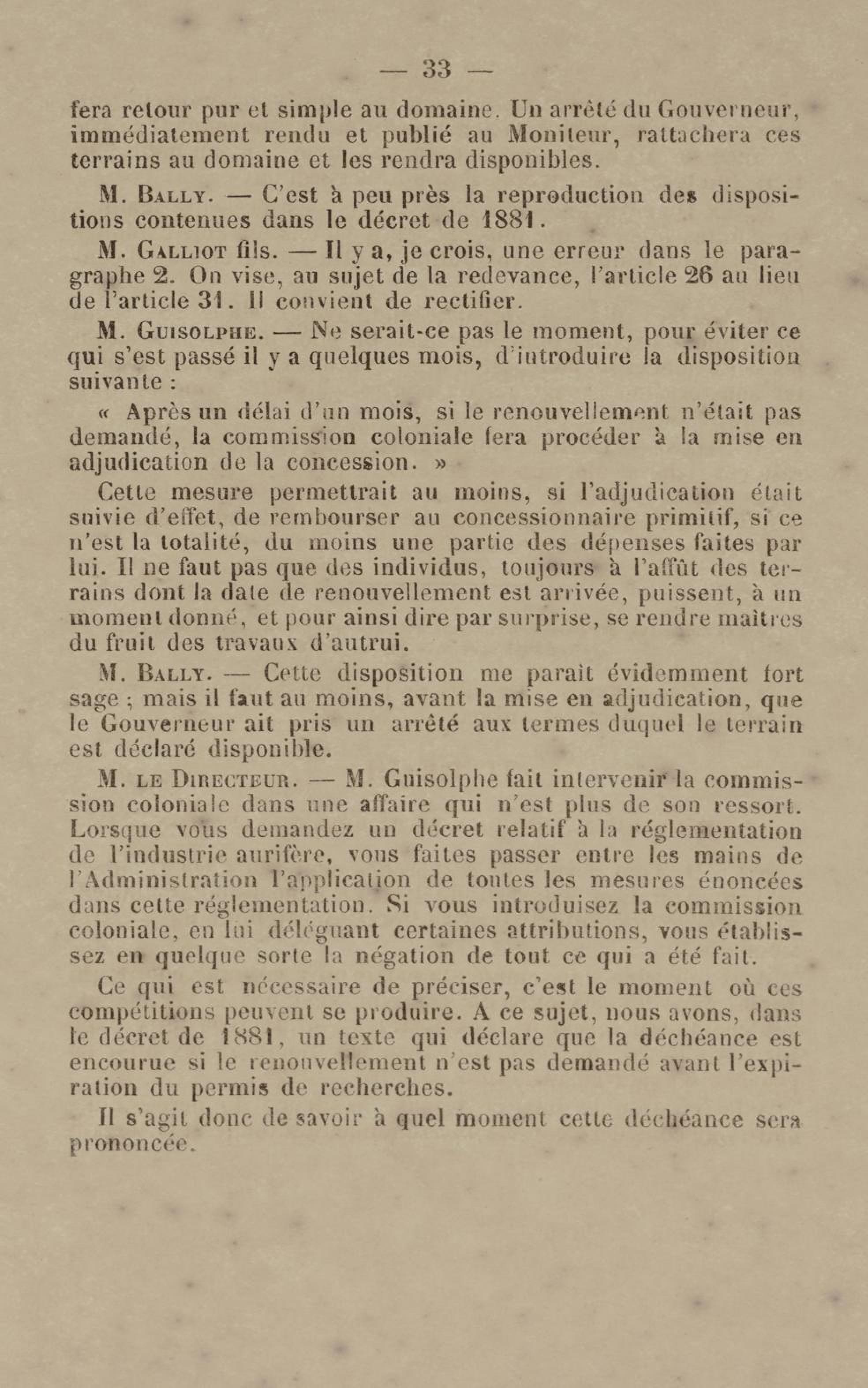 - Projet de décret sur la recherche et l'exploitation des gisements et filons aurifères à la Guyane française : voté par le Conseil général dans sa session extraordinaire de 1884