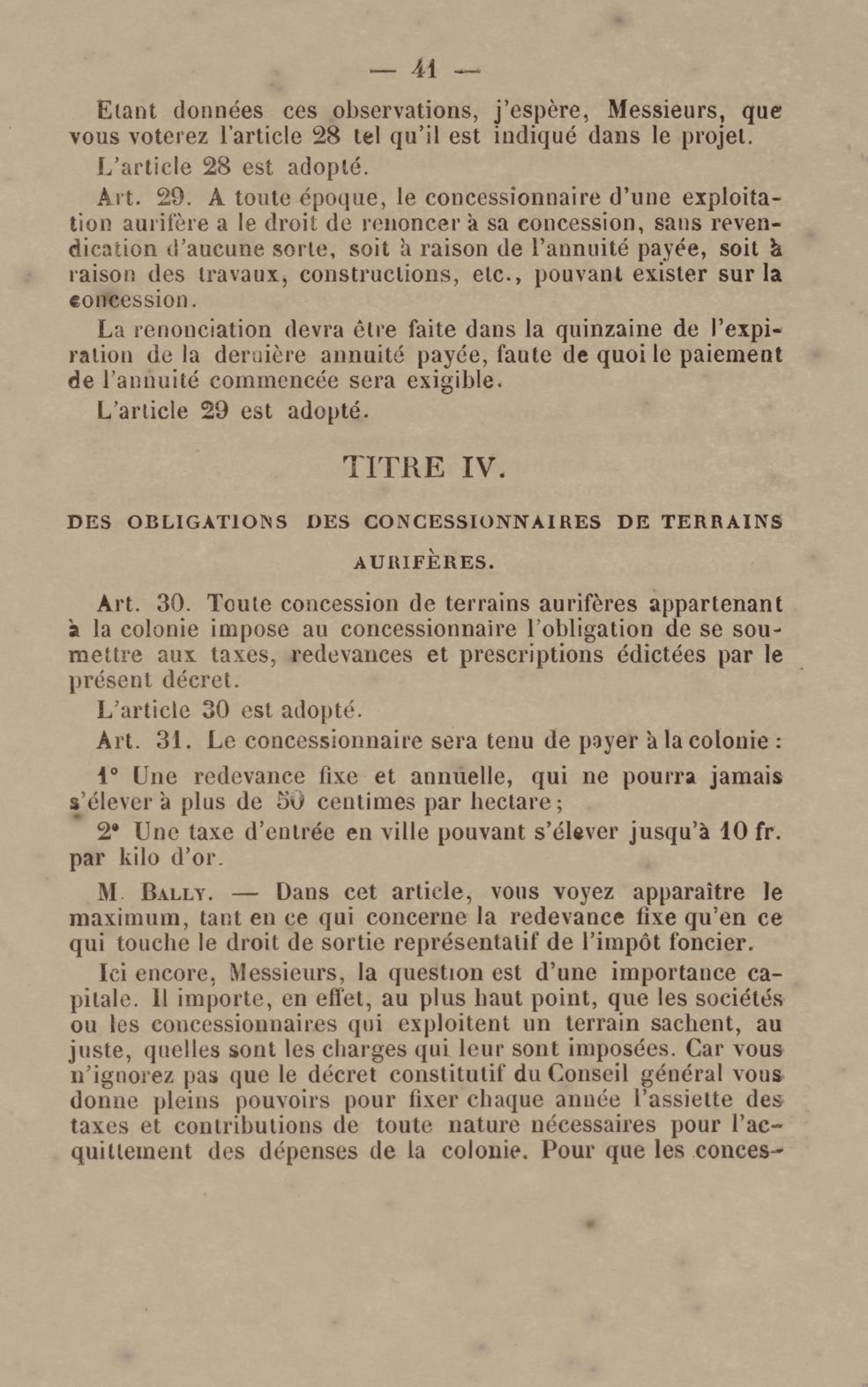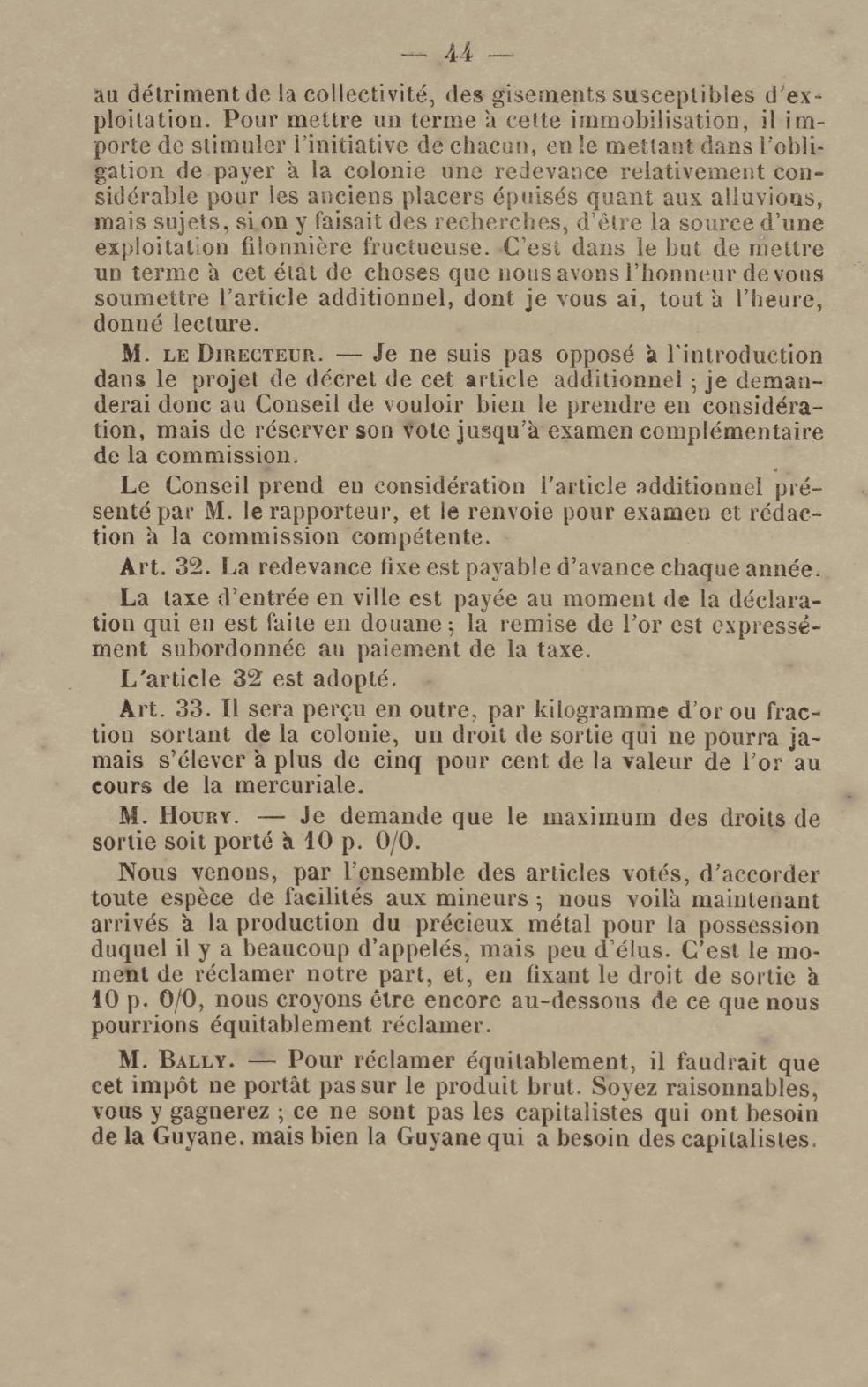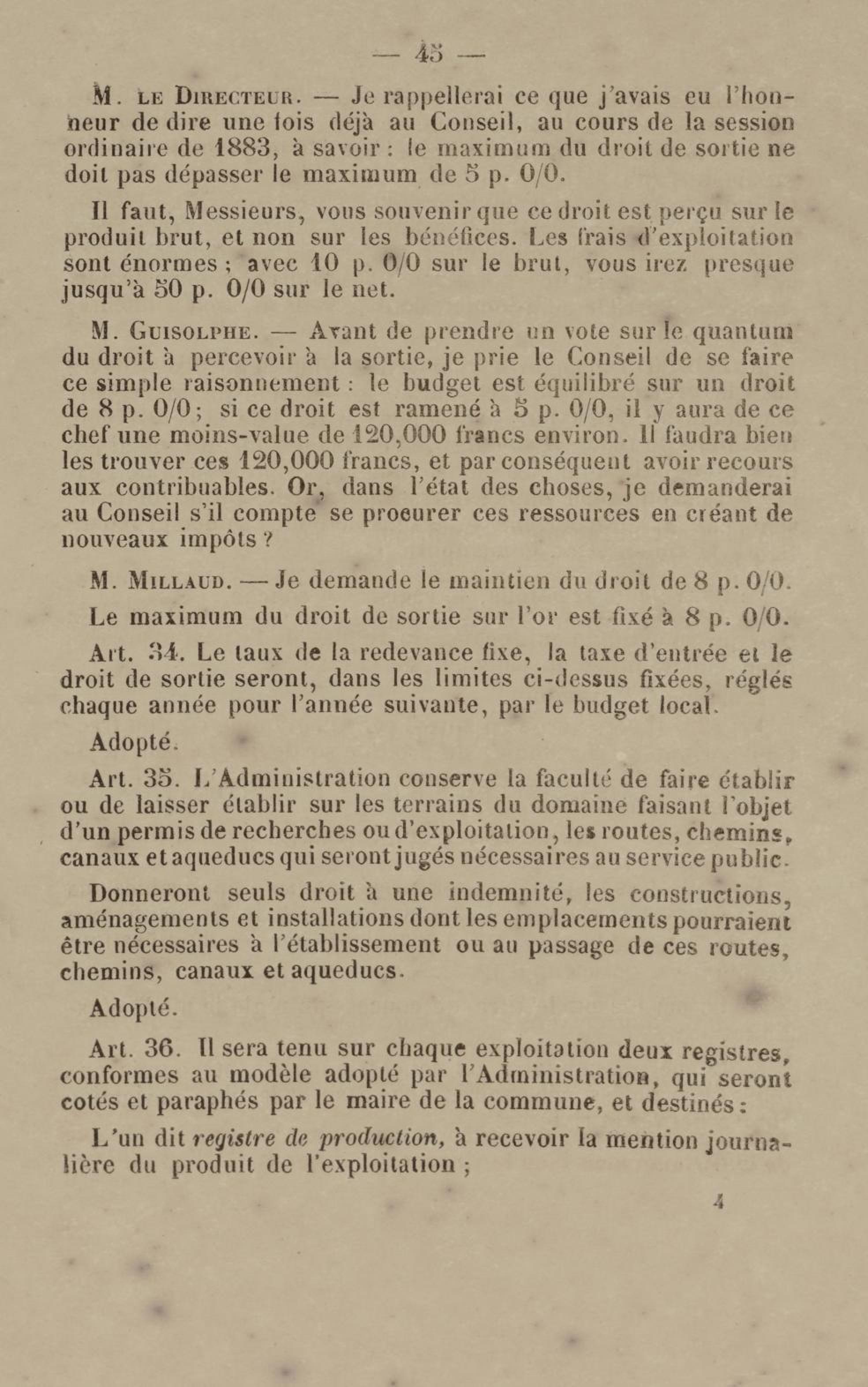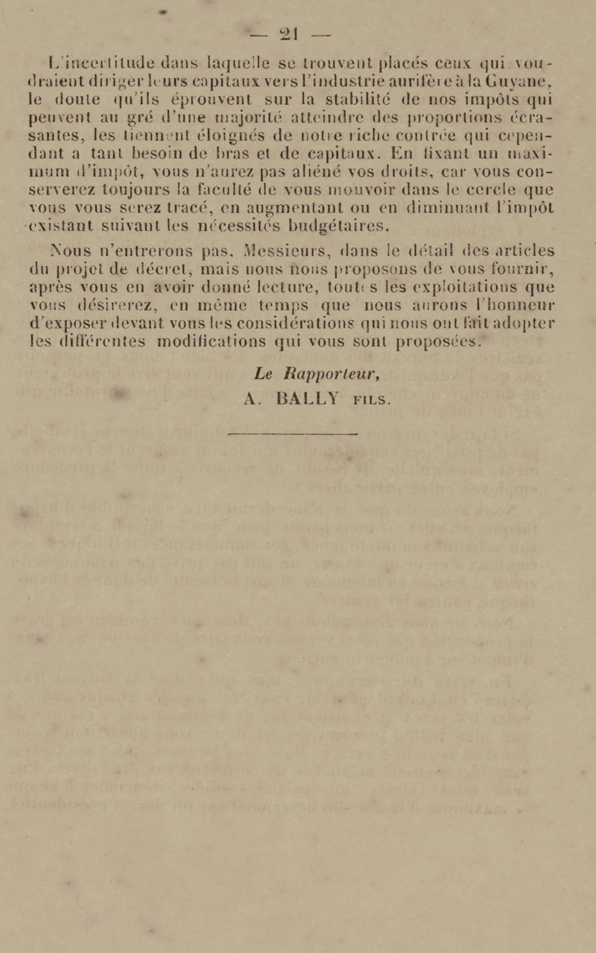 - Projet de décret sur la recherche et l'exploitation des gisements et filons aurifères à la Guyane française : voté par le Conseil général dans sa session extraordinaire de 1884
