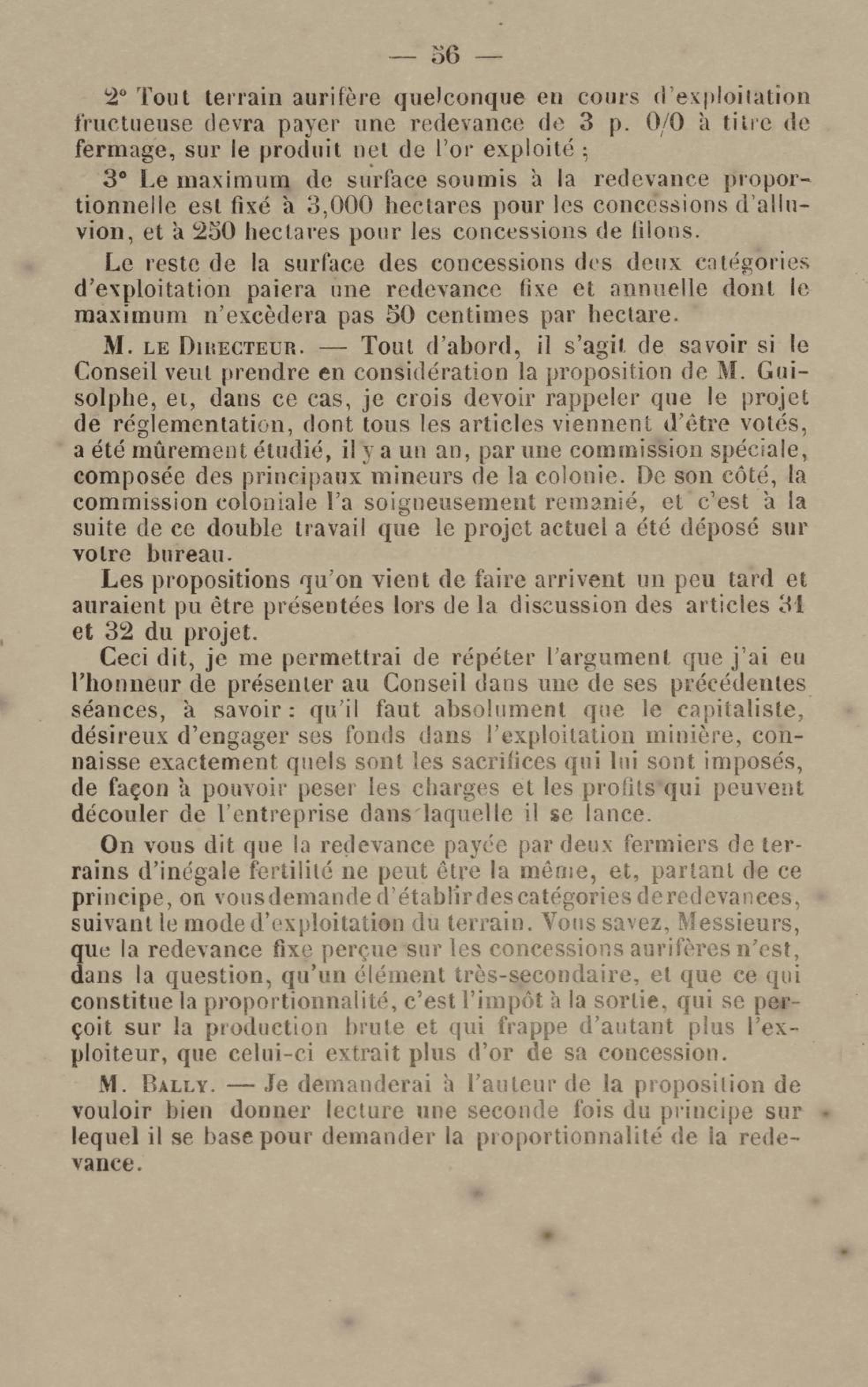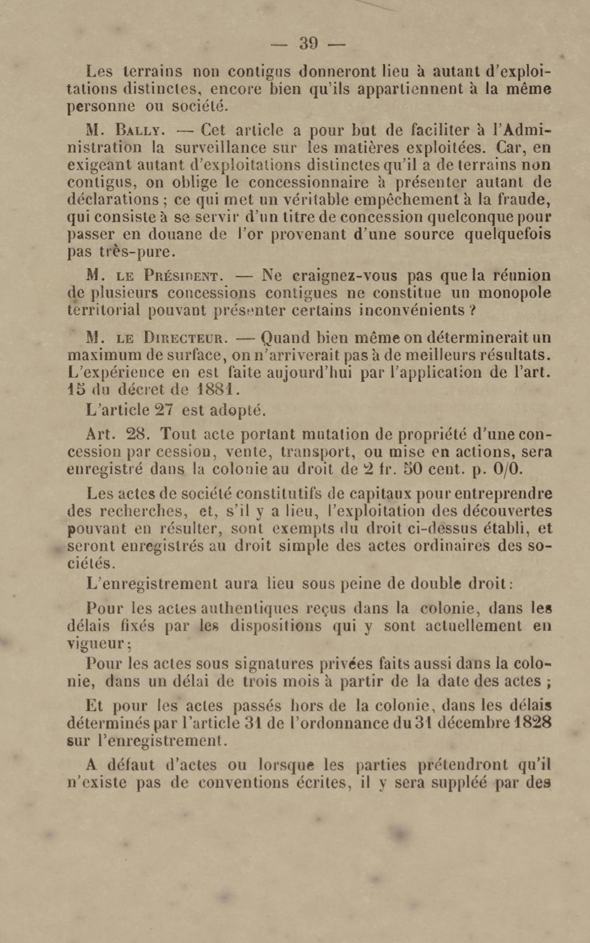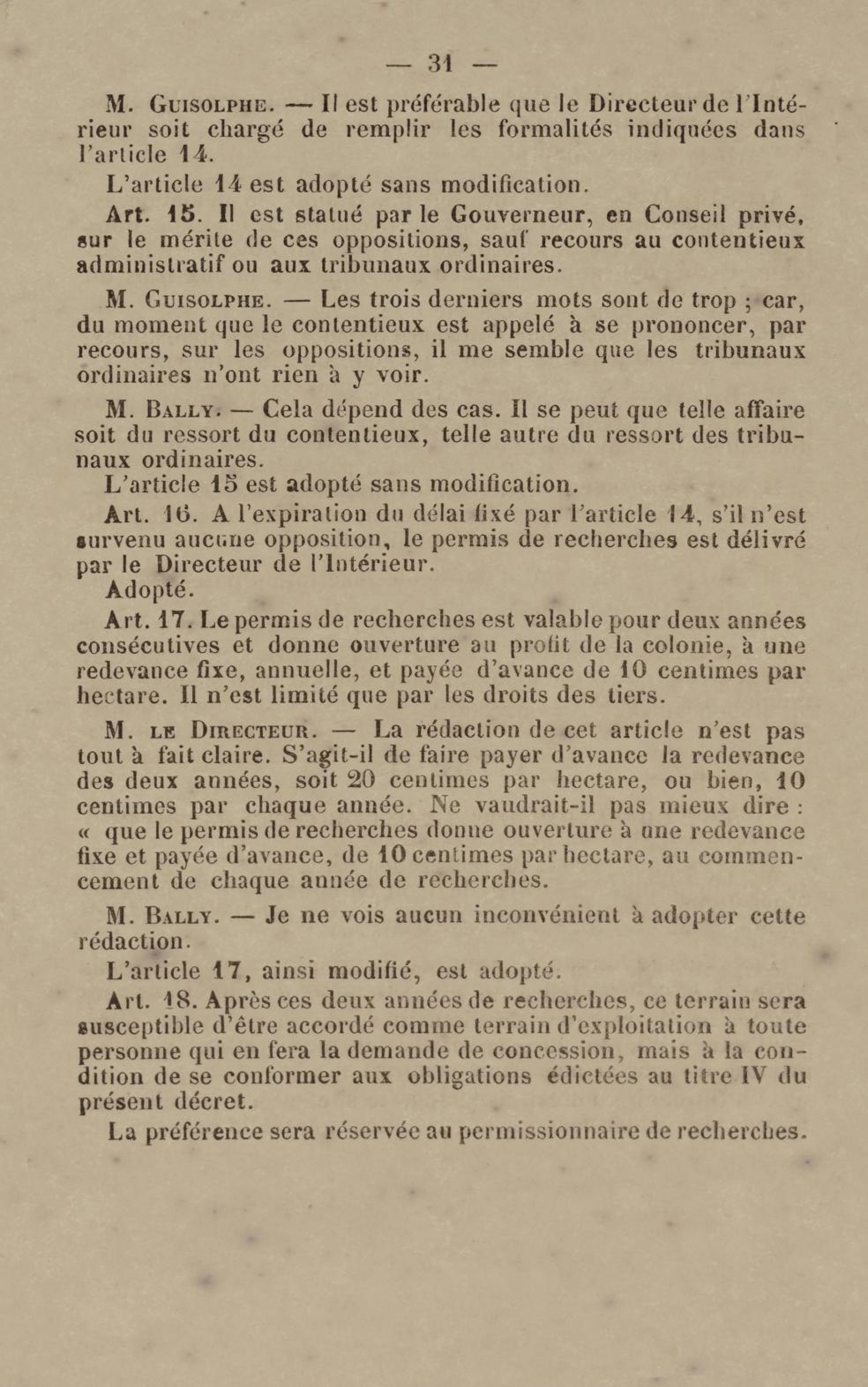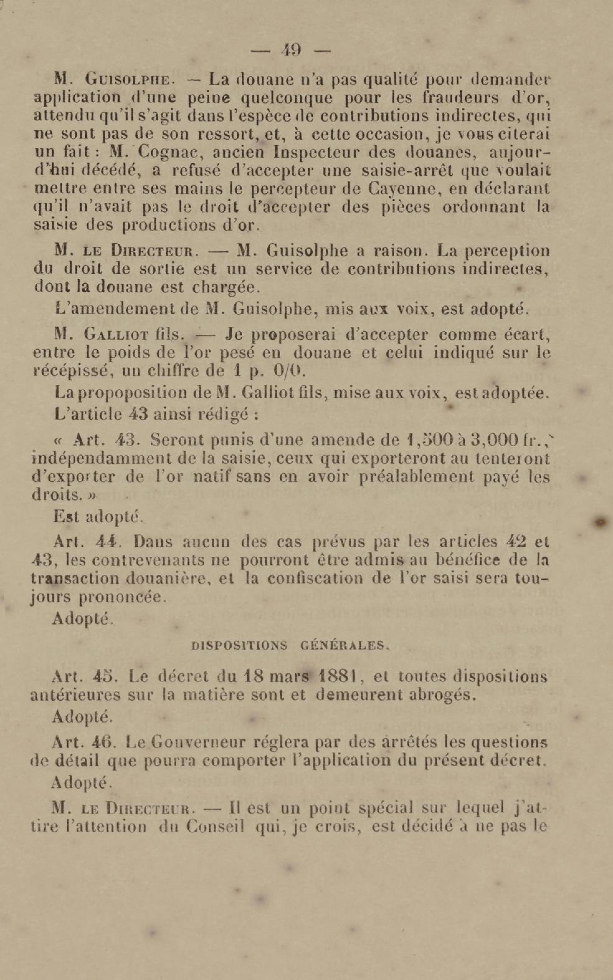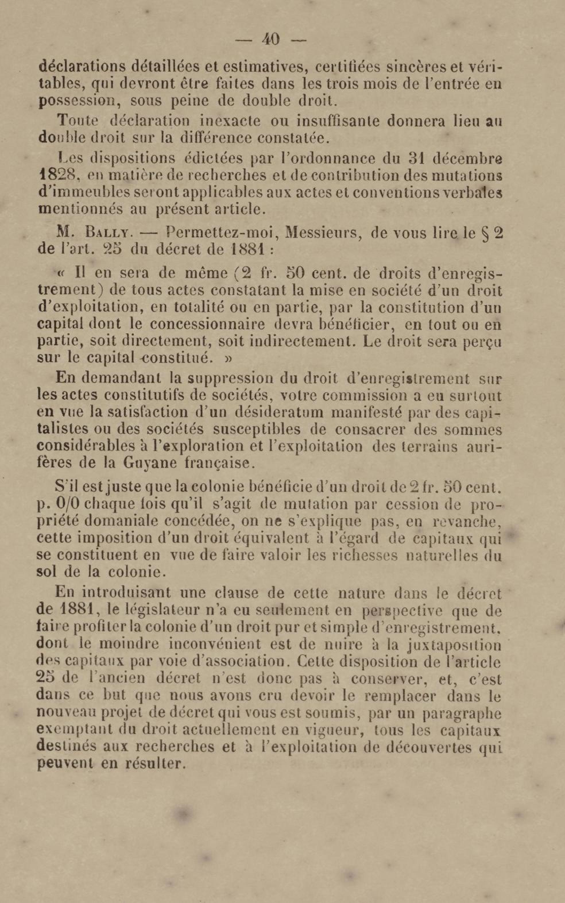 - Projet de décret sur la recherche et l'exploitation des gisements et filons aurifères à la Guyane française : voté par le Conseil général dans sa session extraordinaire de 1884
