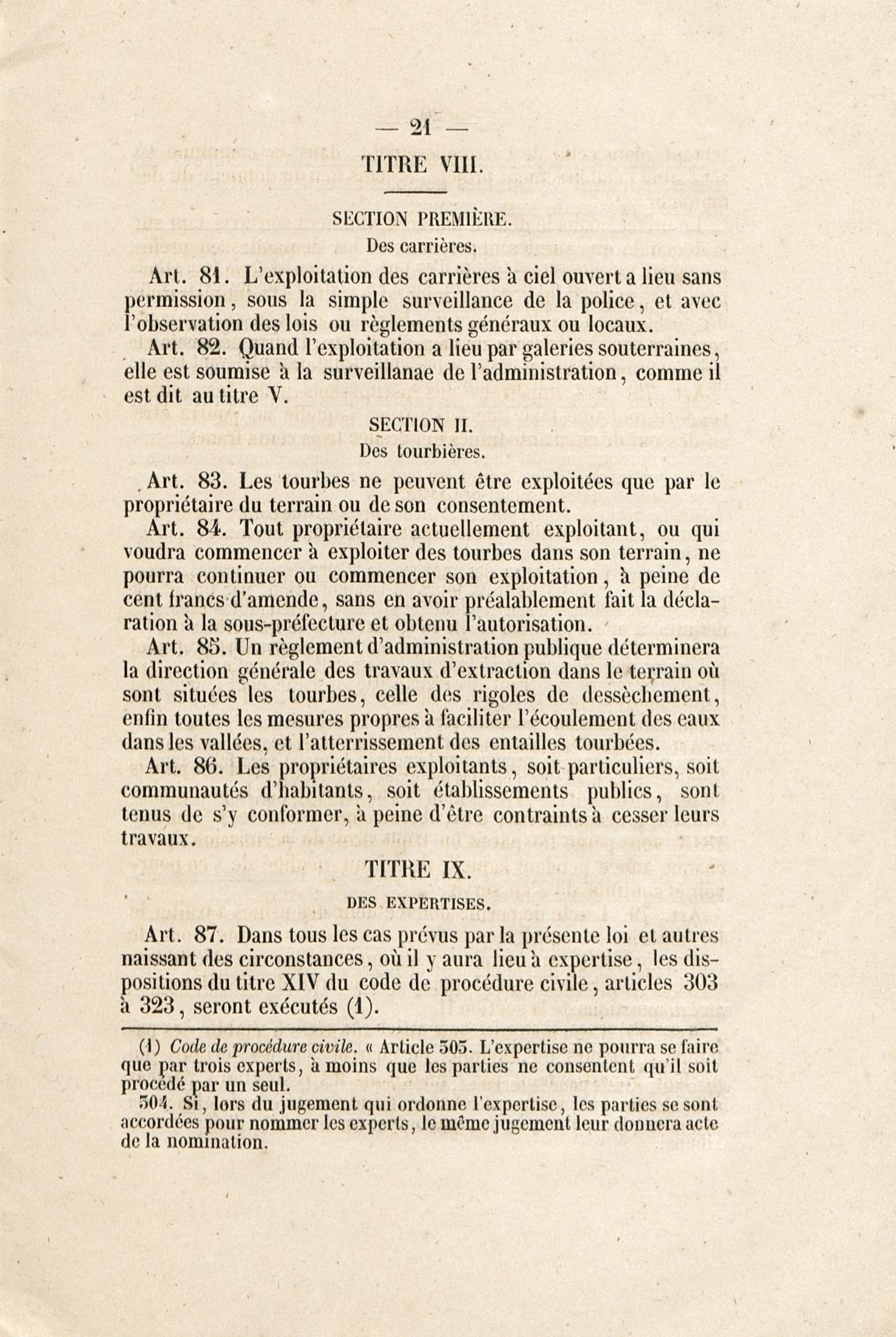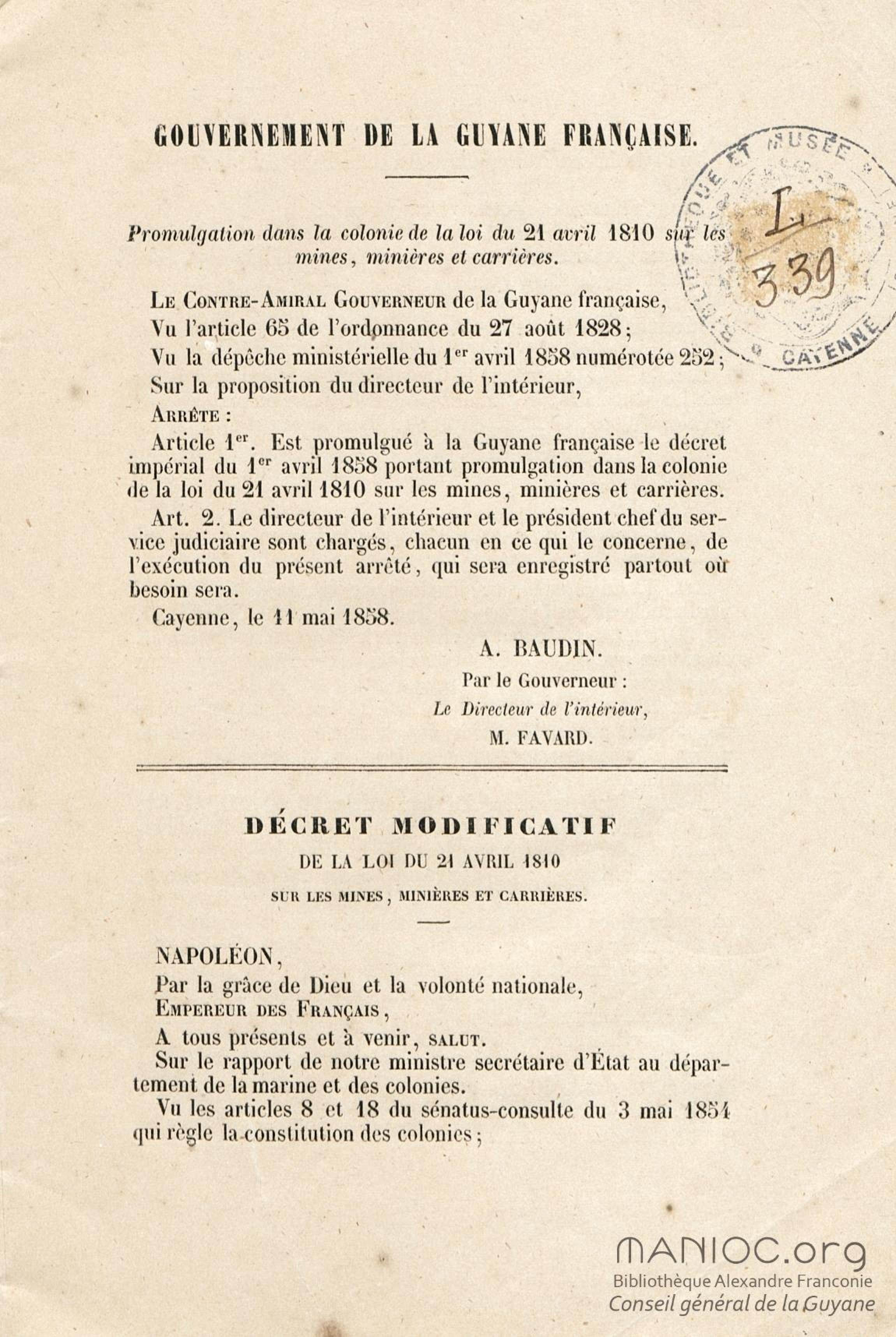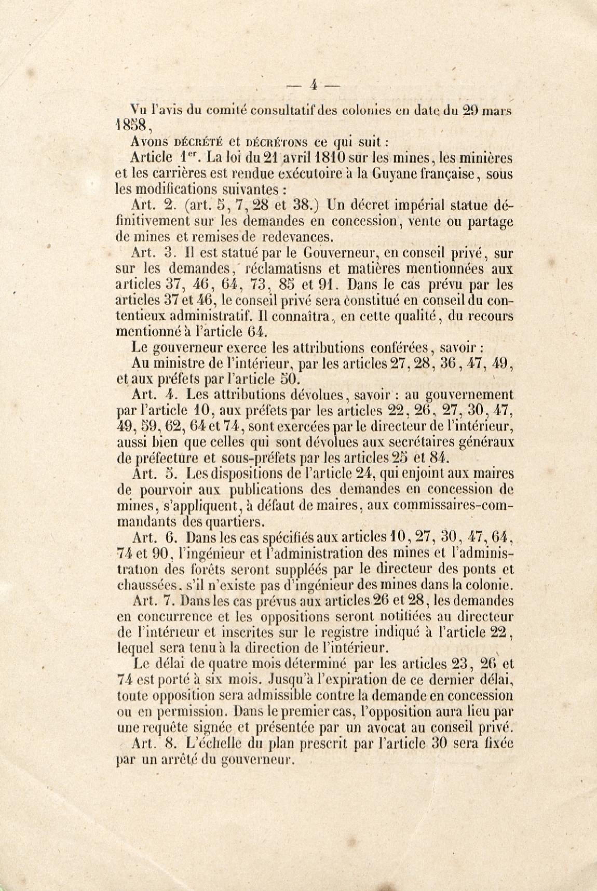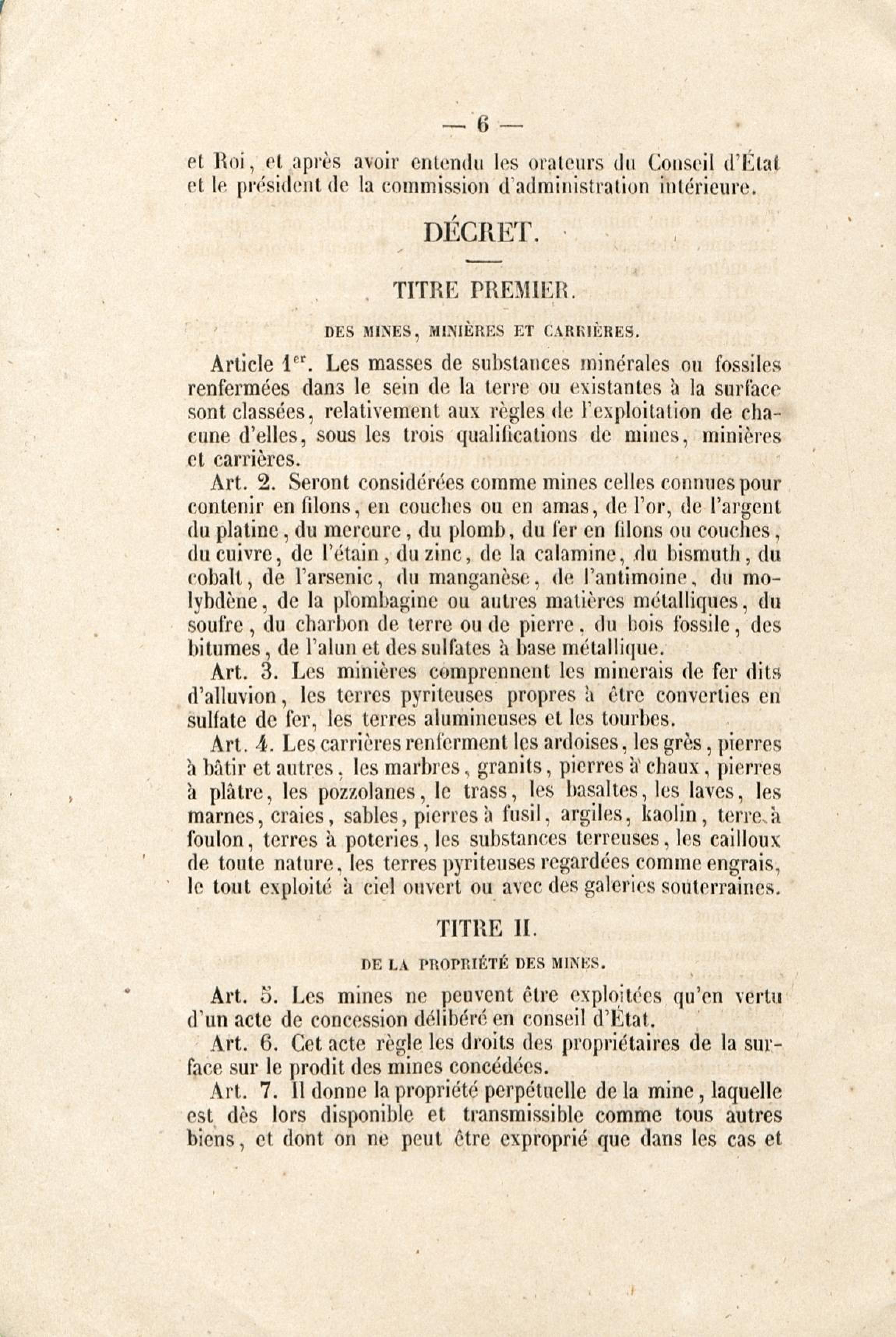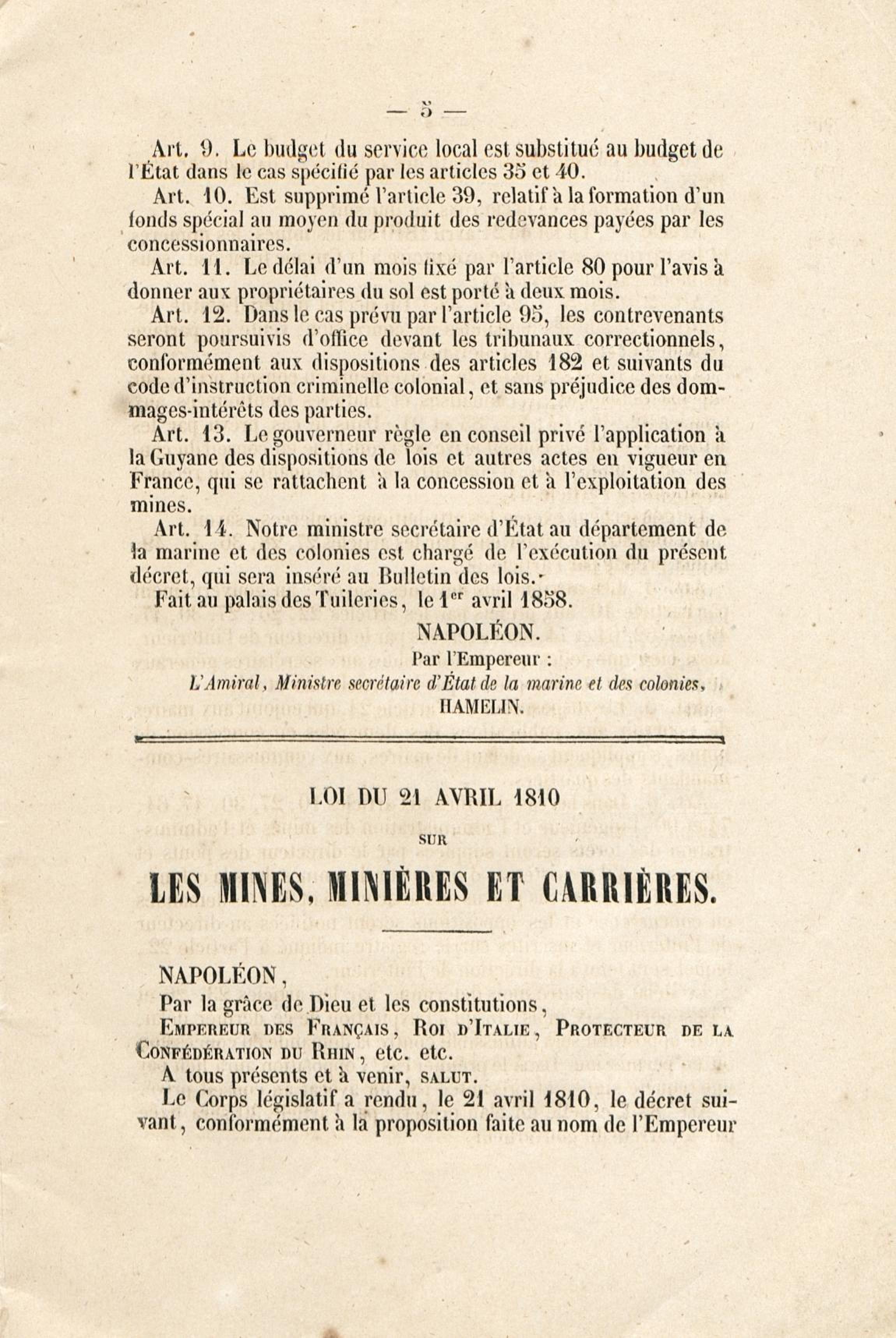 Loi du 21 avril 1810 sur les mines, minières et carrières, l'arrêté de promulgation et le décret modificatif [du 1er avril 1858]