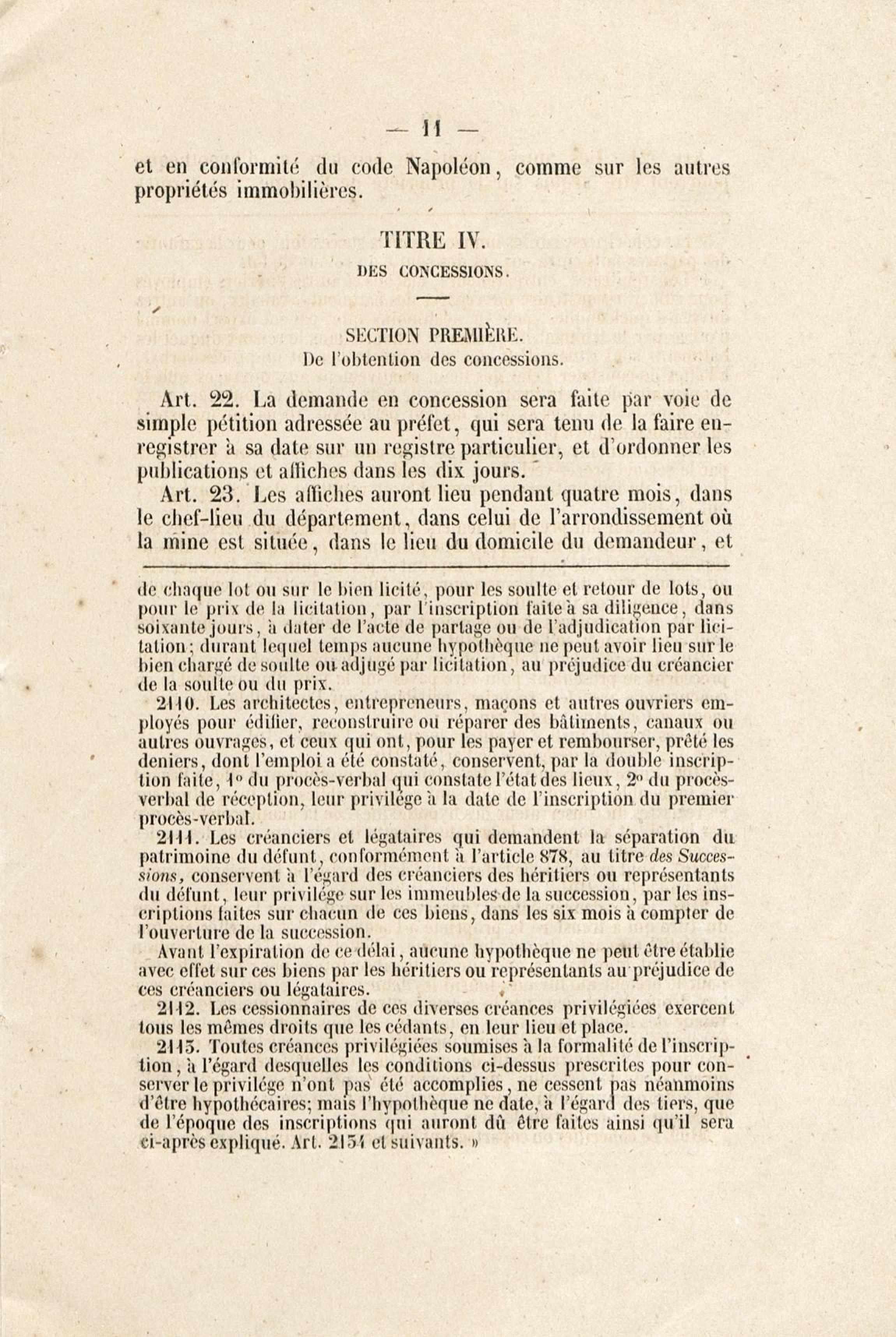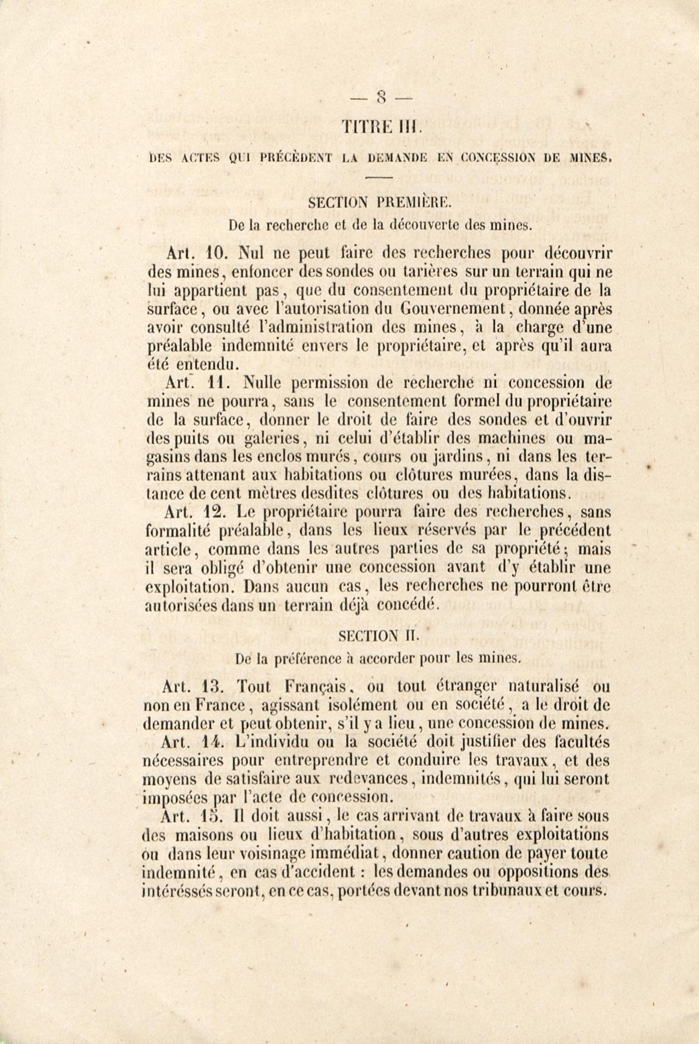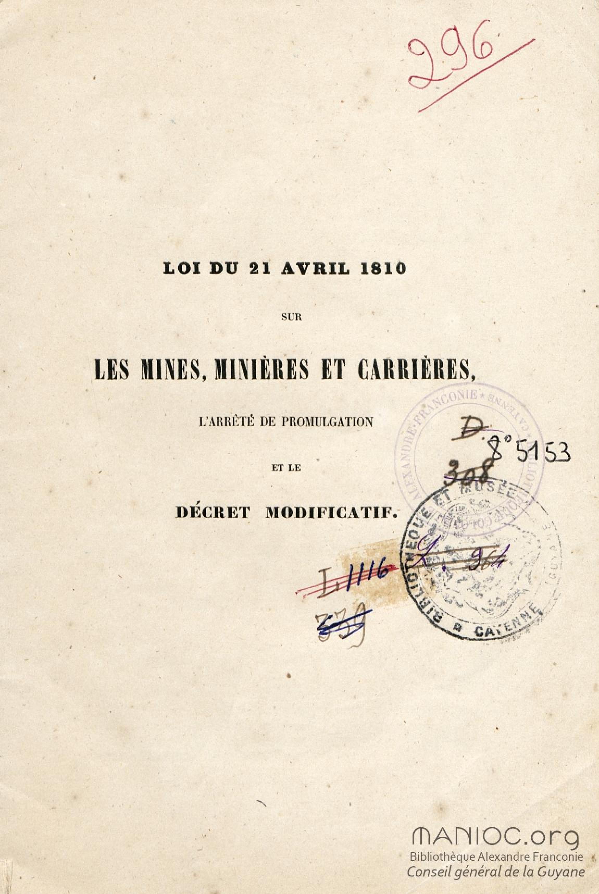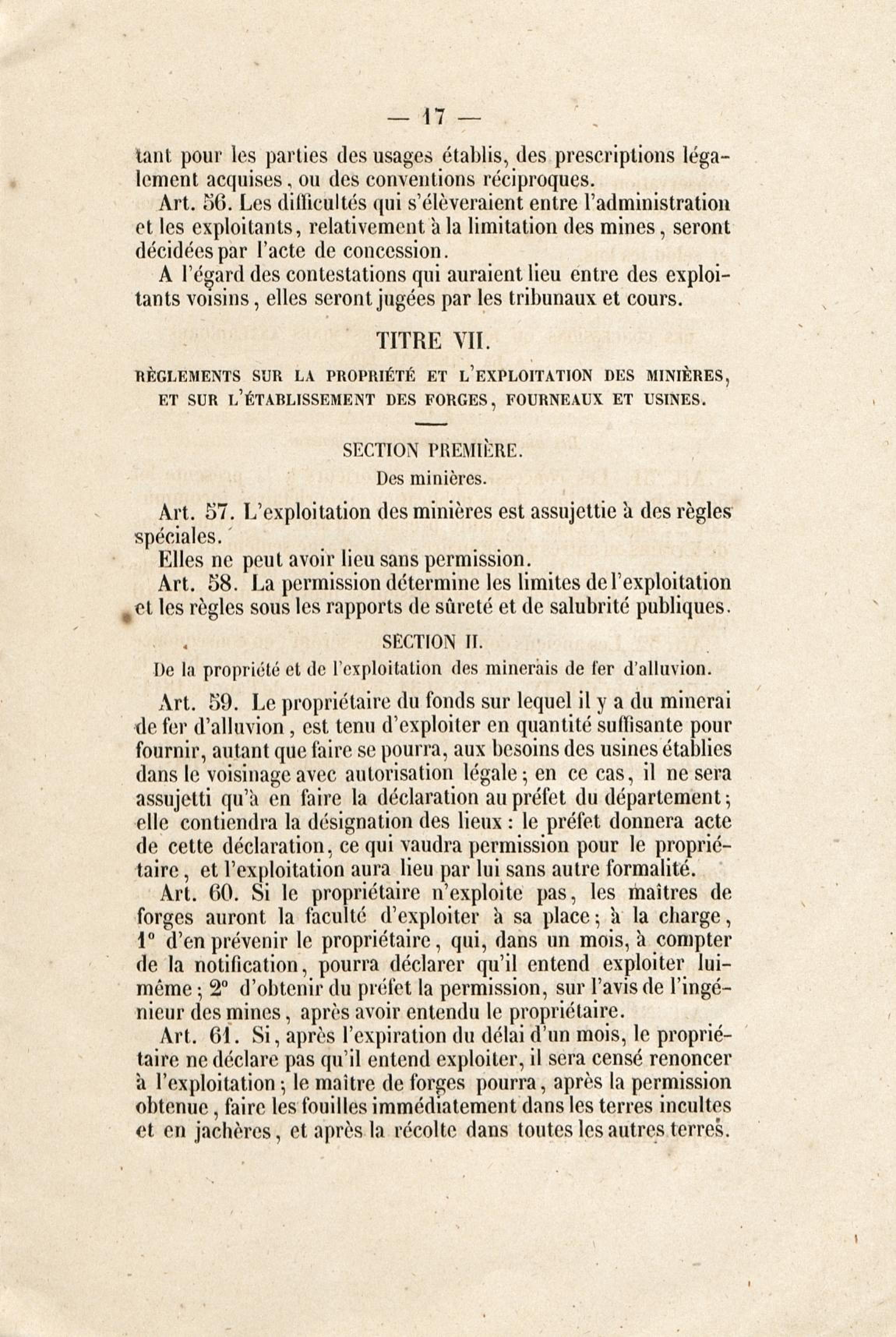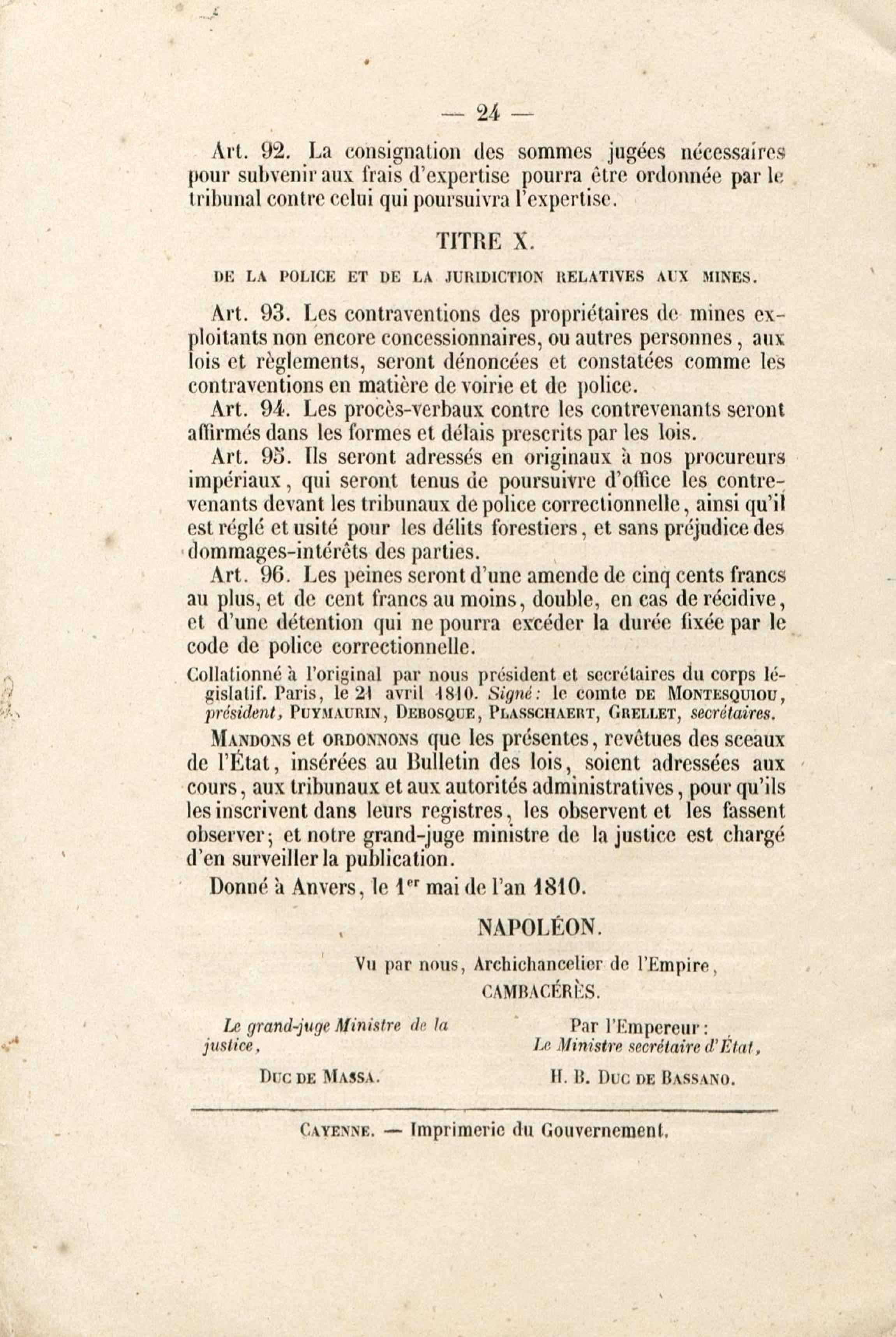 Loi du 21 avril 1810 sur les mines, minières et carrières, l'arrêté de promulgation et le décret modificatif [du 1er avril 1858]