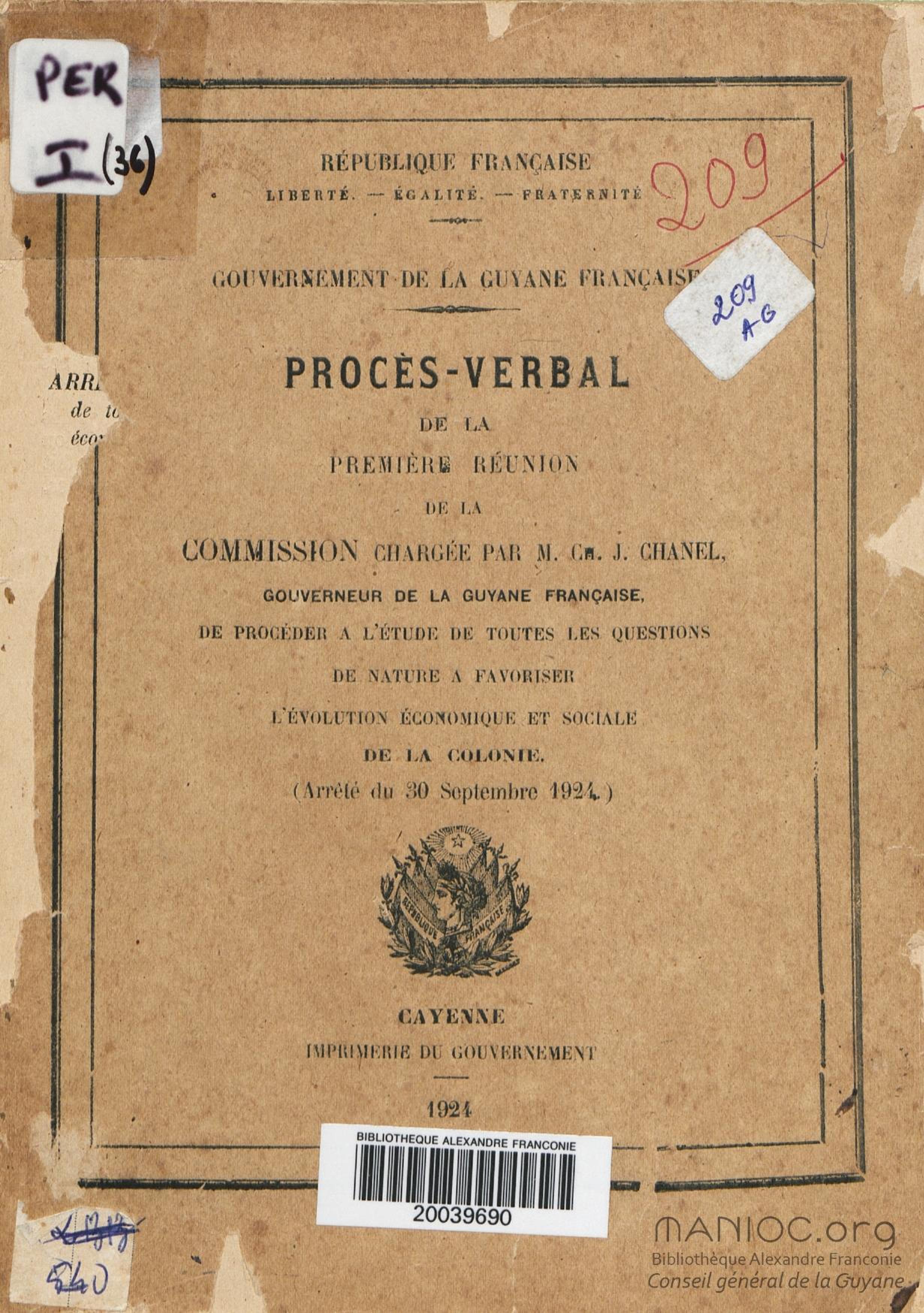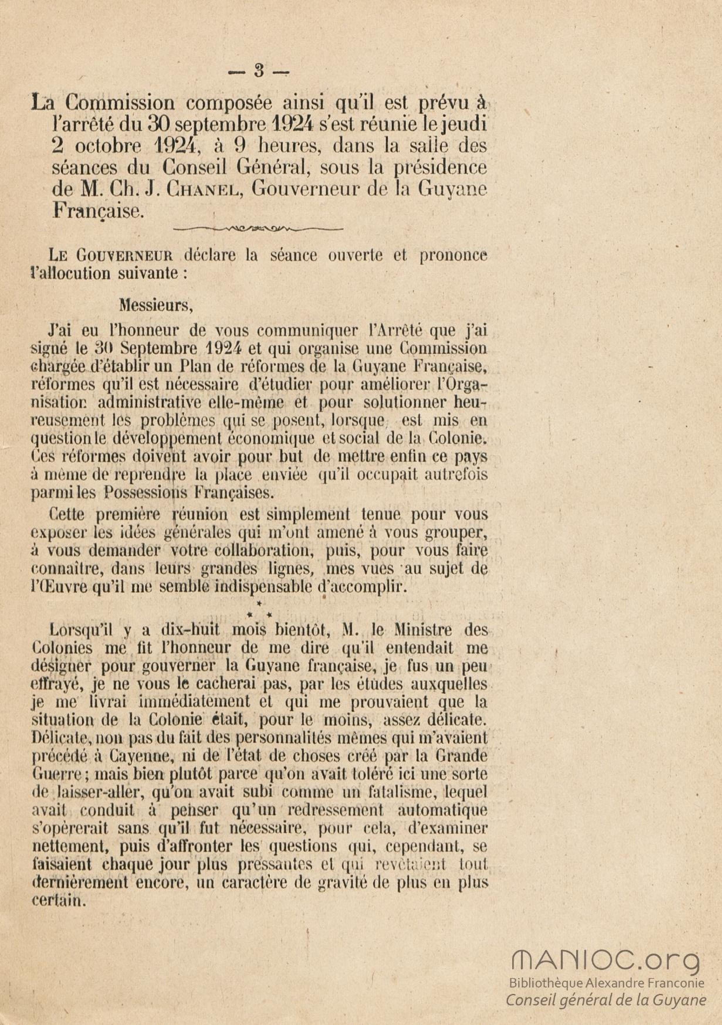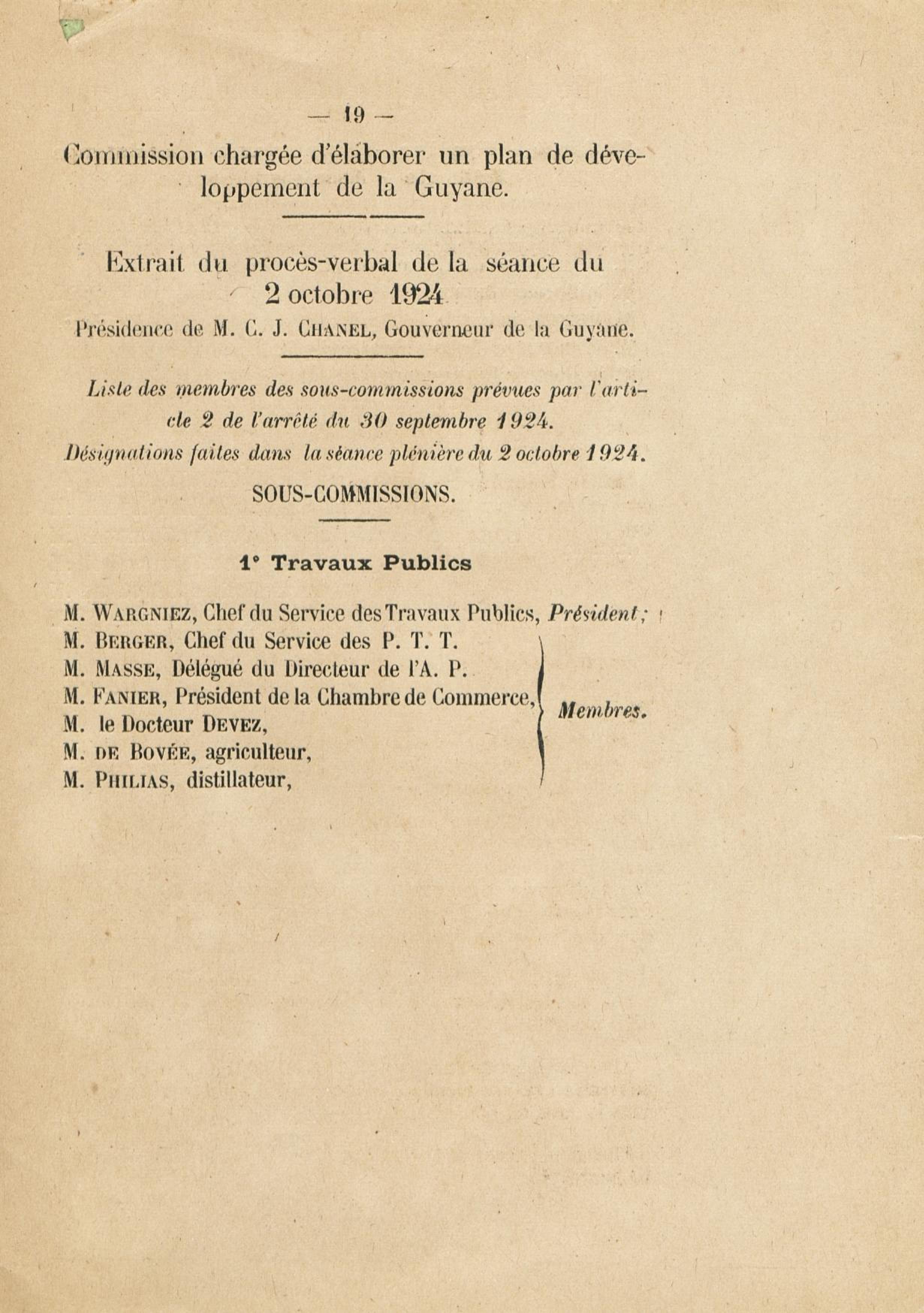 Procès verbal de la première réunion de la Commission chargée par M. Ch. J. Chanel,... de procéder à l'étude de toutes les questions de nature à favoriser l'évolution économique et sociale de la colonie : [commission instituée par l']arrêté du 30 septembre 1924