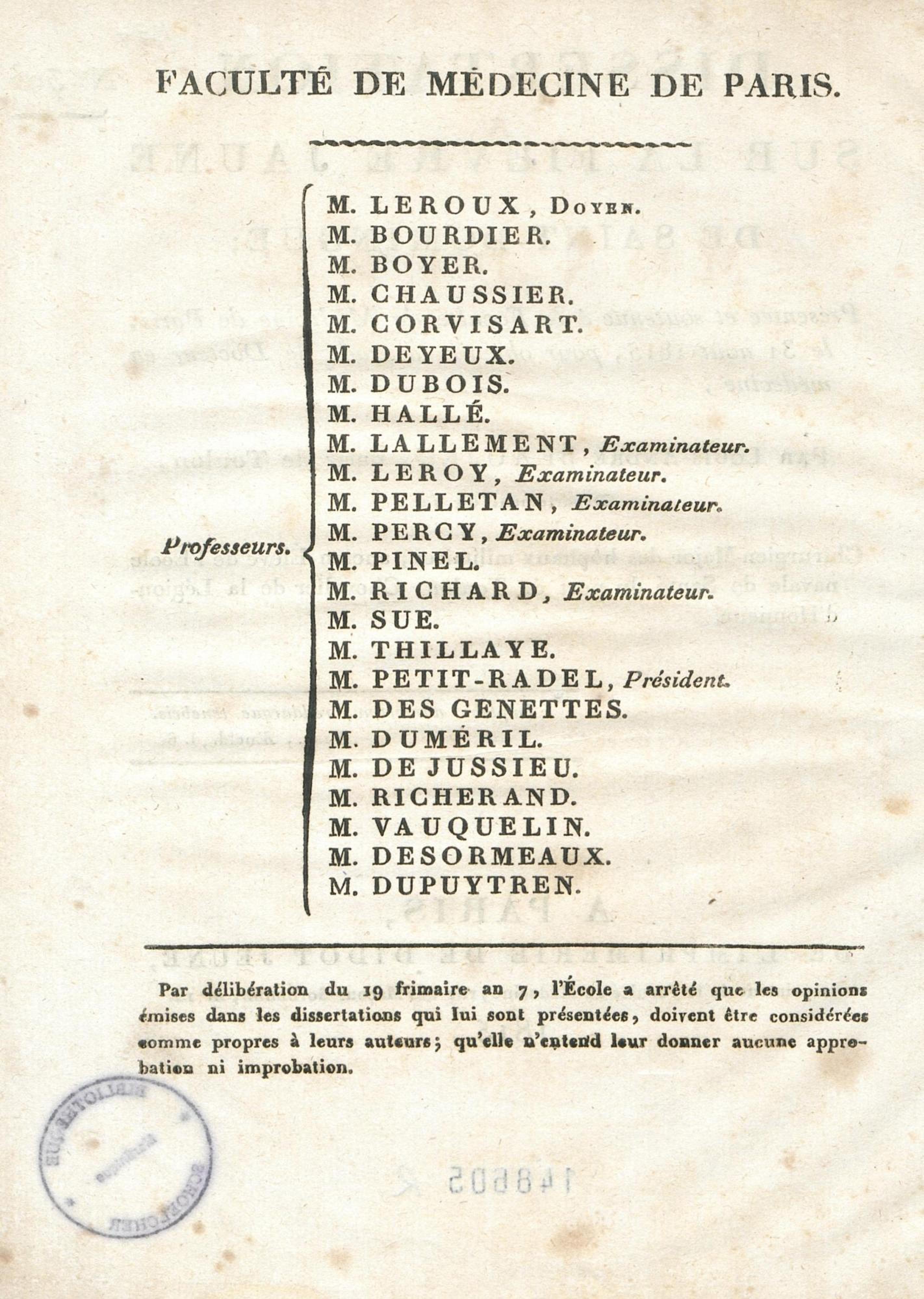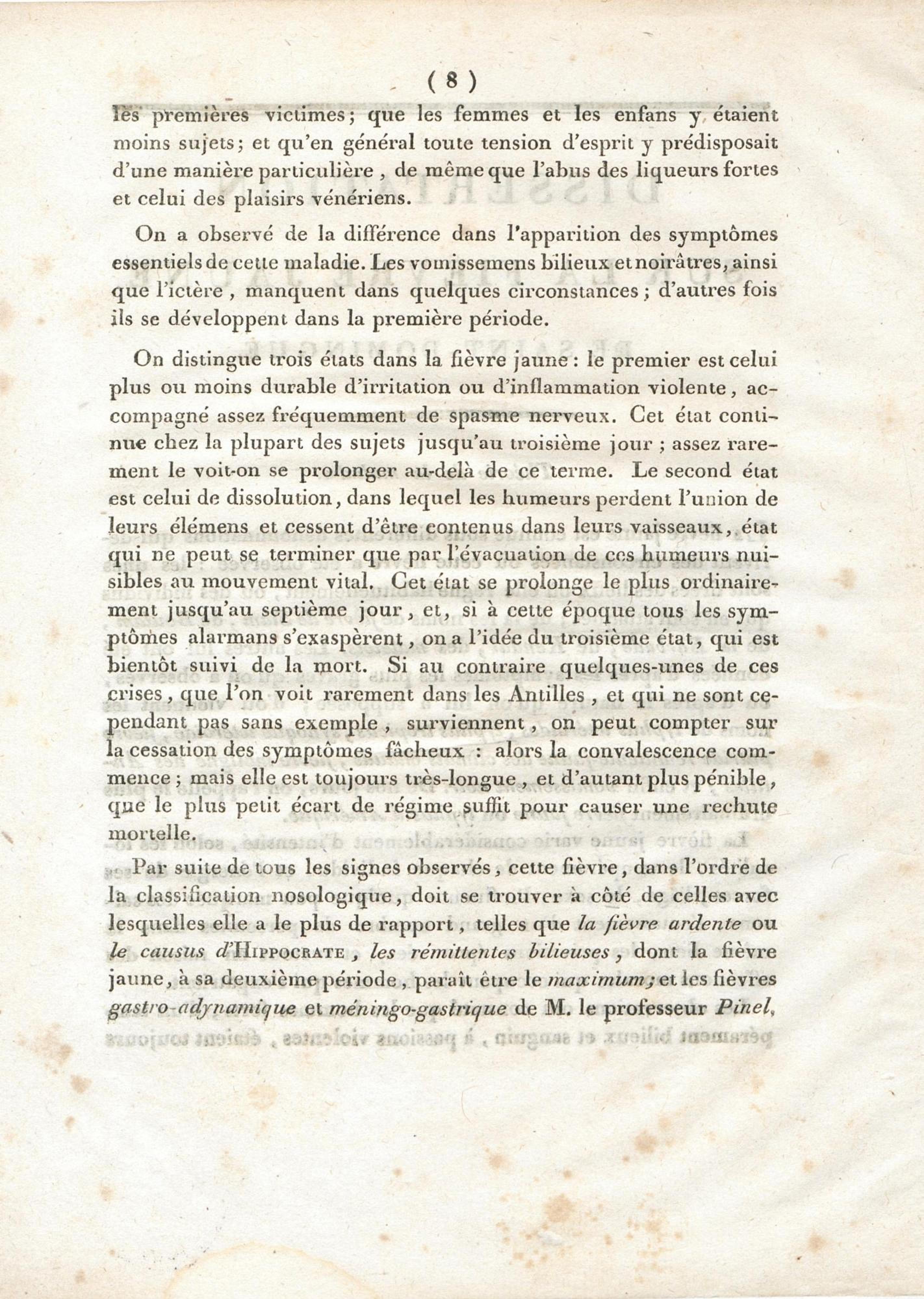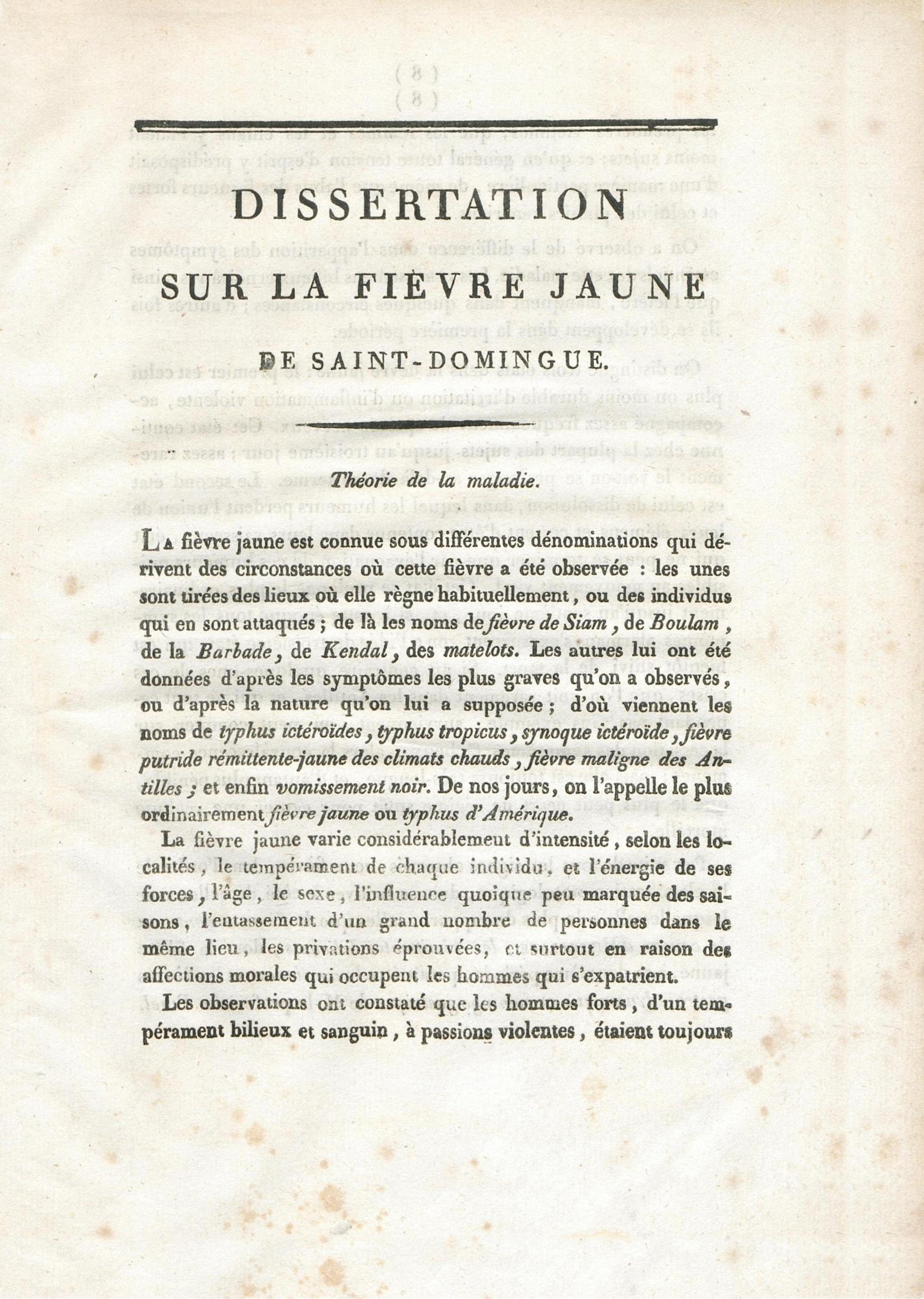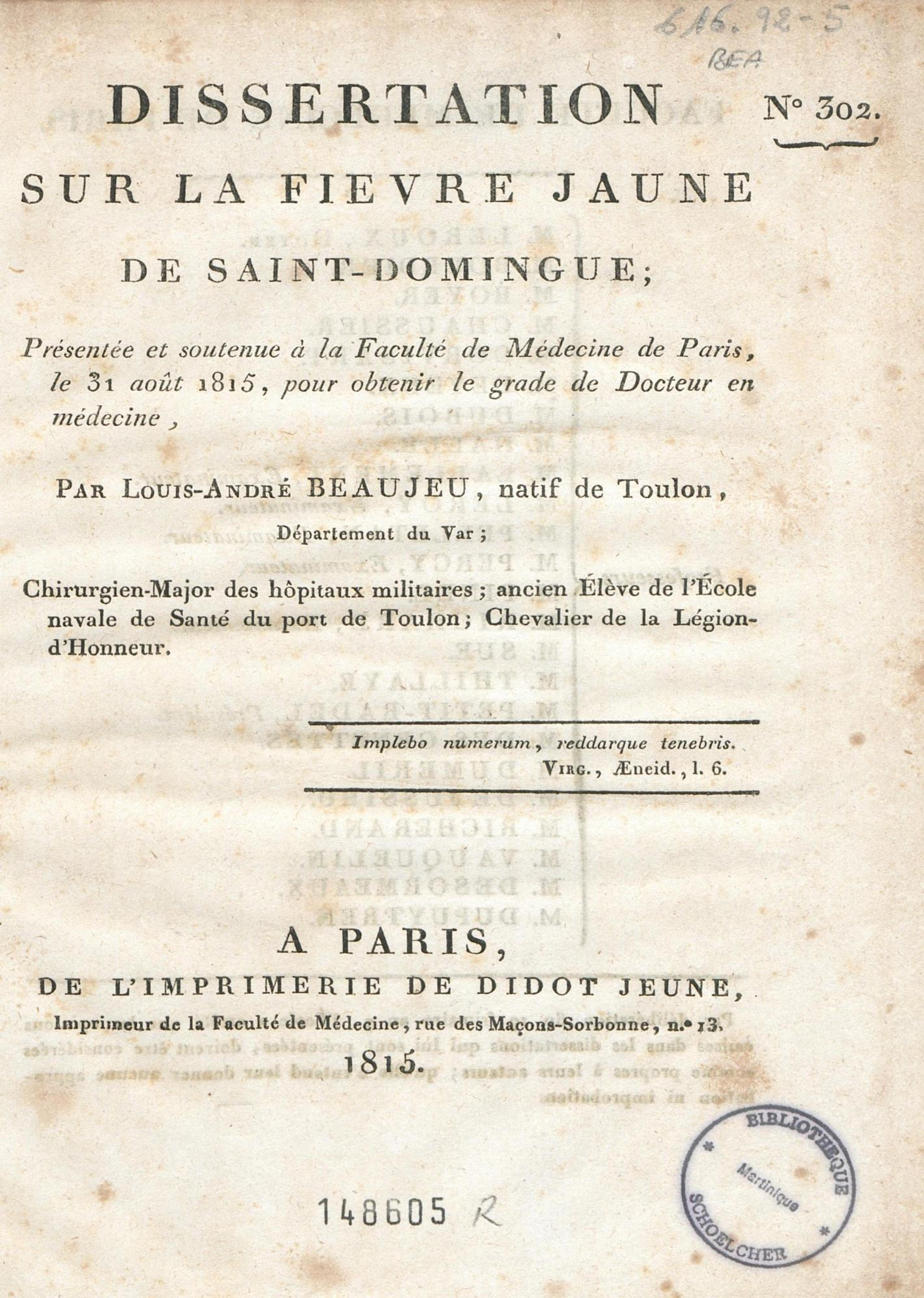 Dissertation sur la fièvre jaune de Saint-Domingue : présentée et soutenue à la Faculté de médecine de Paris, le 31 août 1815, pour obtenir le grade de Docteur en médecine