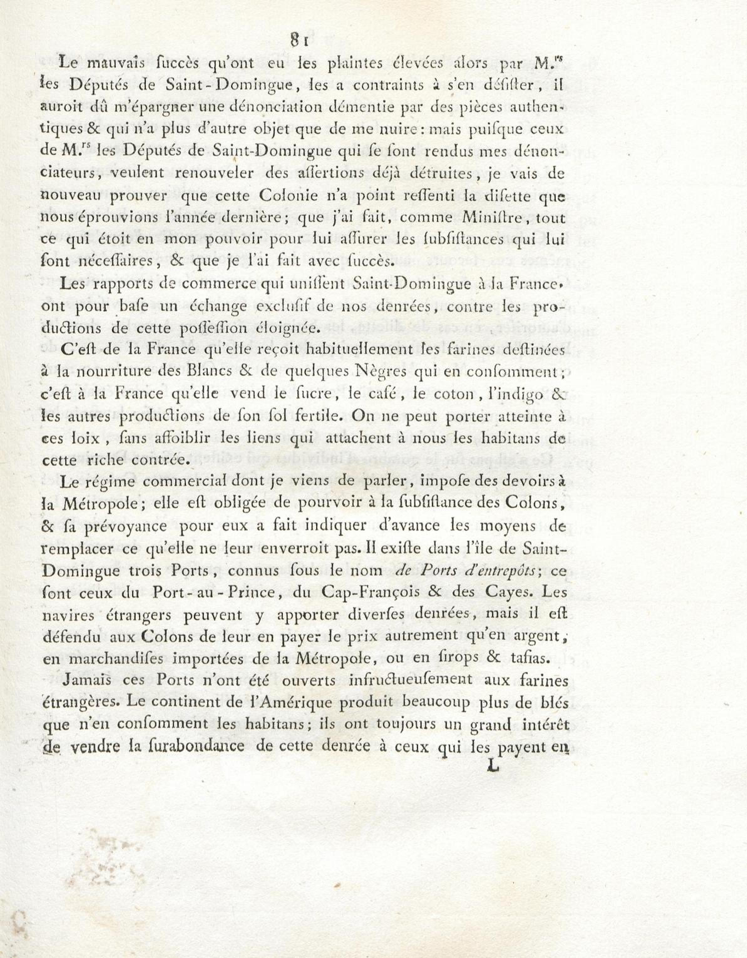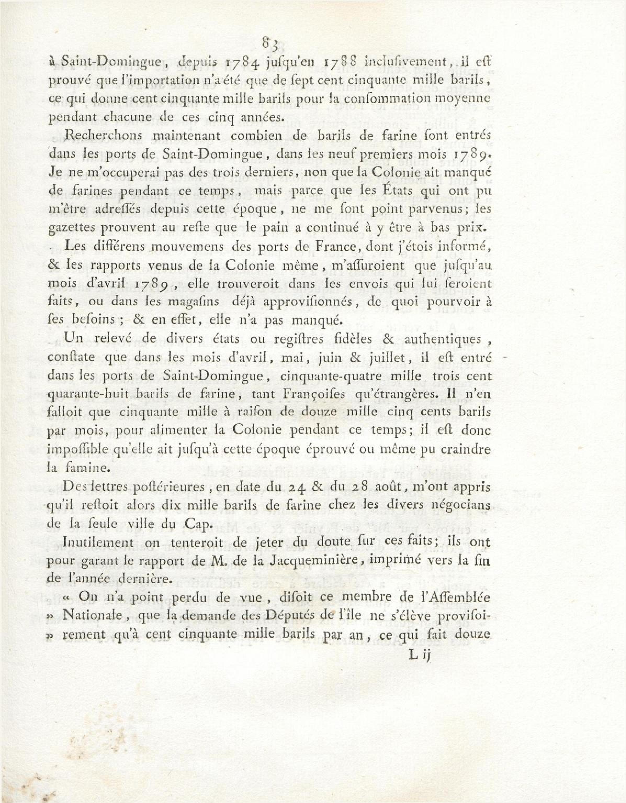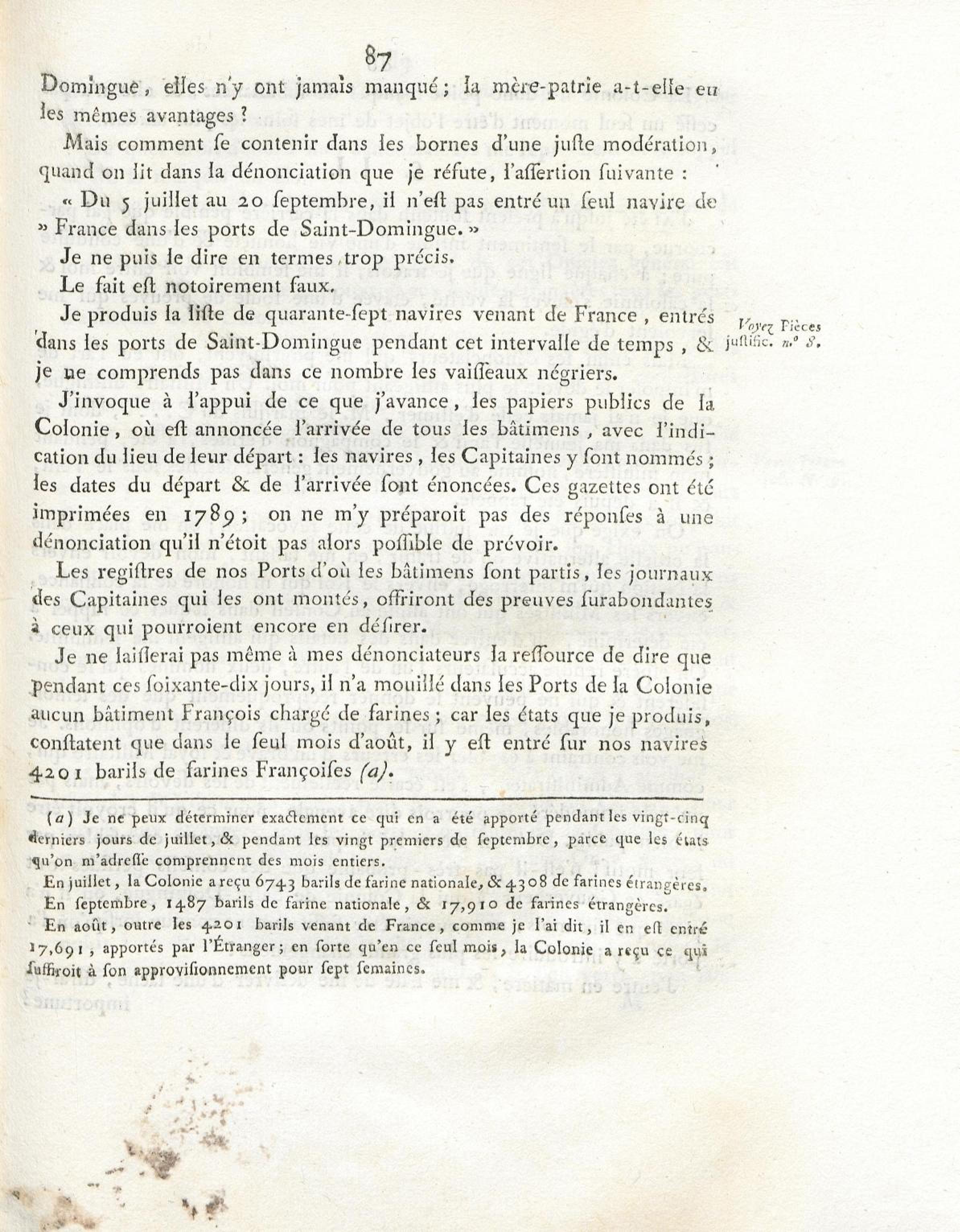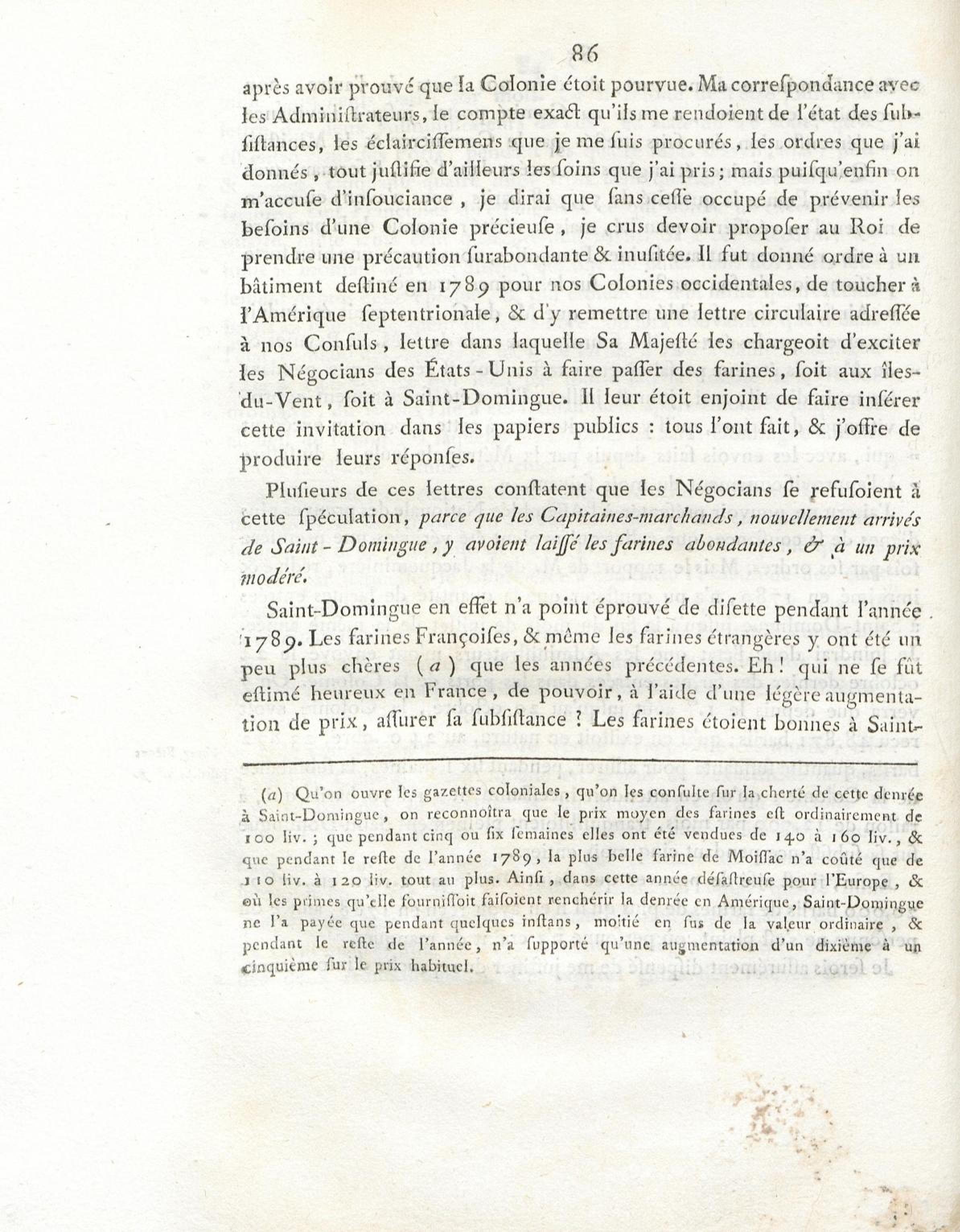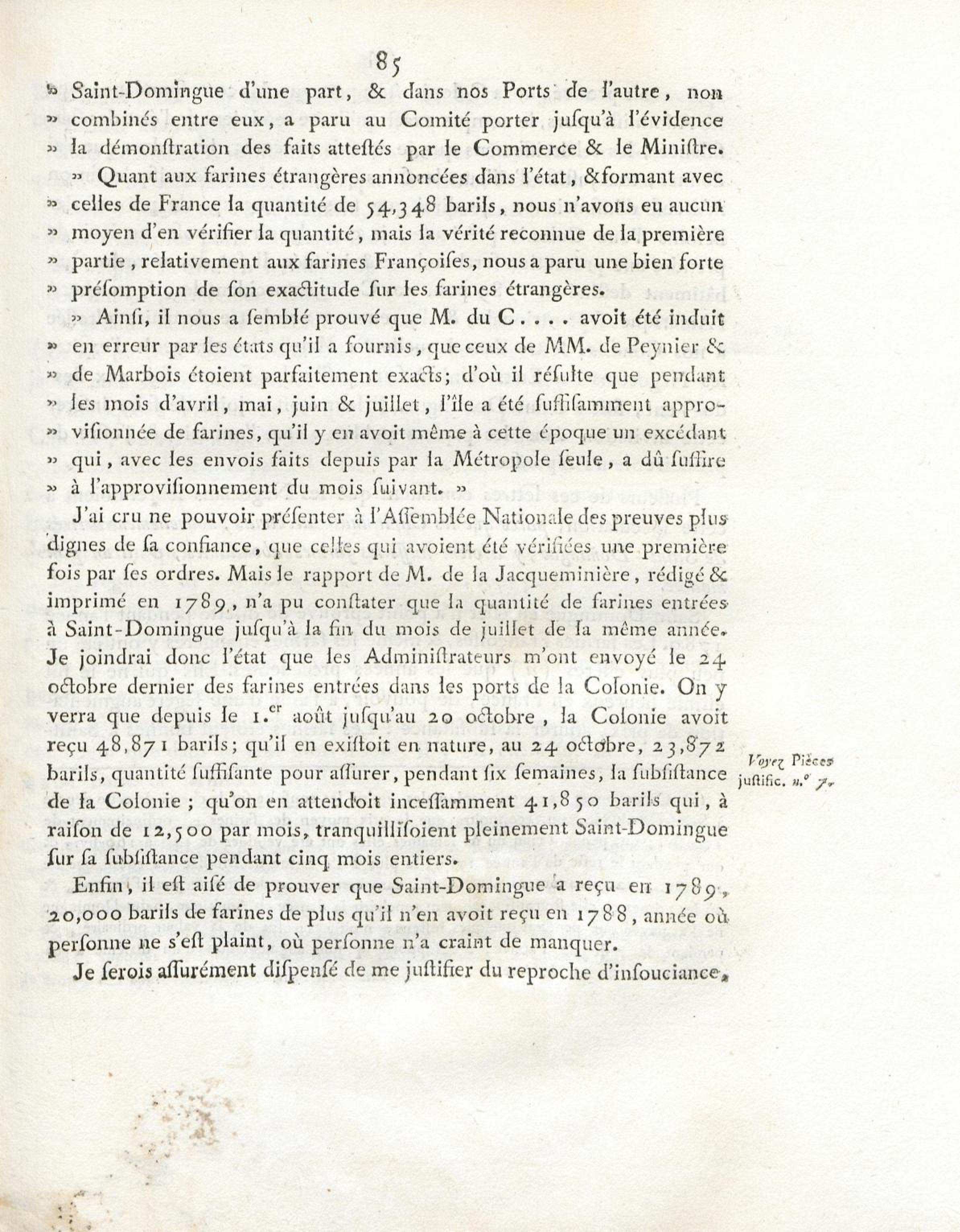 N° VII. Apperçu des subsistances existant dans la Colonie à l'époque du premier octobre 1789.