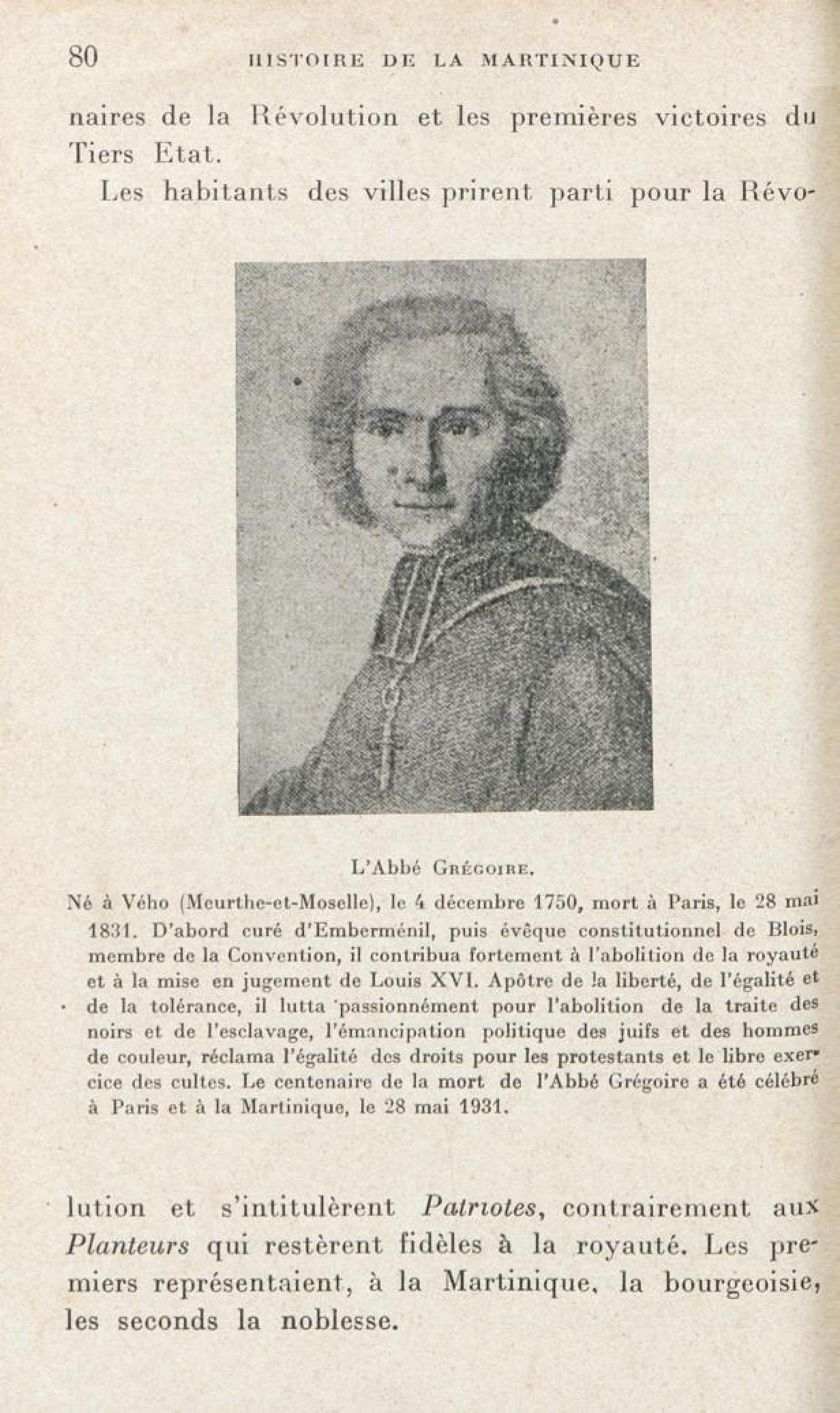 L'Abbé Grégoire. Né à Vého (Meurthe-et-Moselle), le 4 décembre 1750, mort à Paris, le 28 mai1831. D'abord curé d'Emberménil, puis évêque constitutionnel de Blois, membre de la Convention, il contribua fortement à l'abolition de la royauté et à la mise en jugement de Louis XVI, Apôtre de la liberté, de l'égalité et de la tolérance, il lutta passinément pour l'abolition de la traite des noirs et de l'esclavage, l'émancipation politique des juifs et des hommes de couleur, réclama l'égalité des droits pour les protestants et le libre exercice des cultes. Le centenaire de la mort de l'Abbé Grégoire a été célébré à Paris et à la Martinique, le 28 mai 1931]