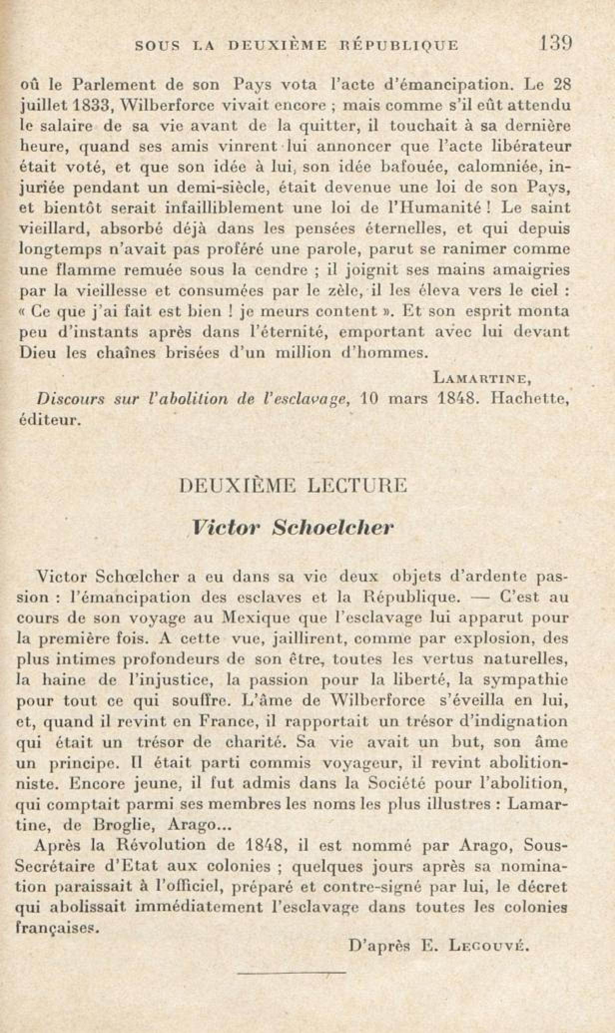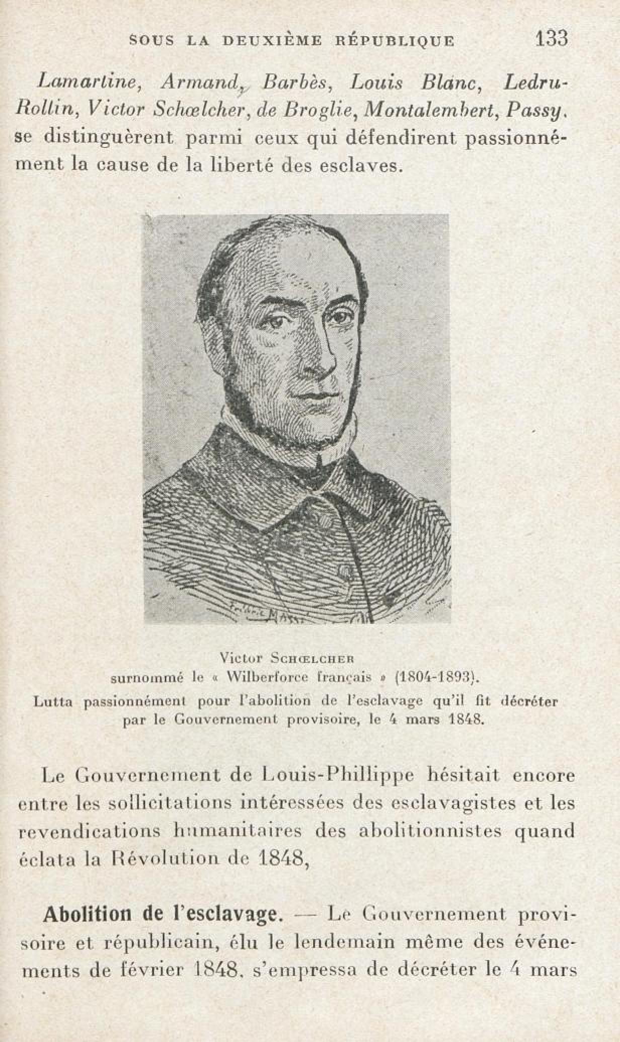 [Victor Schoelcher surnommé le « Wilberforce français » ( 1804-1893 ). Lutta passionnément pour l'abolition de l'esclavage qu'il fit décréter par le Gouvernement provisoire, le 4 mars 1848]