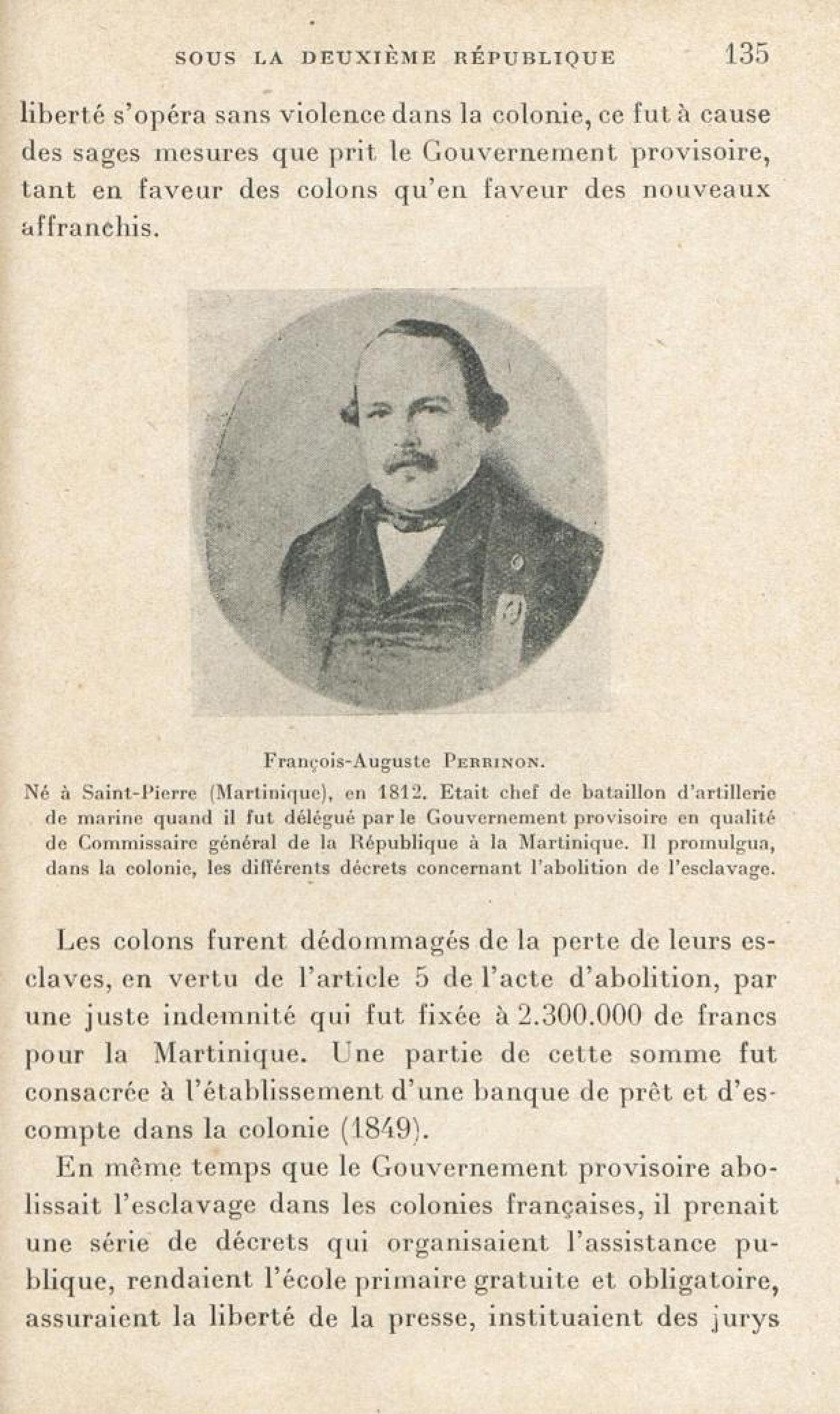 [François Augustin Perrinon. Né à Saint-Pierre ( Martinique ) , en 1812. Etait chef de bataillon d'artillerie de marine quand il fut délégué par le Gouvernement provisoire en qualité de Commissaire général de la République à la Martinique. Il promulgua, dans la colonie, les différents decrets concernant l'abolition de l'esclavage]