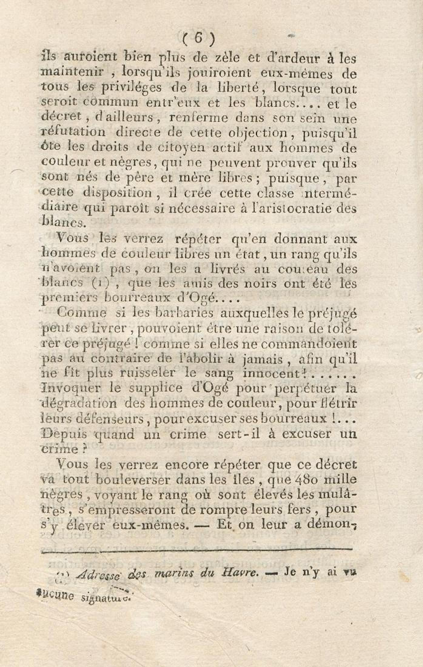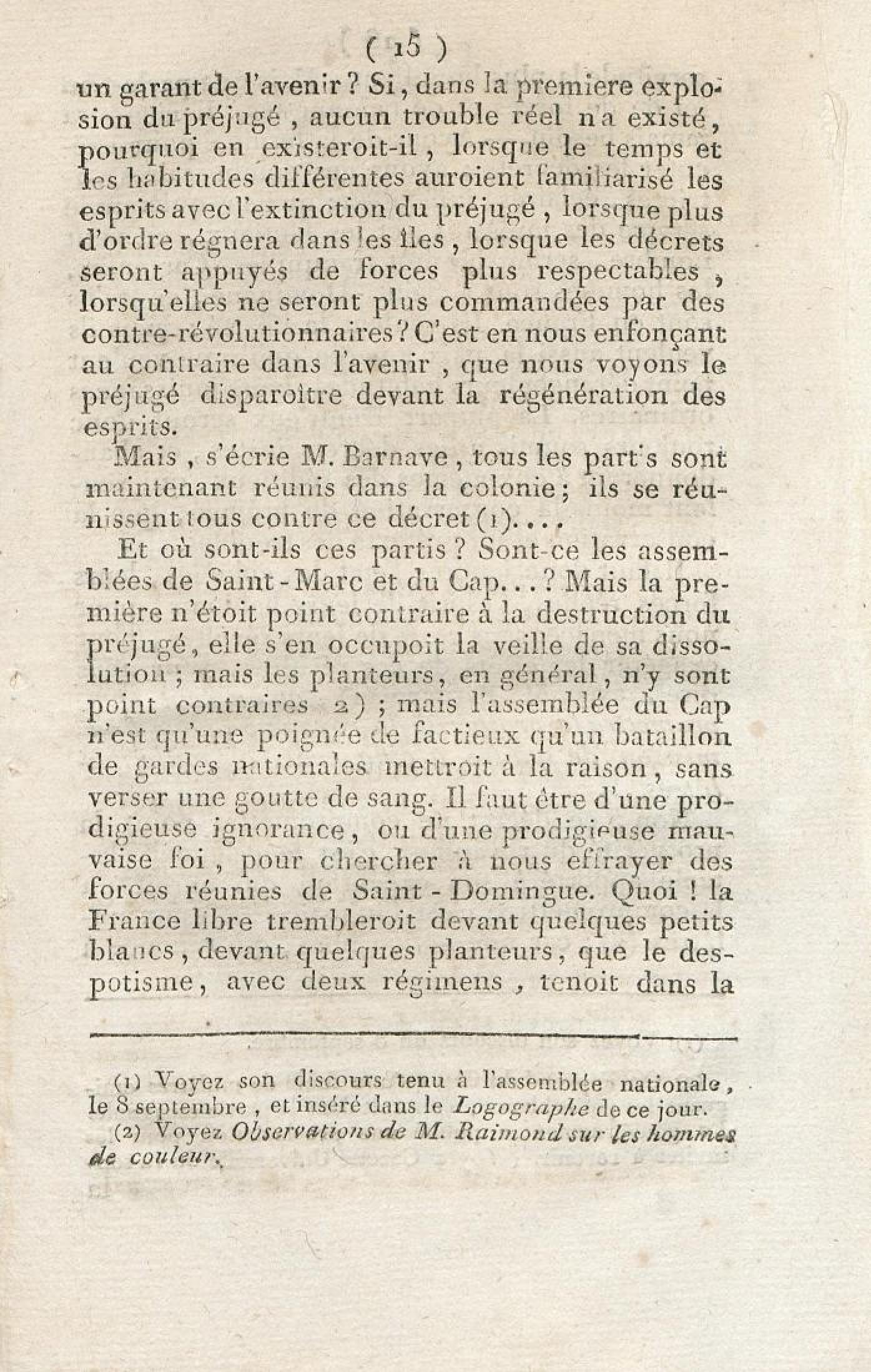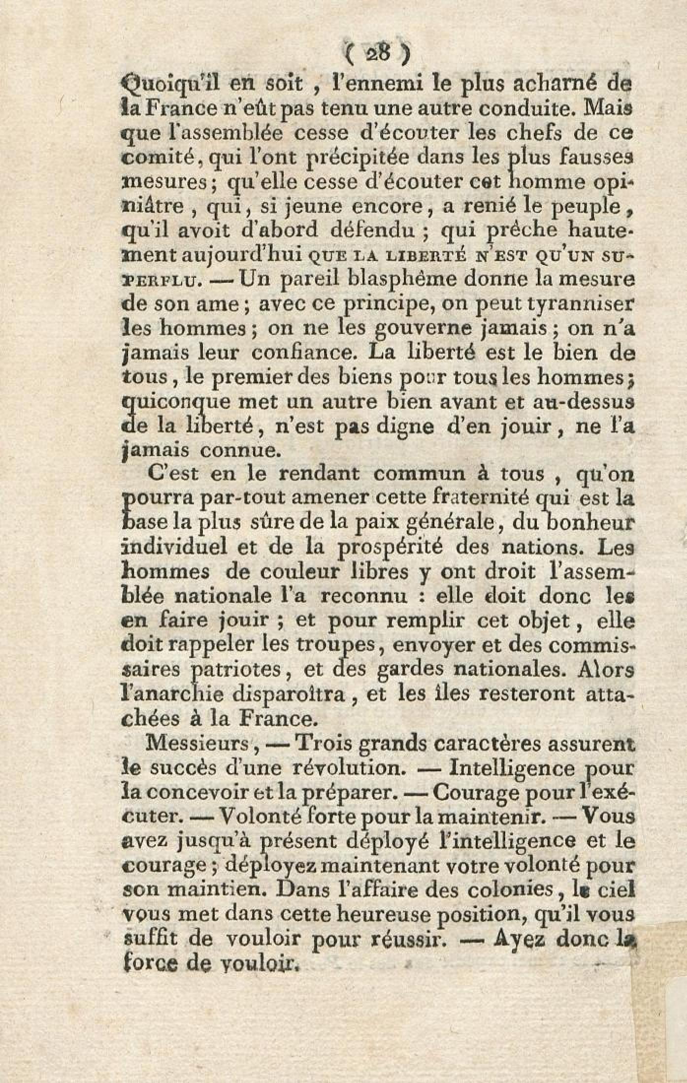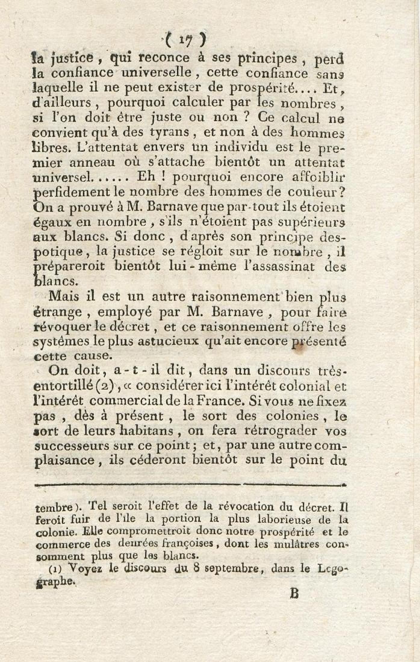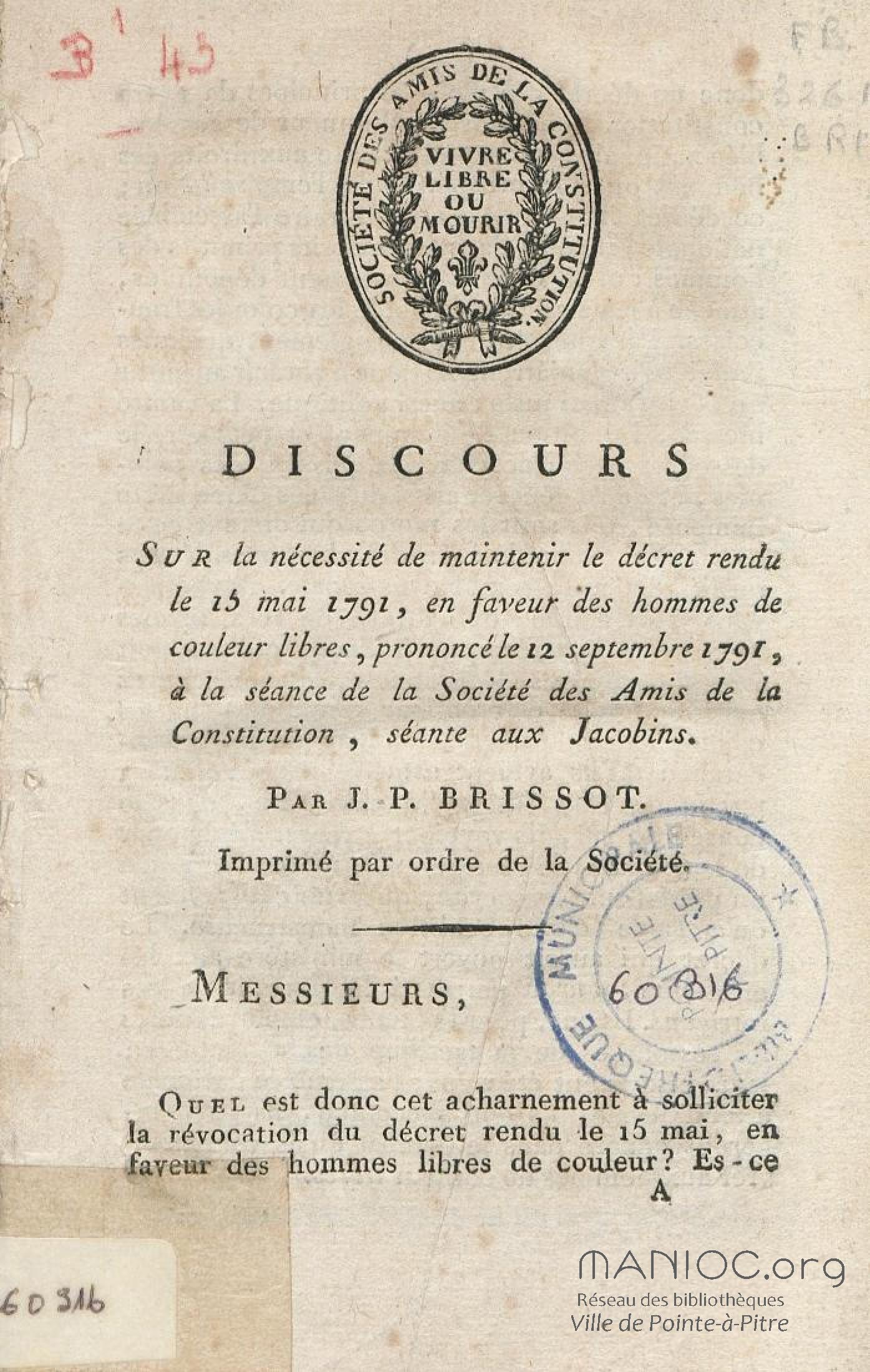 Discours sur la nécessité de maintenir le décret rendu le 13 mai 1791, en faveur des hommes de couleur libres, prononcé le 12 septembre 1791, à la séance de la Société des Amis de la Constitution, séante aux Jacobins