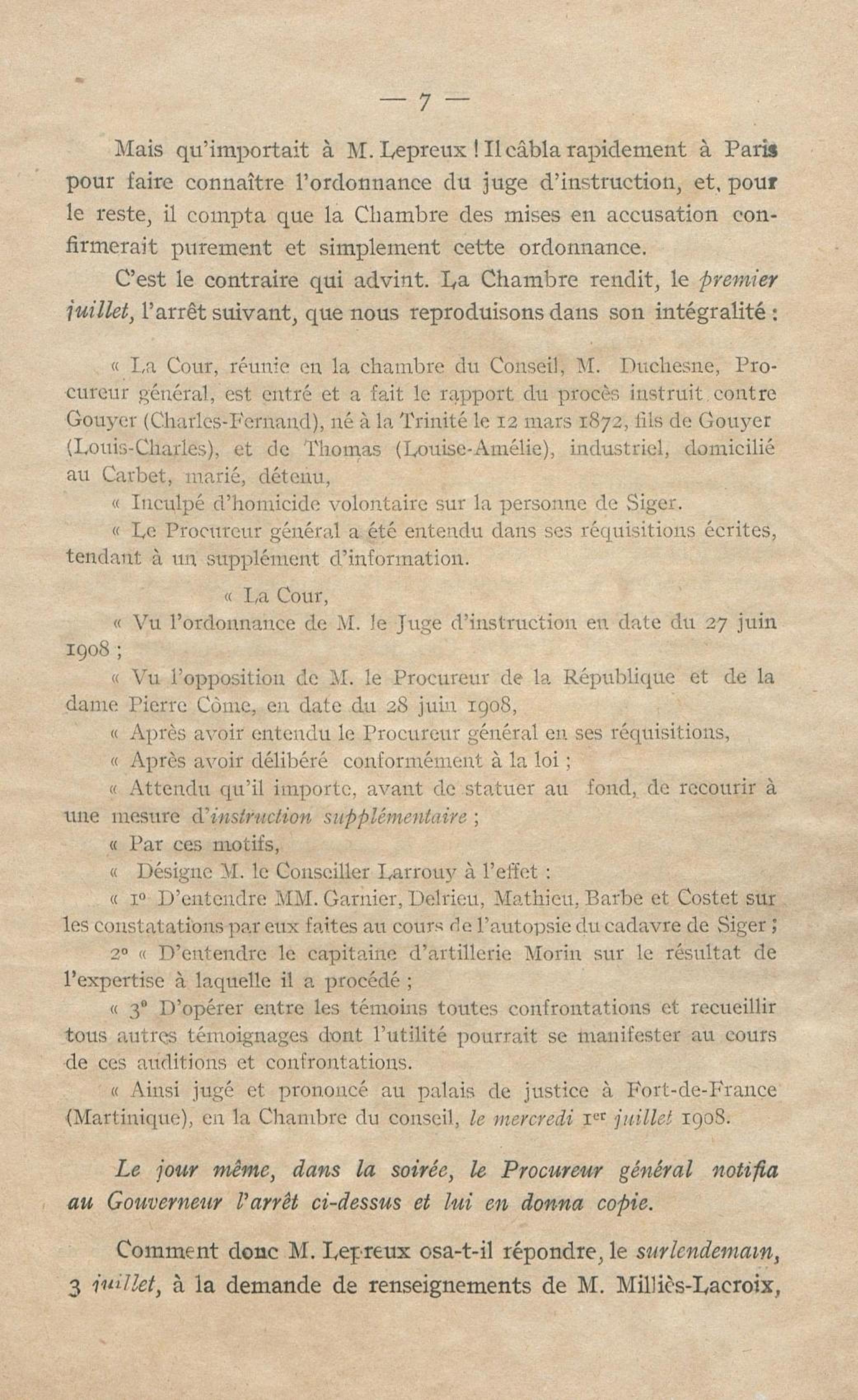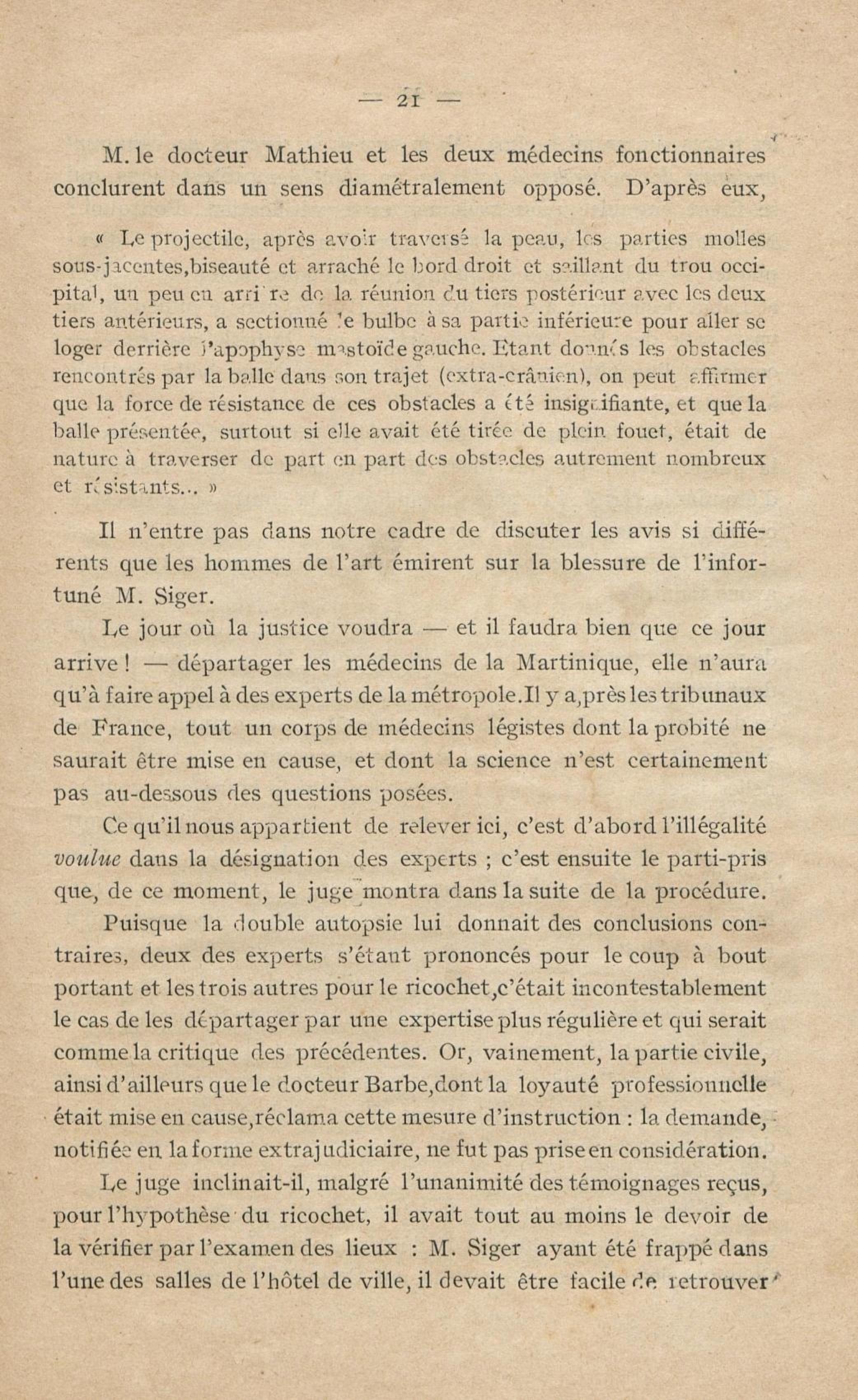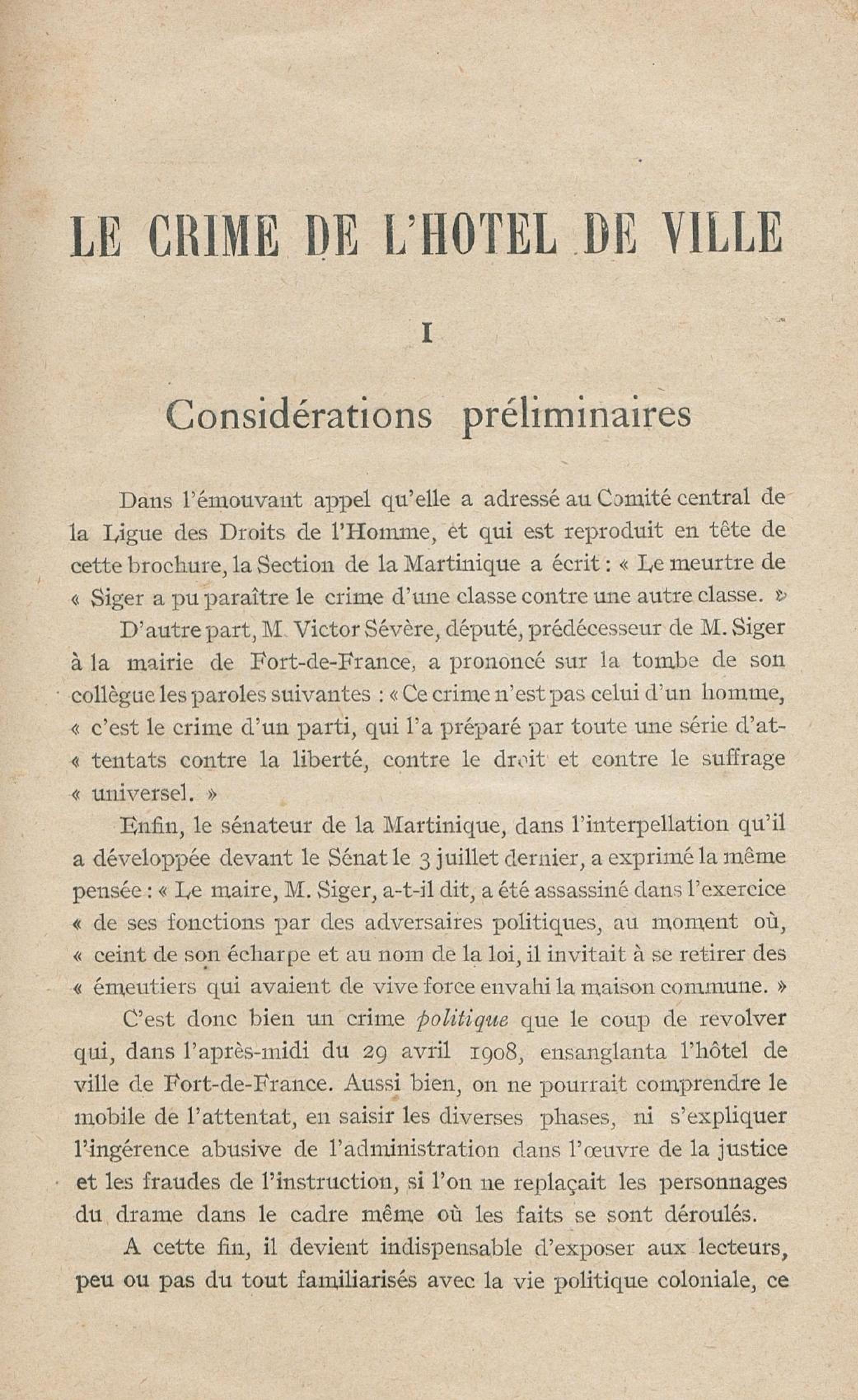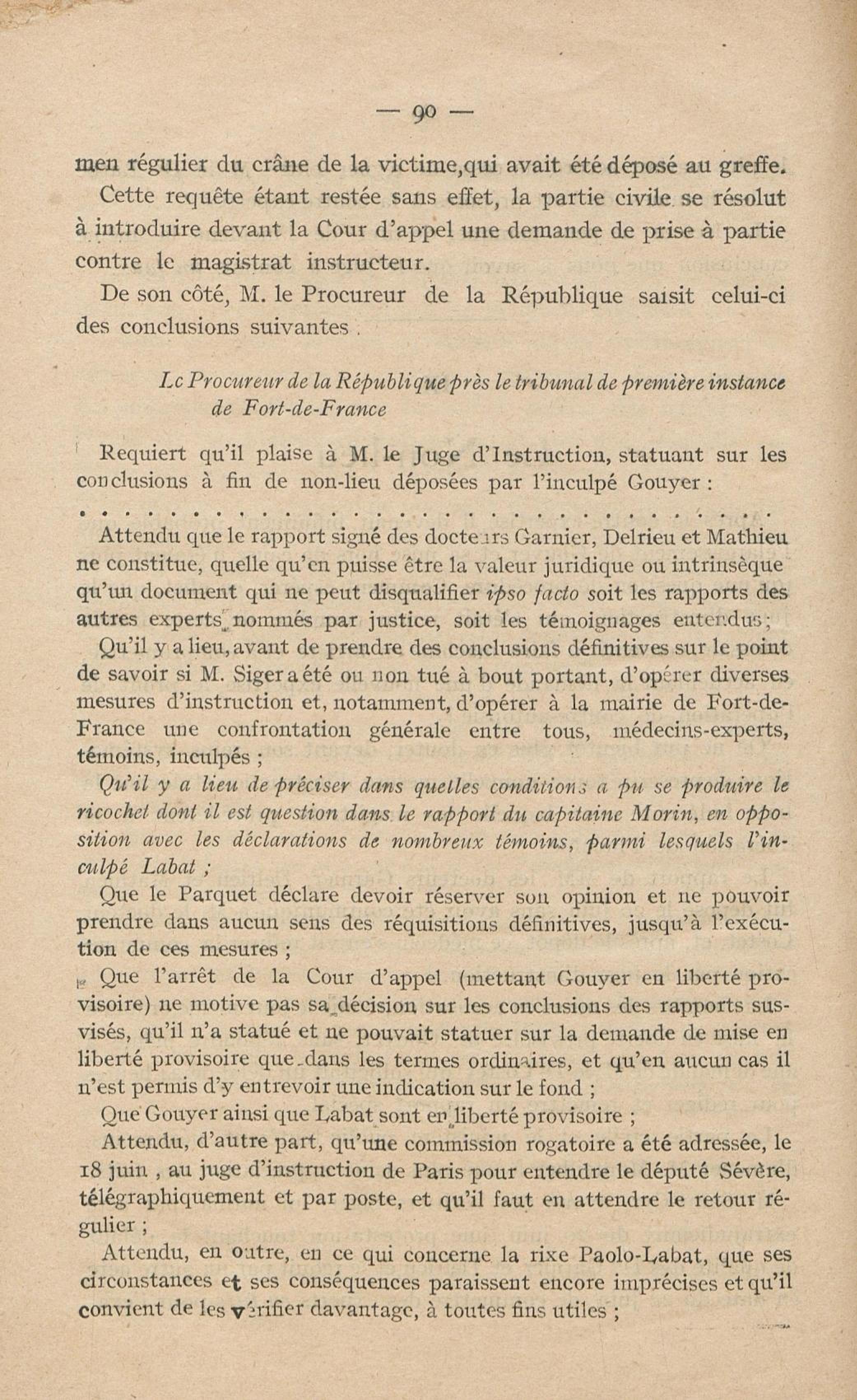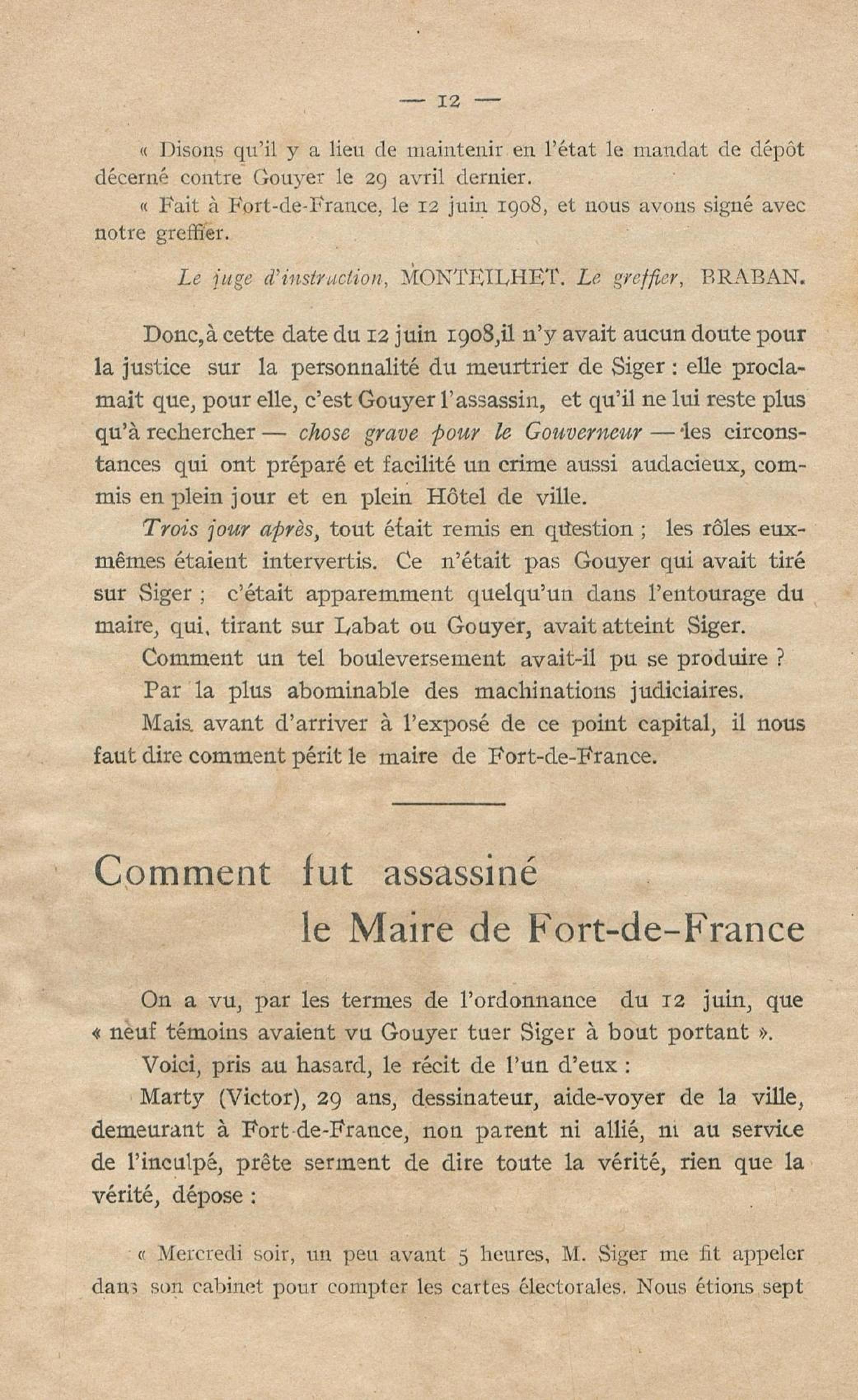Conditions dans lesquelles s'est faite l'instruction du meurtre de M. Siger, Maire de Fort-de-France