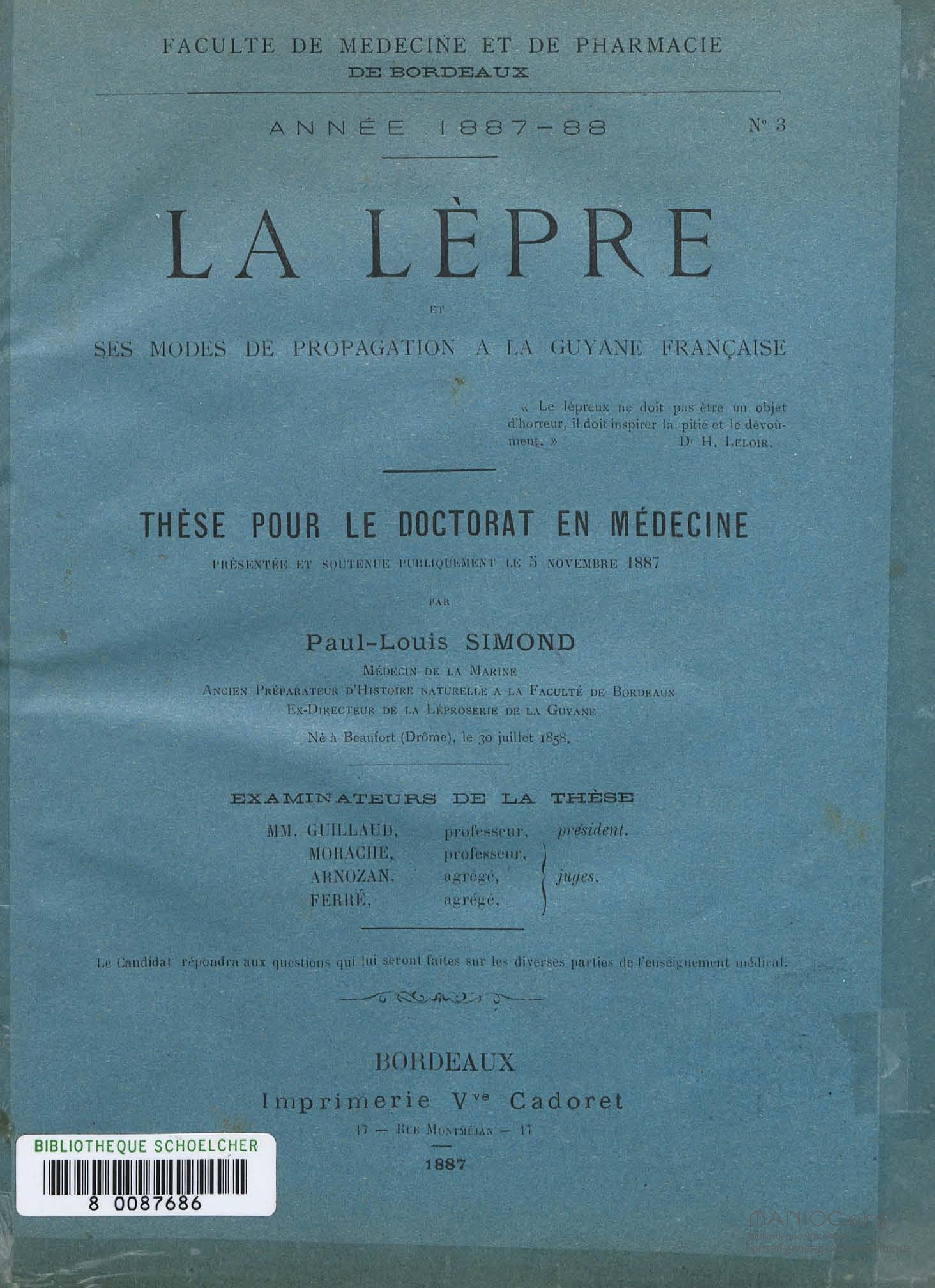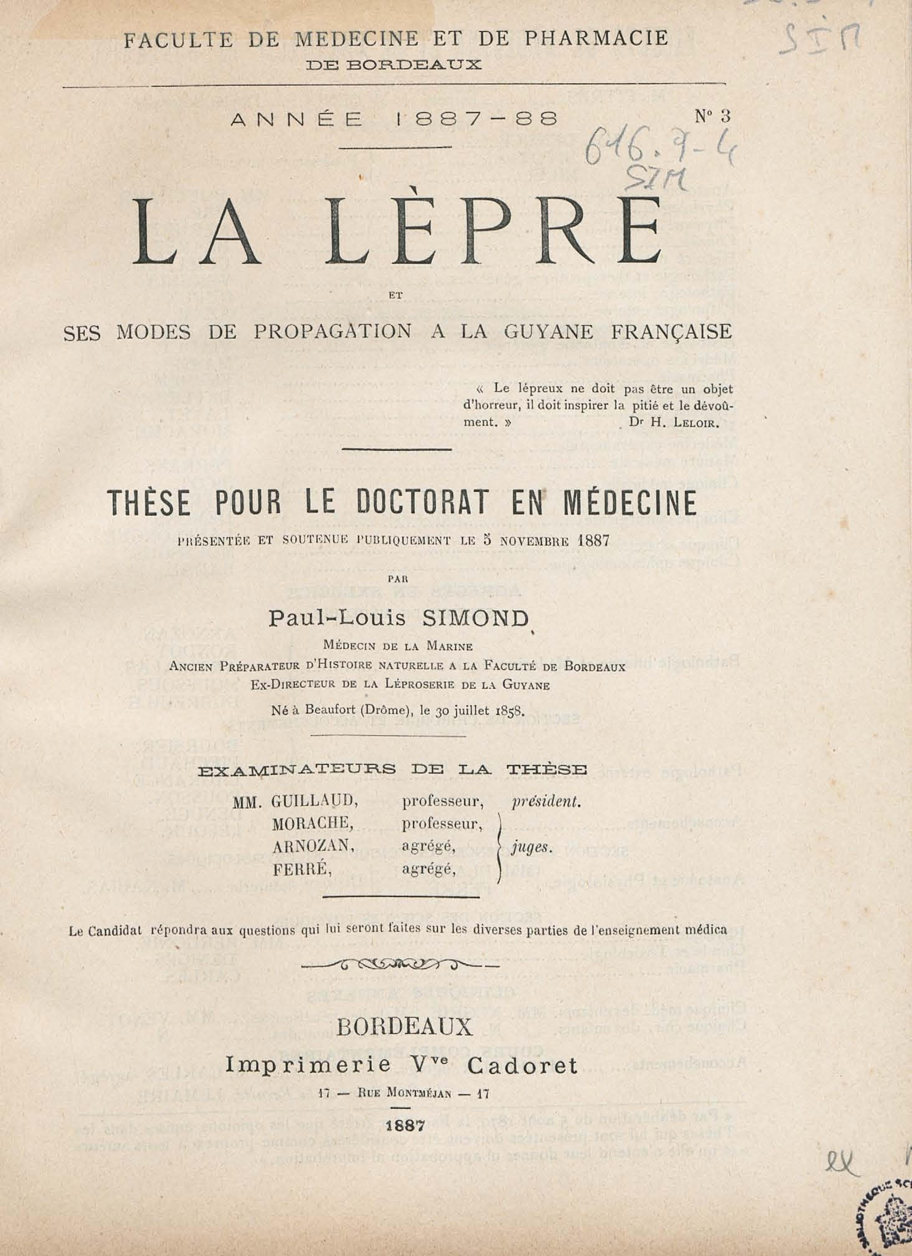 - La lèpre et ses modes de propagation à la Guyane française : thèse pour le doctorat présentée et soutenue publiquement le 3 novembre 1887