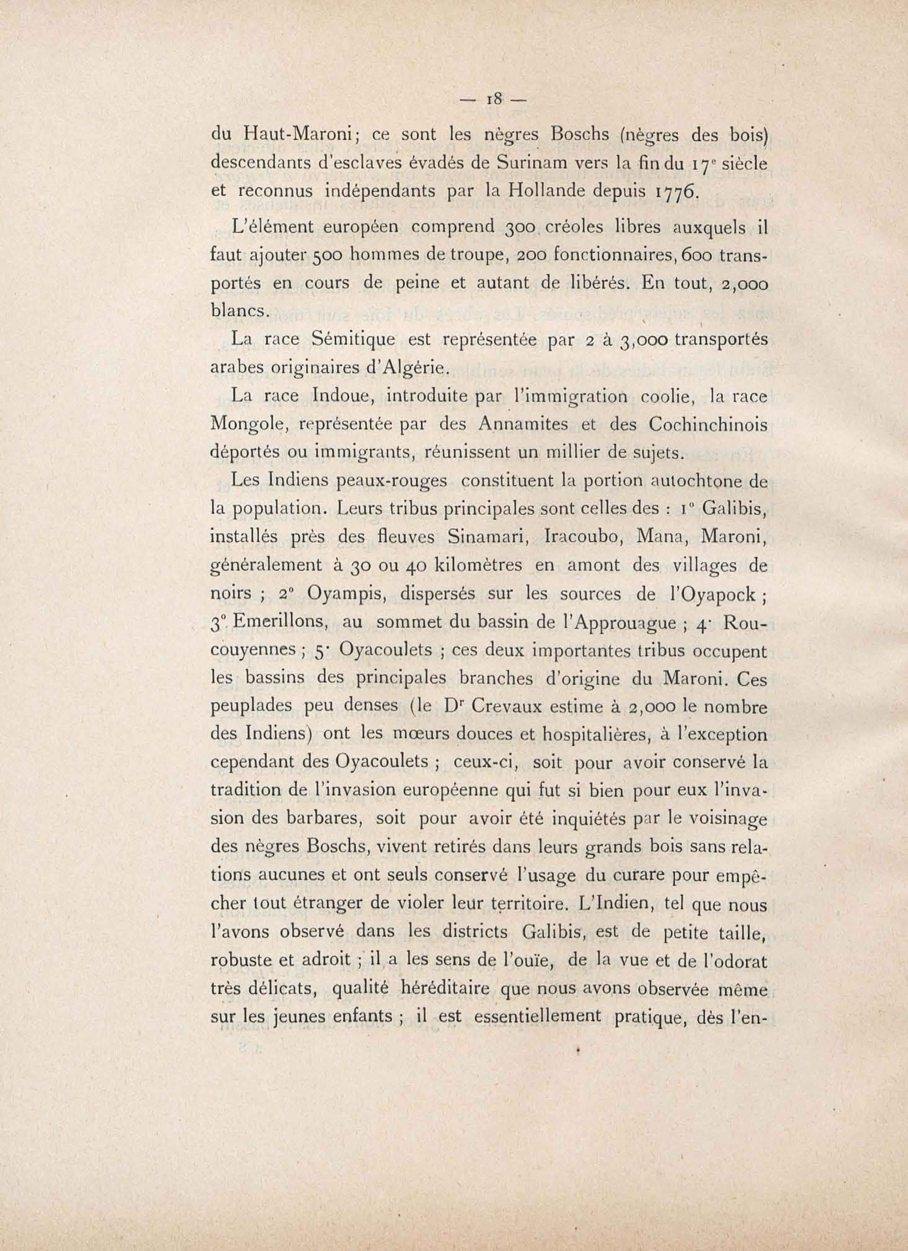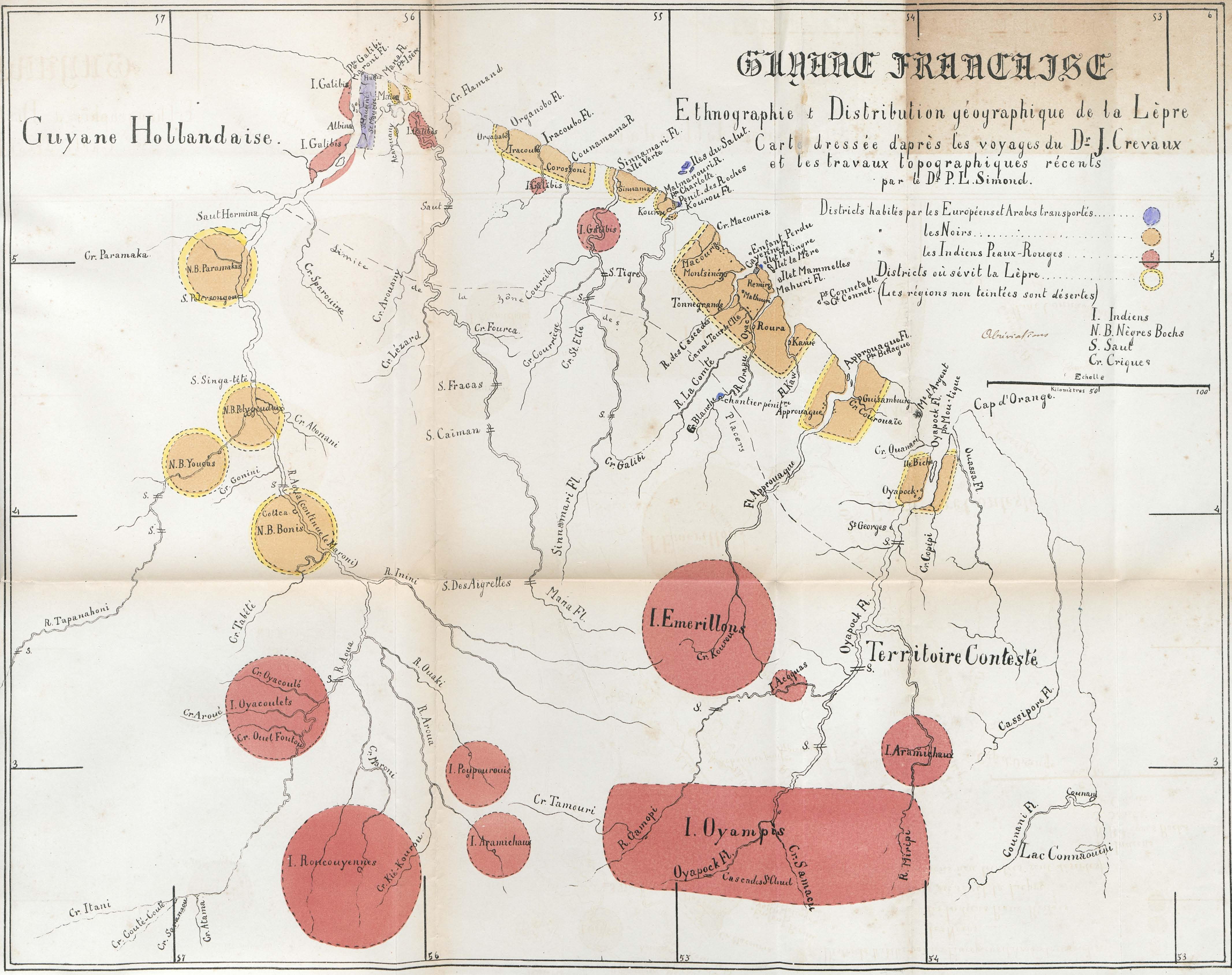 Guyane française : ethnographie et distribution géographique de la lèpre. Carte dressée d'après le voyage du Dr. J; Crevaux et les travaux topographiques récents par le Dr. P. L. Simond. |