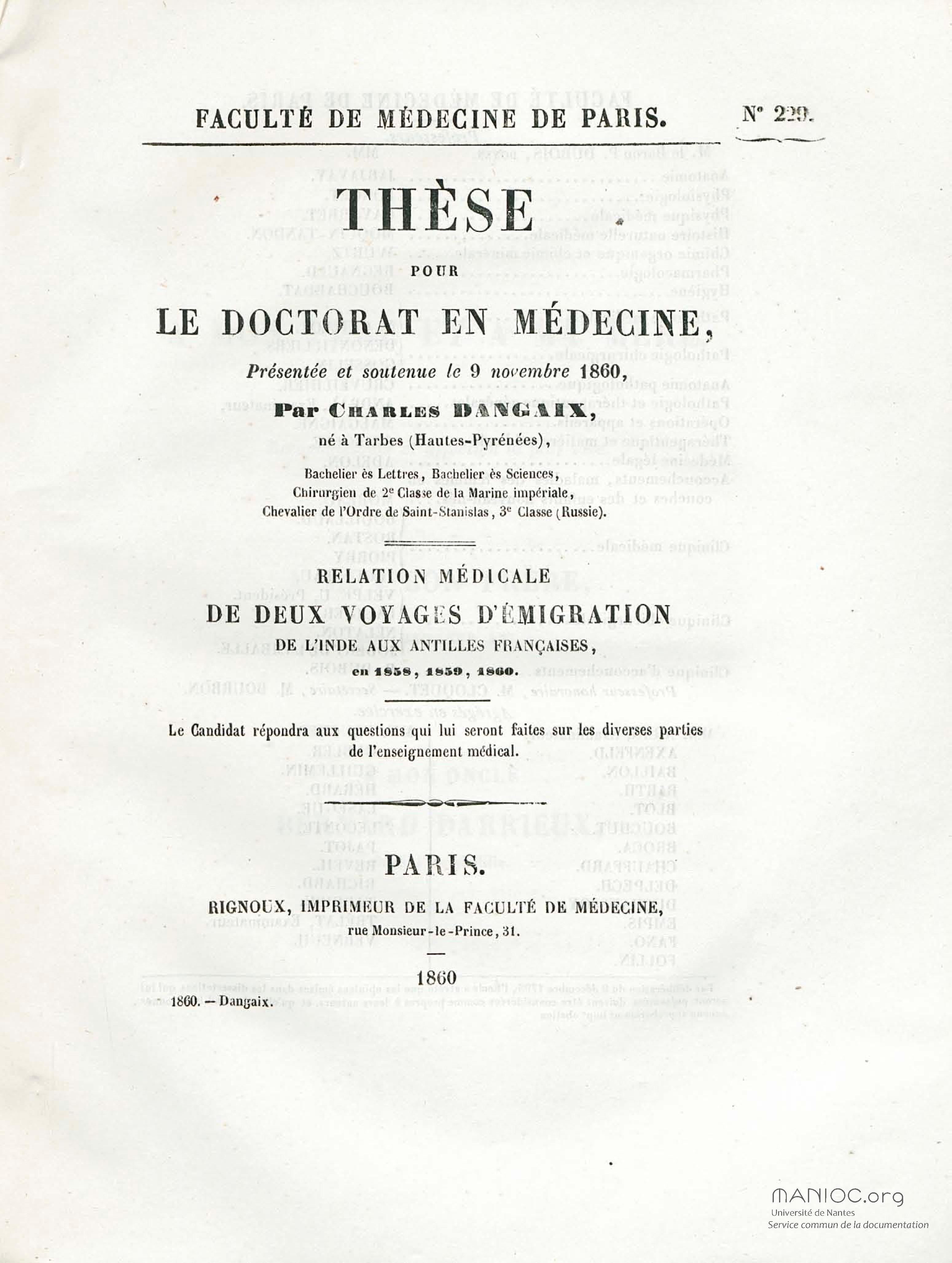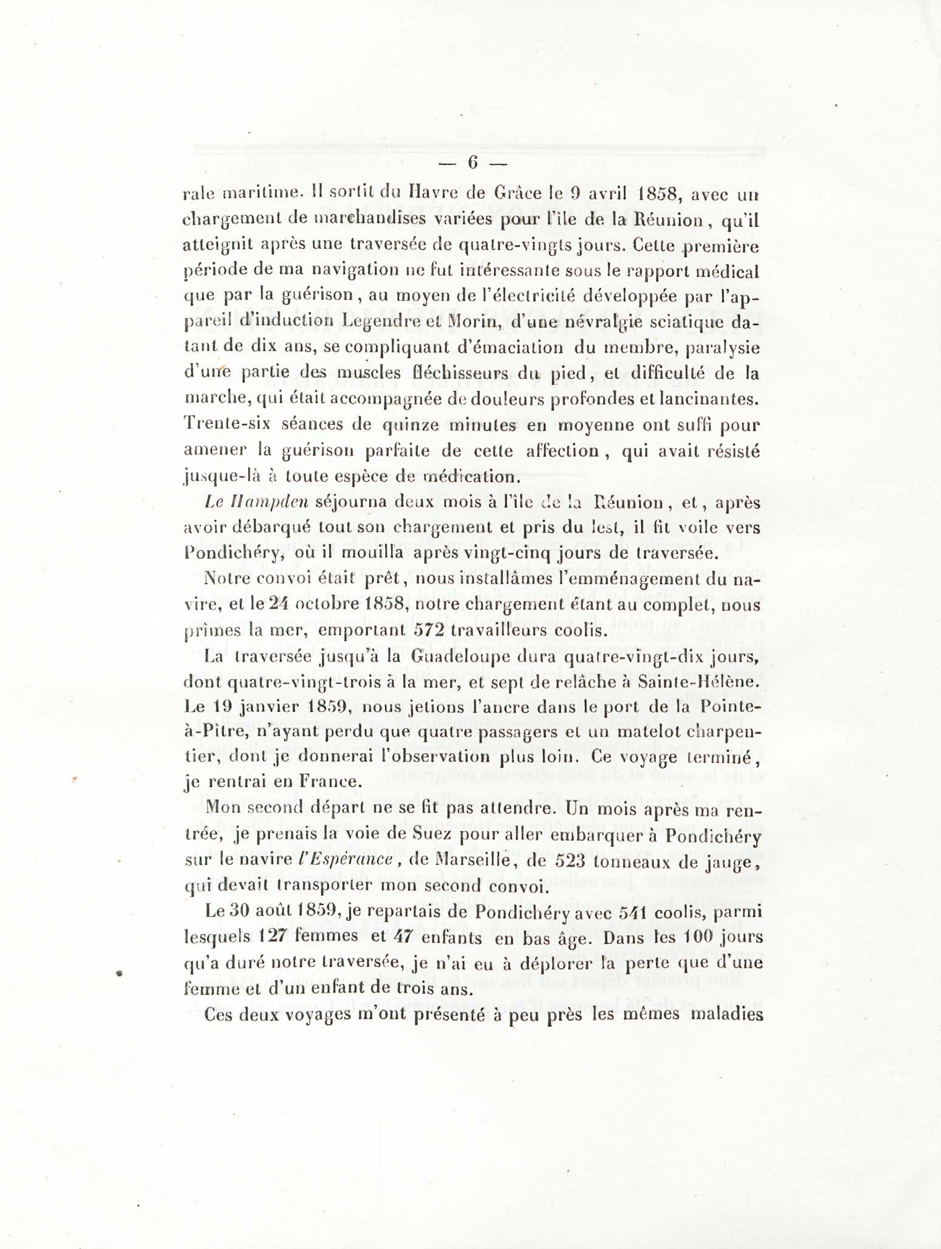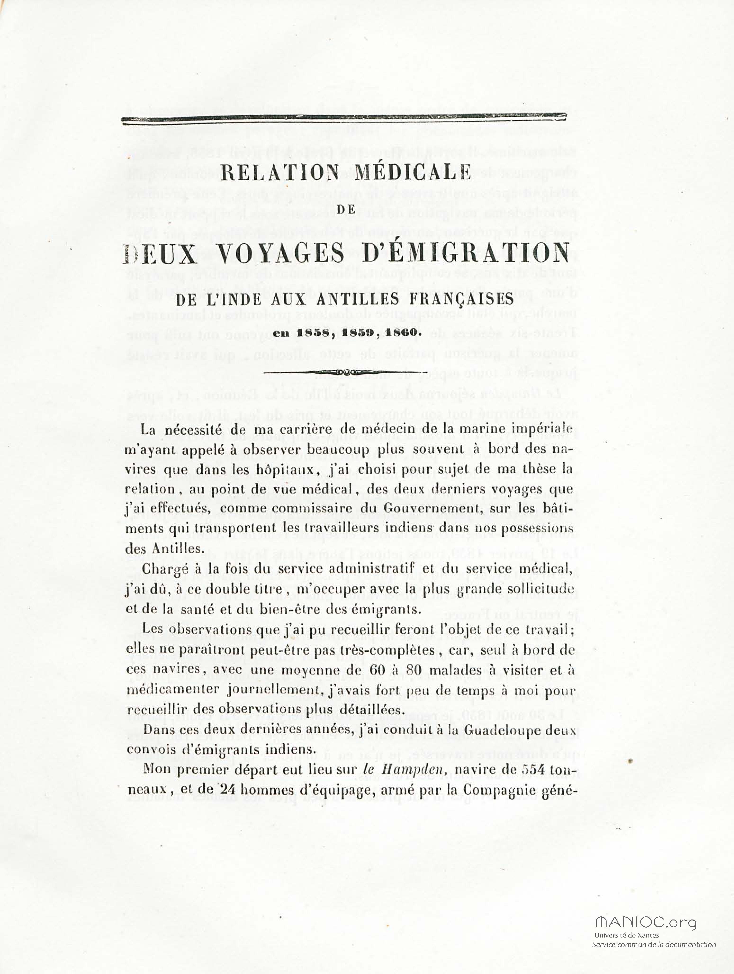 Relation médicale de deux voyages d'émigration de l'Inde aux Antilles françaises en 1858, 1859, 1860 : thèse pour le doctorat en médecine, présentée et soutenue le 9 novembre 1860