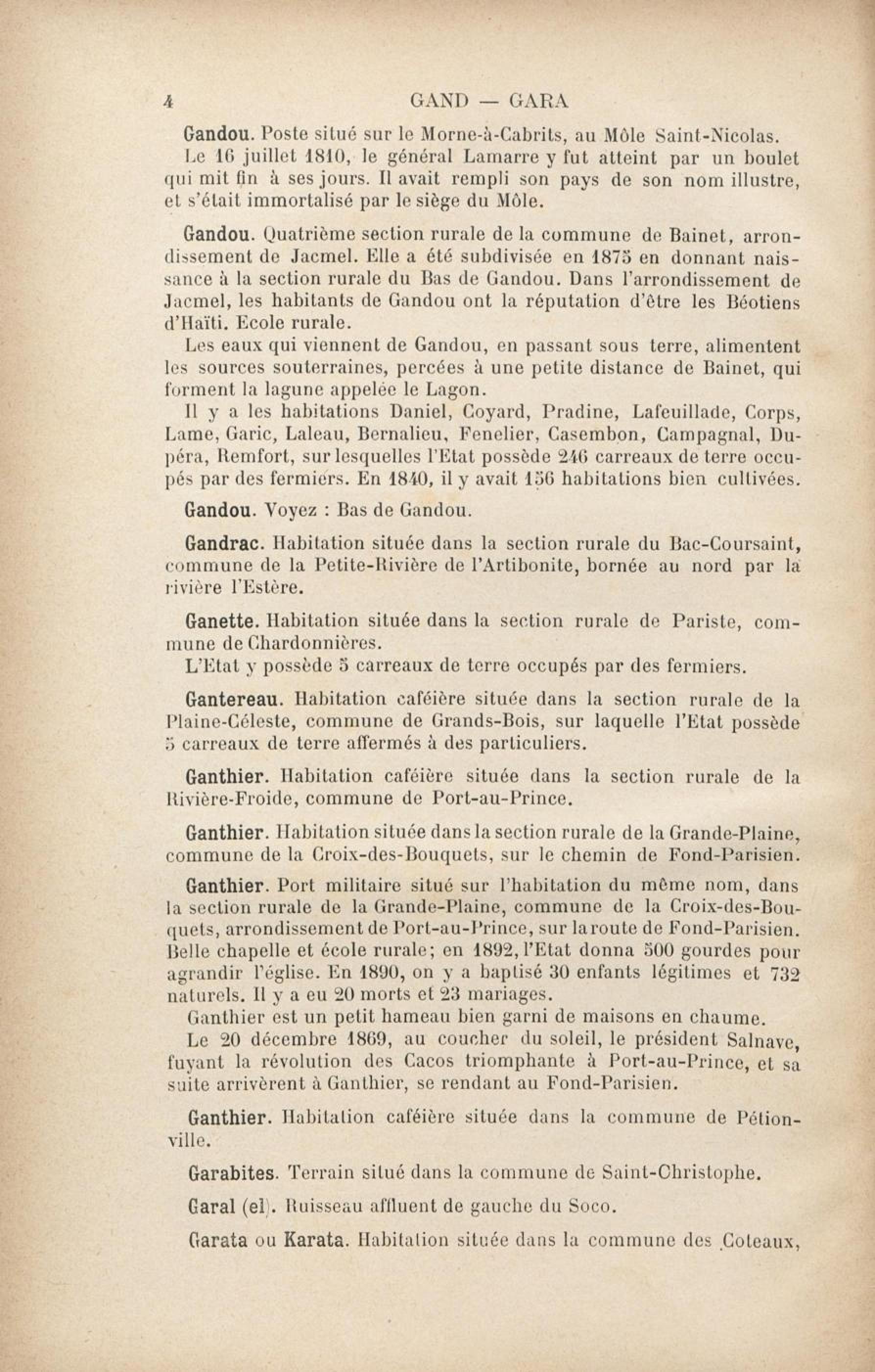 Fait partie de Dictionnaire géographique et administratif universel d'Haïti illustré... ou Guide général en Haïti : avec gravures, illustrations, plans, cartes et vues dans le texte, et une carte coloriée de l'île d'Haïti. Tome 2, G à H