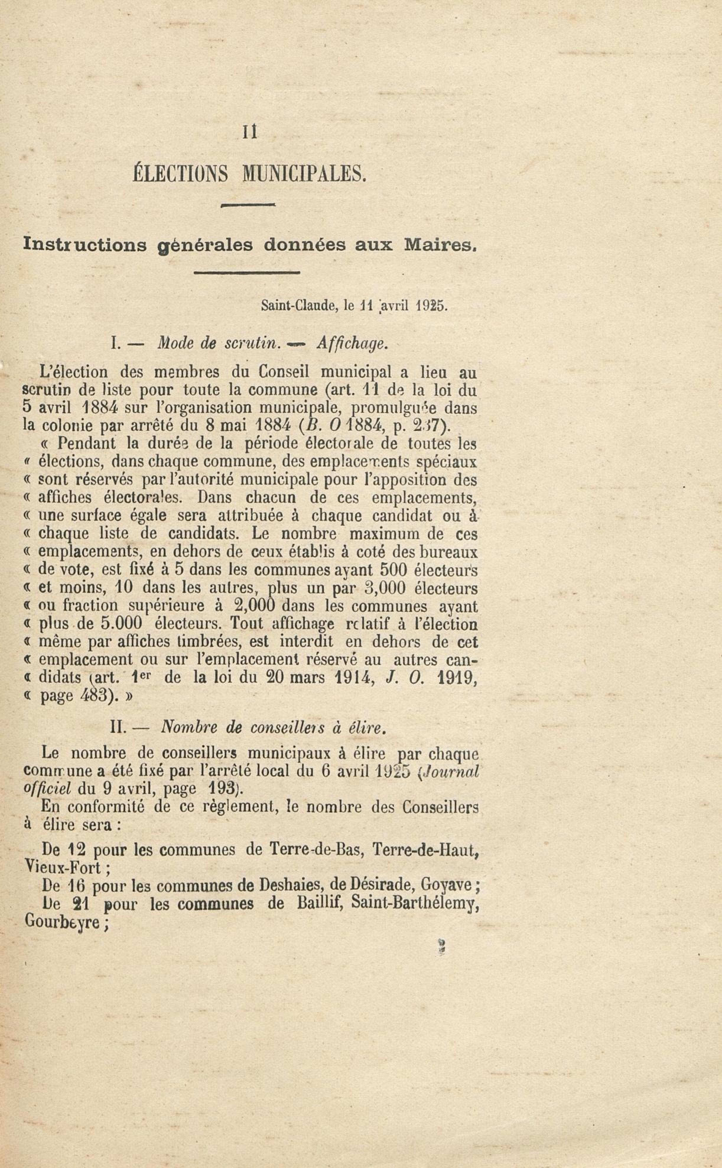 Fait partie de Gouvernement de la Guadeloupe et Dépendances. Instructions sur : 1. la révision annuelle des listes électorales ; 2. les élections municipales ; 3. les élections cantonales ; 4. les élections législatives